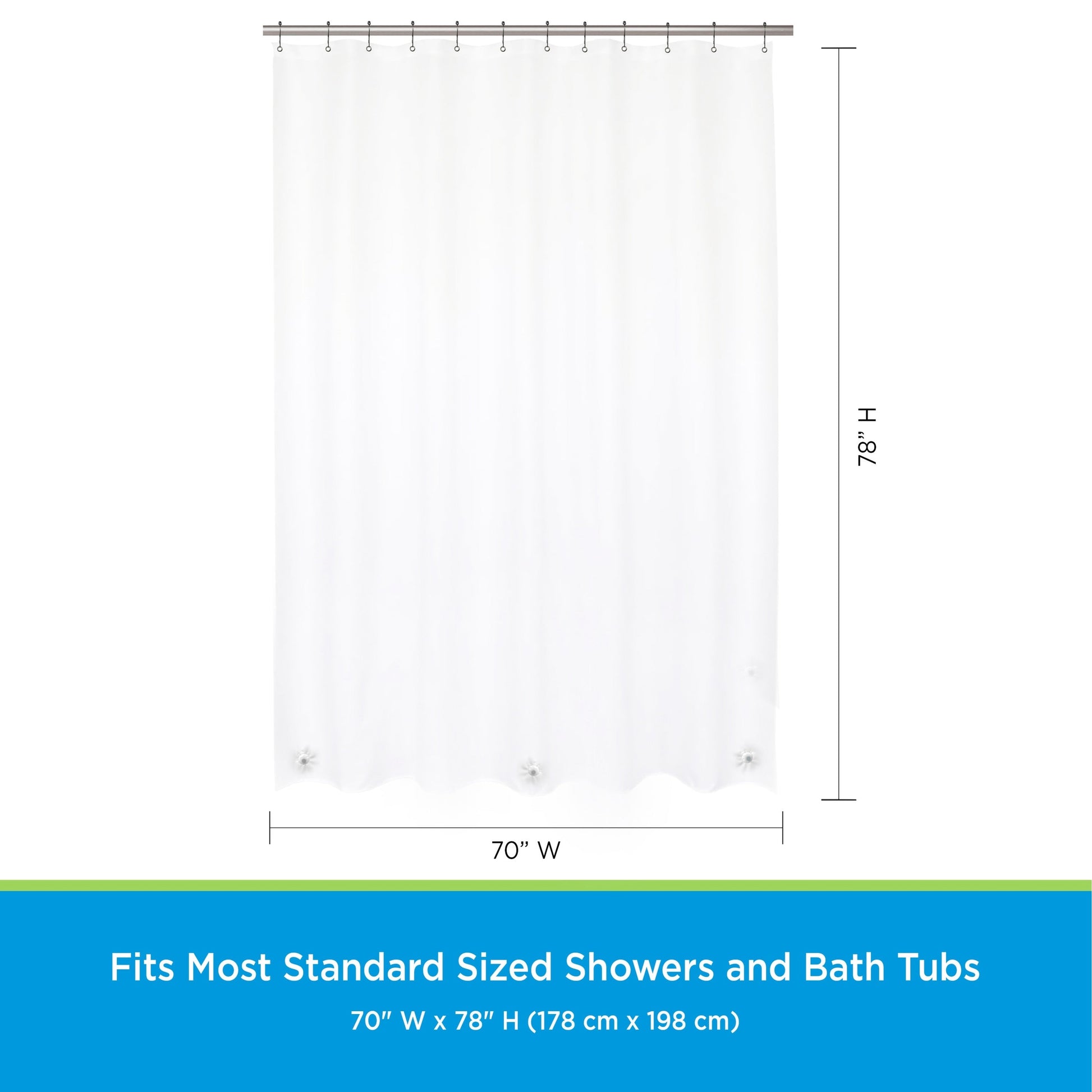 Standard sized, it measures 70 inches wide by 72 inches tall (178 cm x 183 cm) to fit most showers and bath tubs.