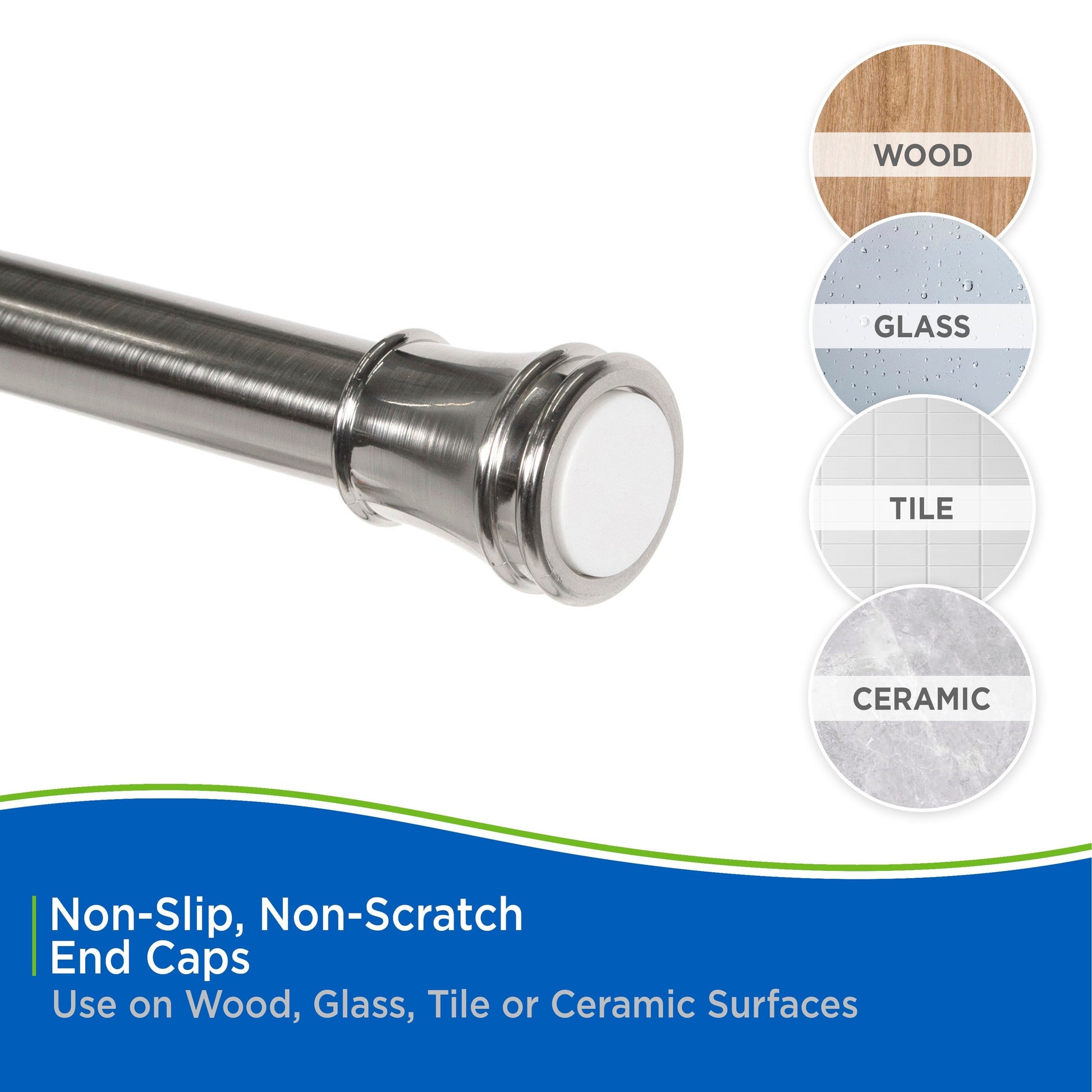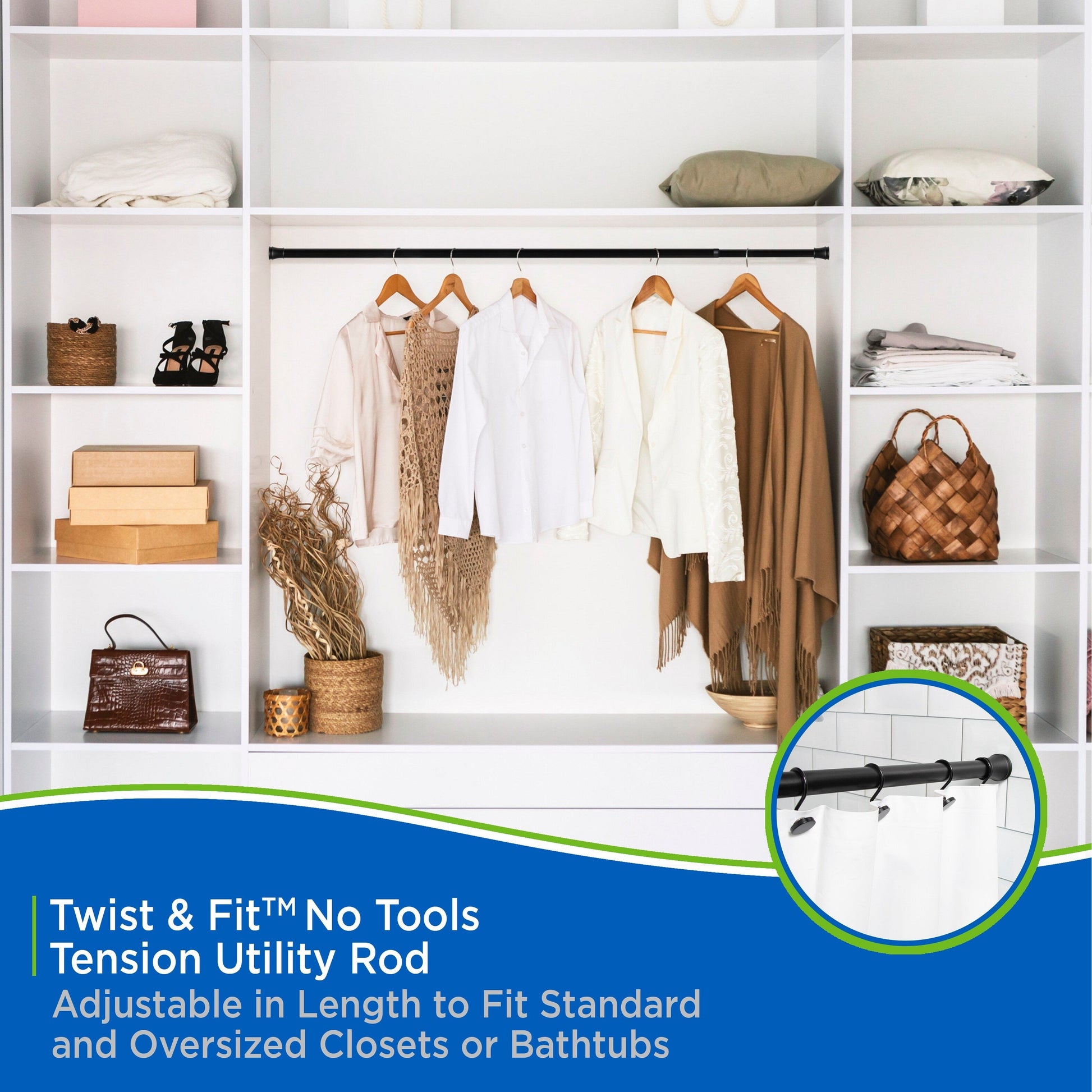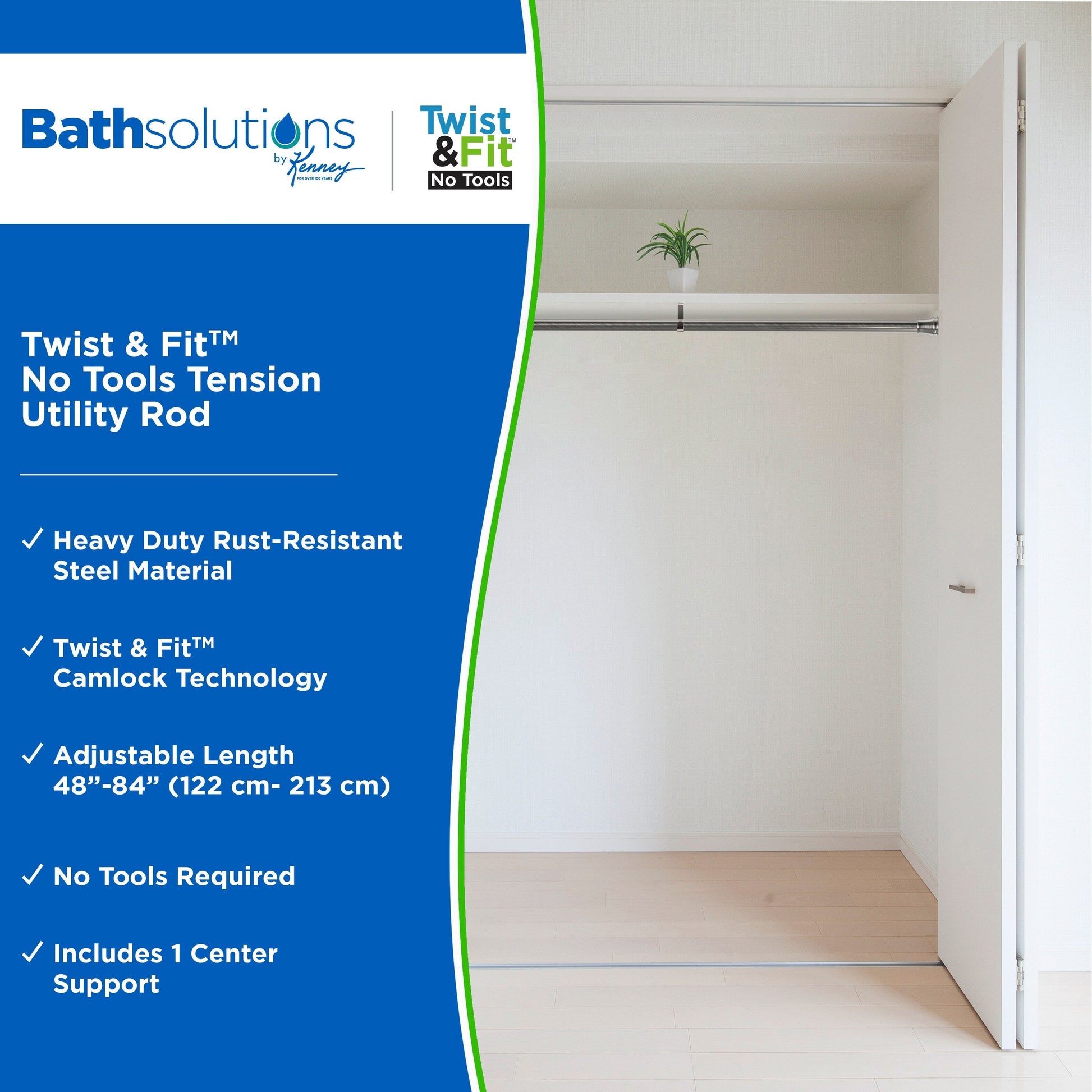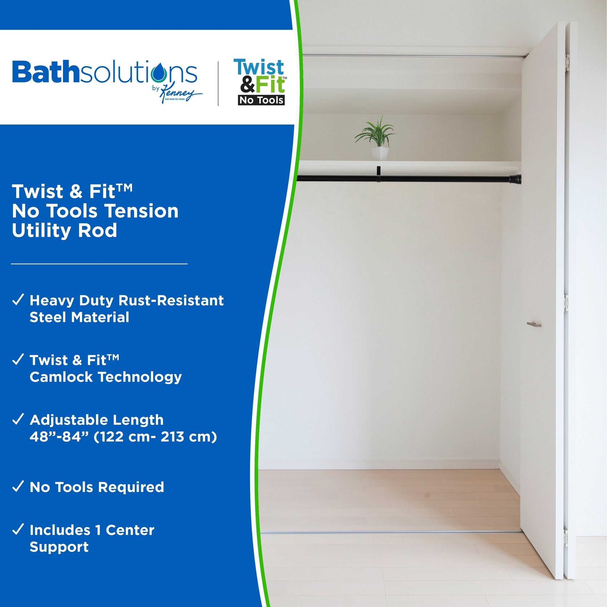 The Kenney Twist & Fit 1' Tension Utility Rod is easy to install. Use it as a shower curtain rod in standard or oversized bathtubs, or for added storage in closets, laundry rooms, and more. Made of steel, this utility rod is adjustable from 48-84 inches. The non-slip, non-scratch large finial ends mean no damage to your wall or tile, making this a good solution for all areas of your home. The large finial ends include ring locks to keep your shower curtain against the wall, preventing drafts. Twist and Fit makes installation easy. To install, extend rod at an angle against both walls, twist to secure, and level rod in place.