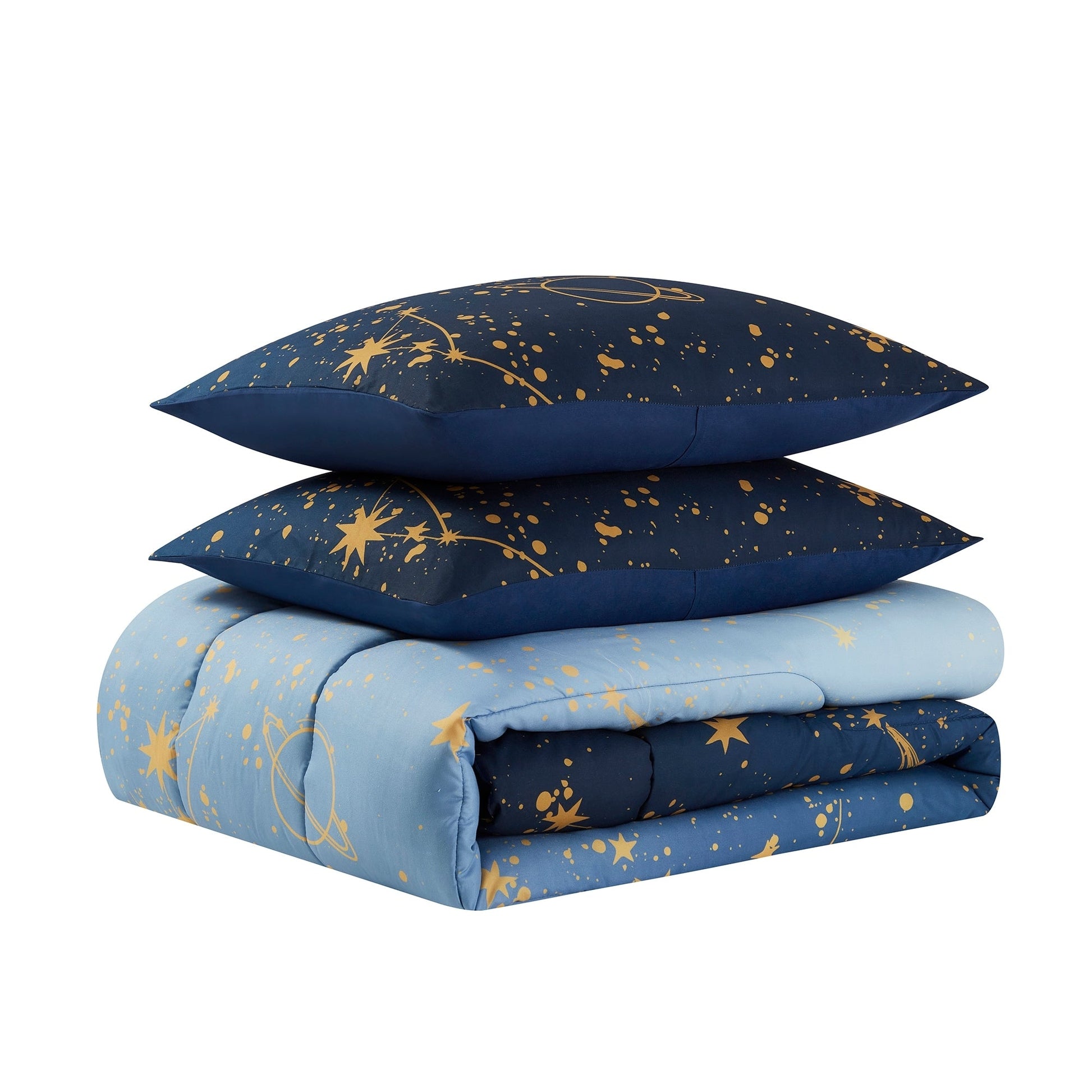 Our Galaxy Comforter and Sheet Set is out of this world! Blue fade comforter decorated with Gold colored stars, planets and constellations your little astronaut can dream about travelling to space with this 100% Polyester Microfiber & Down Alternative Comforter and Sheet set. With the set you will get a 100% Polyester Microfiber & Down Alternative Galaxy Space print comforter with matching pillow shams, and a gorgeous white print sheet set with blue and gold stars that will dress up your childs bed without breaking the bank.
