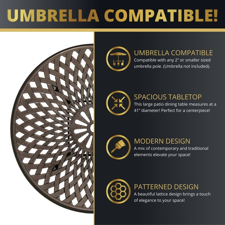 Make al fresco dining easy with the Kinger Home 5-Piece Bronze Outdoor Dining Set. Cast aluminum frames ensure long-lasting durability, while a gorgeous woven design brings a touch of elegance to your outdoor dining space. A round table provides ample space for serving dishes and drinks, while a 2.5' umbrella hole lets you add an extra element of shade. Four dining chairs fit comfortably around the table, and more outdoor seating could be added as desired. Each patio chair features a contoured seat and back for supportive comfort during extended use. Adjustable foot levelers are preinstalled on each item to help to protect your patio table set and floors as well as eliminate any wobbliness. Wipe the table and chairs clean with a damp cloth as needed for easy maintenance.