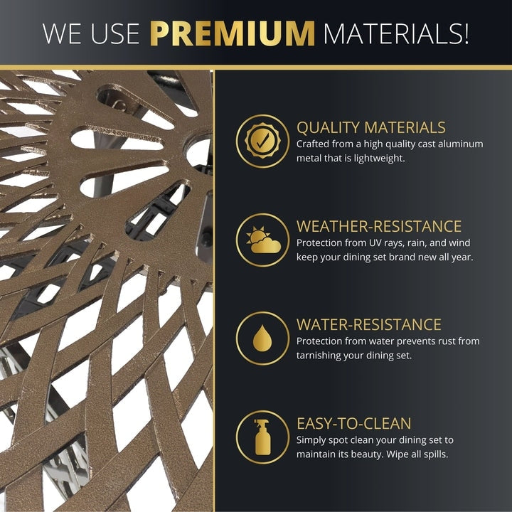 [All-Weather Resistant] Designed to be all-weather resistant, the cast aluminum patio table and chairs are a more durable alternative to wrought iron patio furniture. The patio table set features powder-coating finishes to prevent rust or fading and is durable enough to withstand rain and wind for year-round use.?