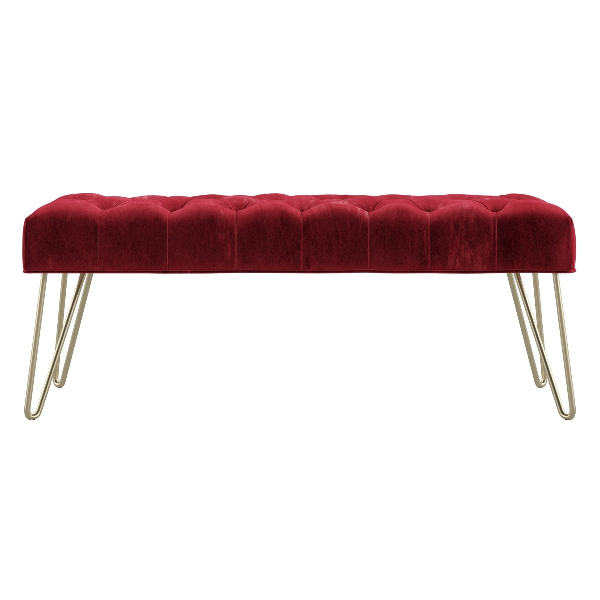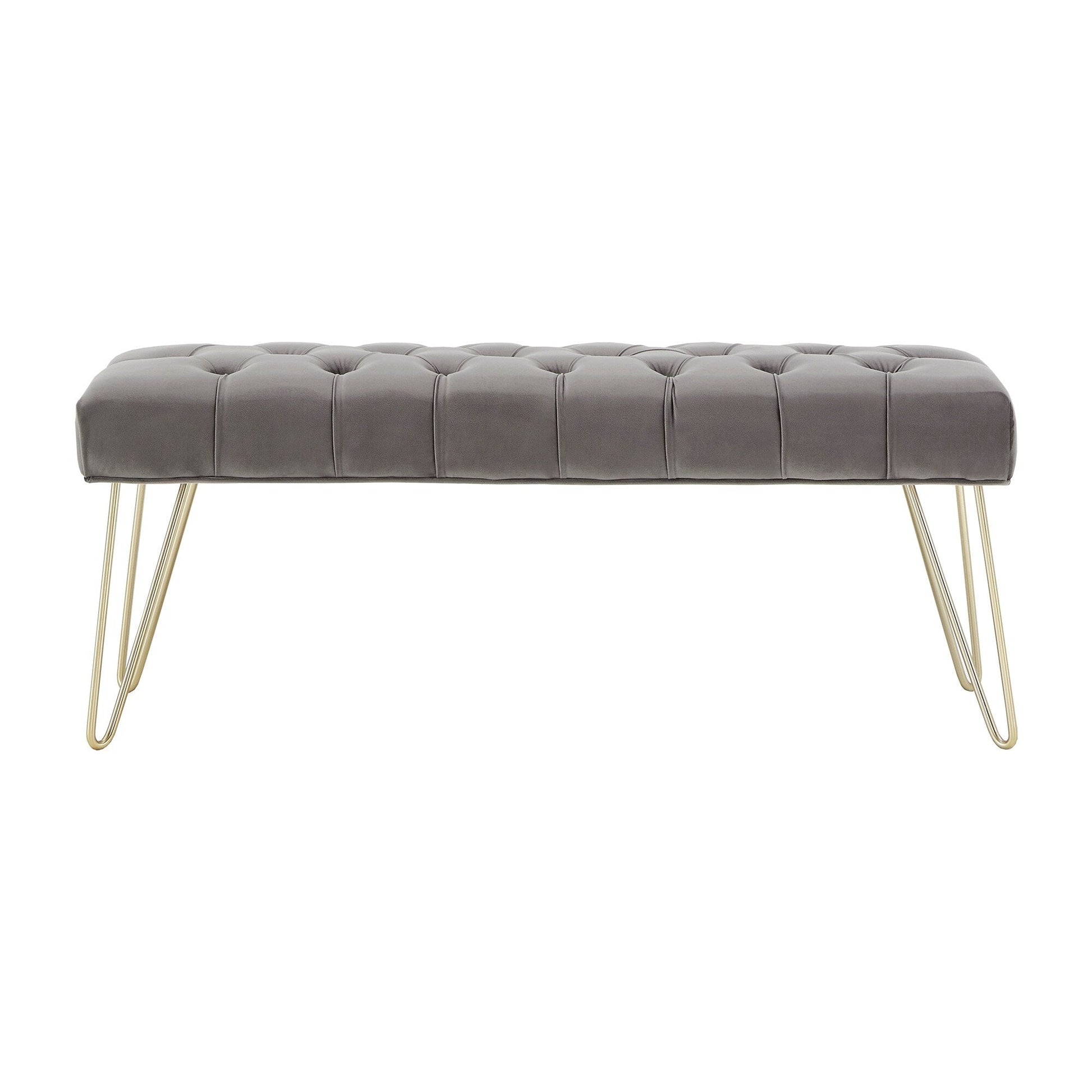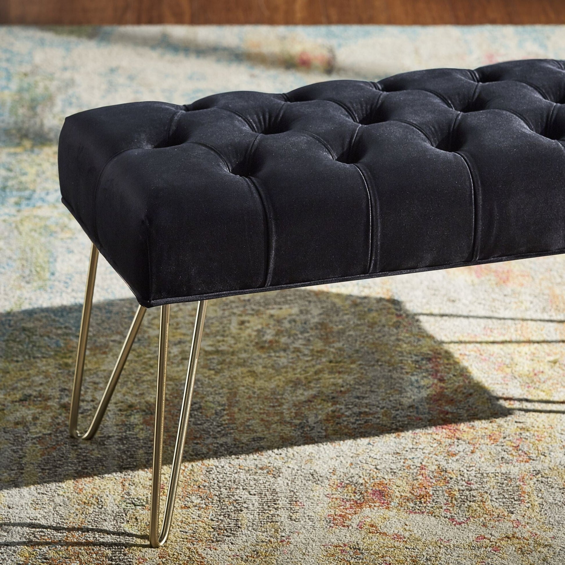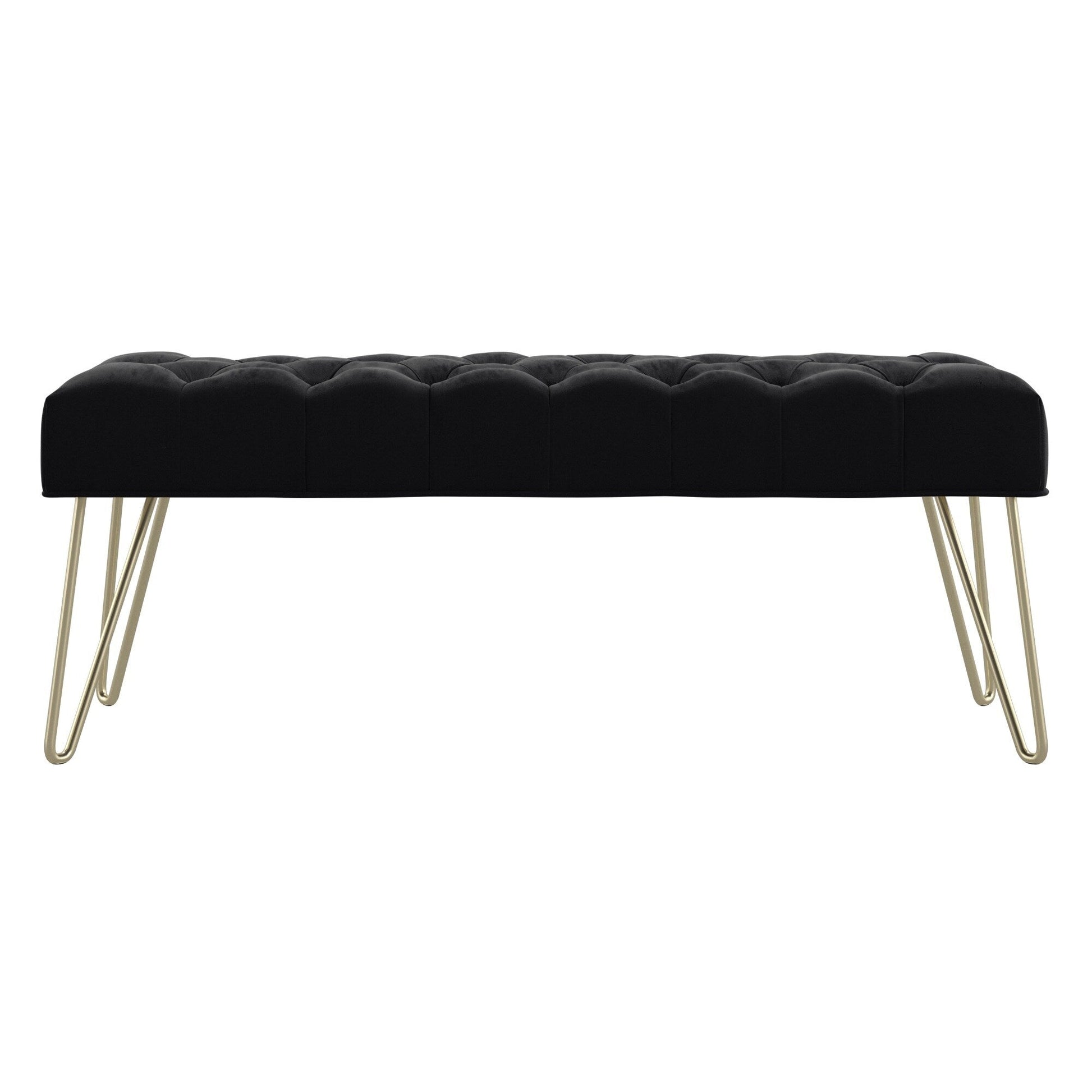 With plush and luxurious features, the Klaus velvet tufted solid or cow print bench offers your bedroom or living space a comfortable and styled seating option. Smooth and soft tufted velvet upholstery or a charmig cow print upholstery creates the ultimate comfy spot for removing shoes or for resting. The gold or black finish metal tapered legs compliment the piece beautifully and contribute to the overall glamorous appearance of the bench. Choose from multiple colors to customize your space to your liking.