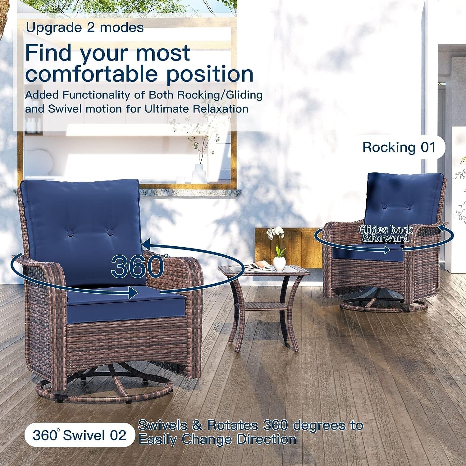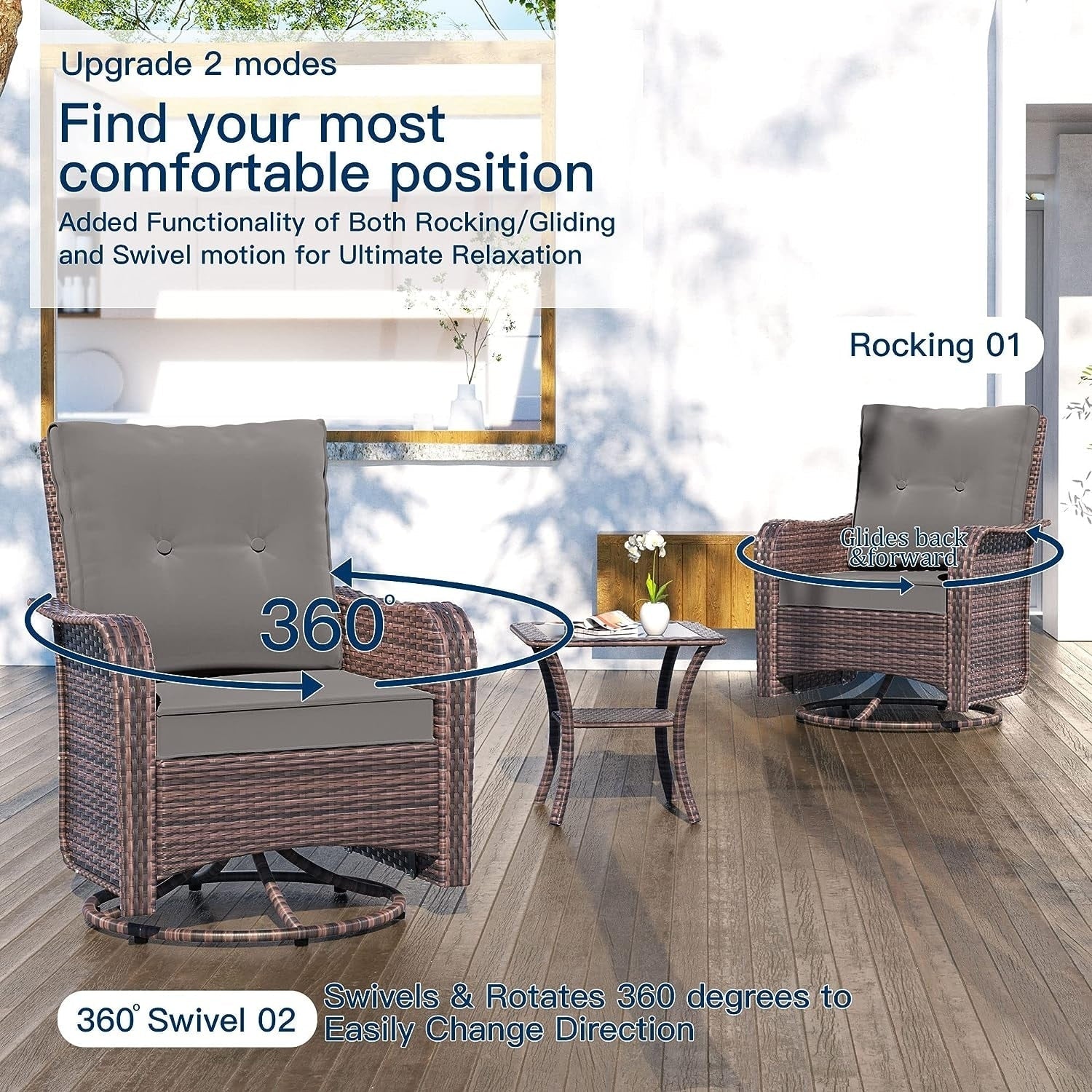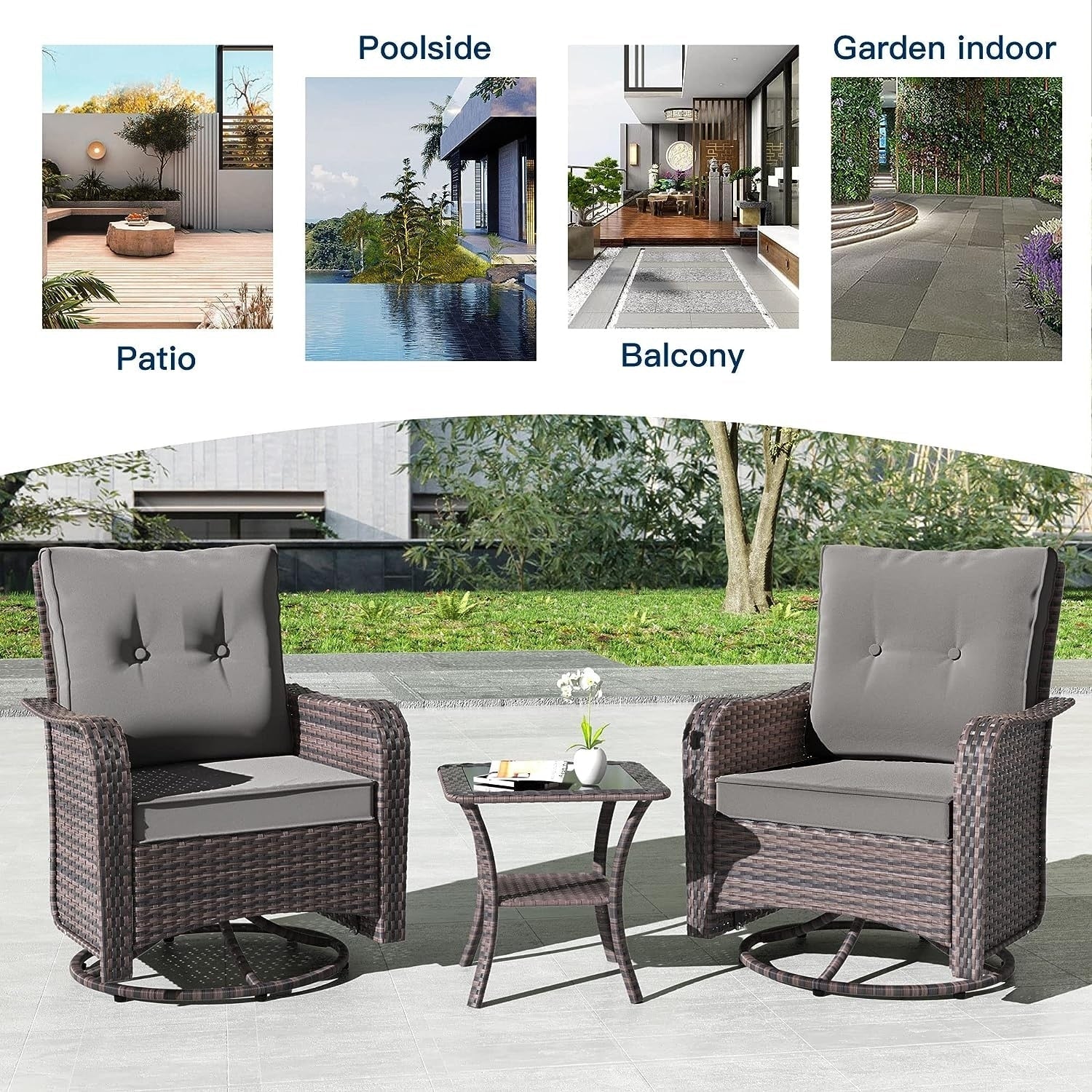 Relaxing , Enjoying, add this 3 piece patio chair bistro sets to your porch, backyard, indoor. This Swivel Rocking Chair offers front-to-back rocking and 360-degree swivel, for a fun and leisurely enjoyment with no dead ends!