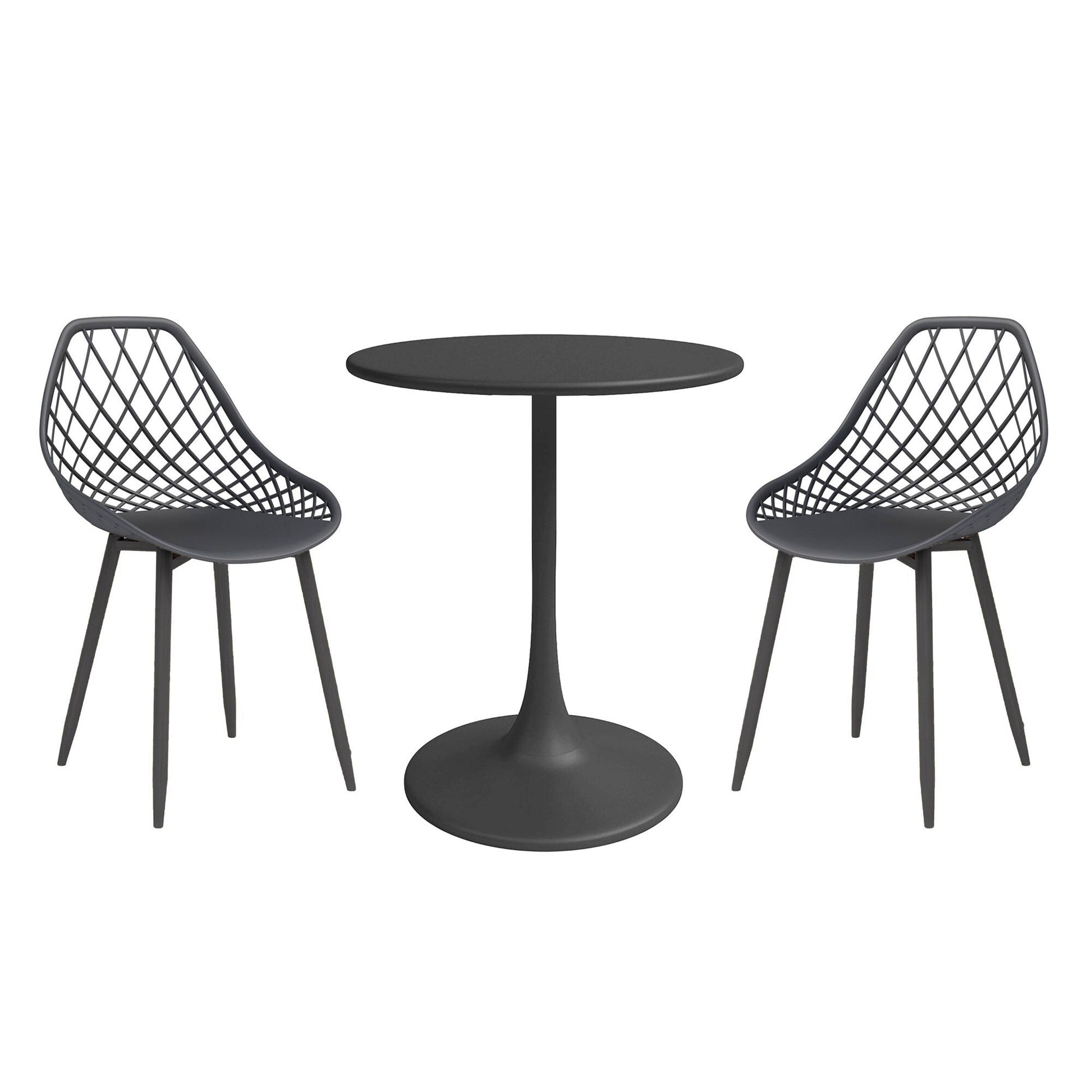 Small space living just got more chic with this KurvTM 3-Piece Bistro Set. Designed for cozier urban spaces, the set is perfect as a dining table or in a breakfast nook or patio, or instantly create a work-from-home space. The minimalist, midcentury-inspired design blends well in any setting, and can fit nicely in nooks with its steel stem-and-base design. The table features a lightly textured finish and rounded edge top and comes with a pair of Kurv Dining Chairs with the signature cross-hatch design. The contoured shape of the chairs is ergonomically designed for comfort as well as style. All surfaces are easy to clean and the set is weatherproof. The table measures 24'D x 29.5'H, the chair measures 18.7'W x 32.5'H, and the seat is 18'H. Minor assembly is required.