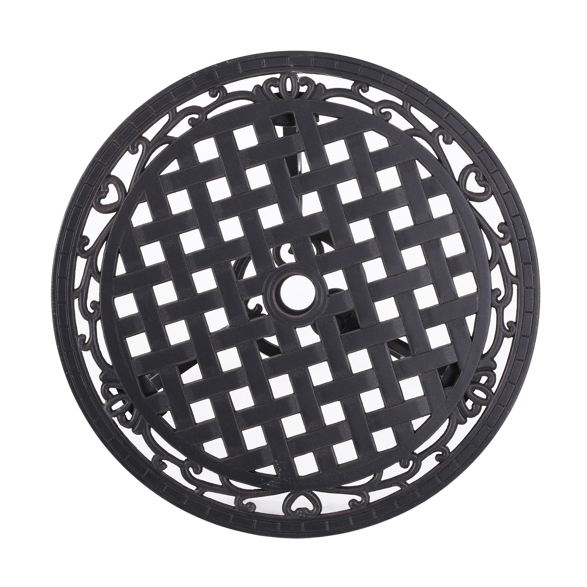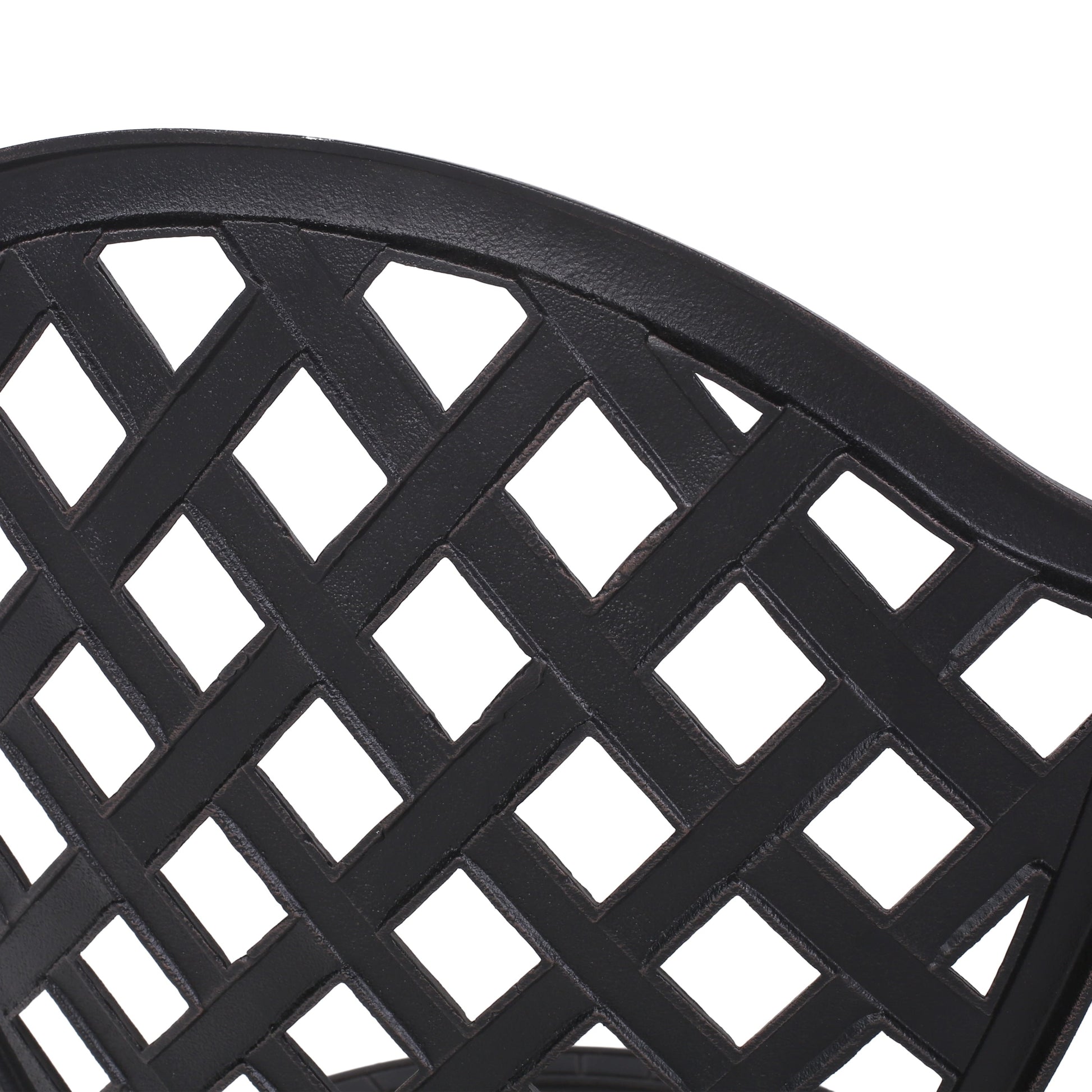 Add some flair to your patio with this lattice patterned bistro set that offers a timeless yet modern look to your outdoor space. Perfect for your backyard or patio, our bistro set gives you a place to sit outside and enjoy the weather with your favorite book. This set features beautifully curved frames, modern cabriole legs, and is completed with a matching circular table. Crafted from cast aluminum, this lovely set not only brings your space an upgraded look but is also made to last.