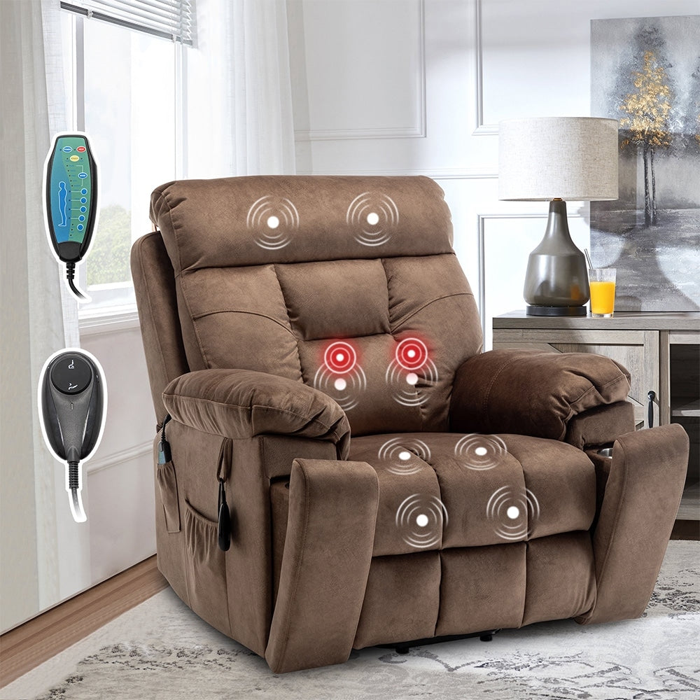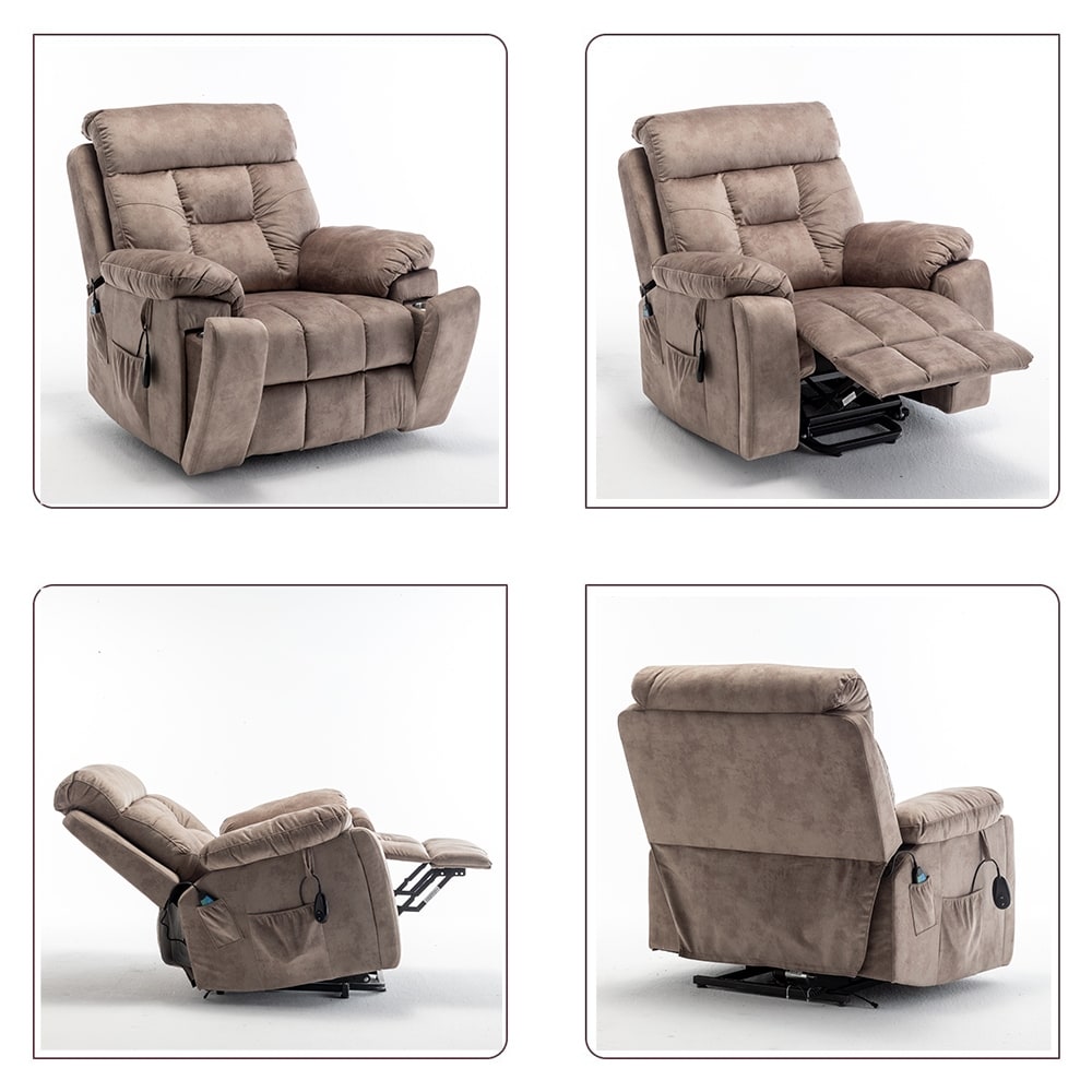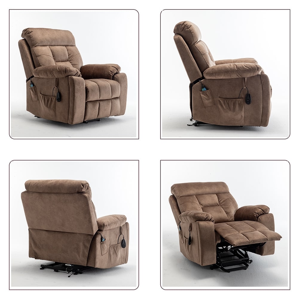 Our large and wide seat power lift chairs with massage and heat are sturdy to support an older individual with a capacity of 330lbs and easy to operate by a person with various daily living obstacles. The sturdy corner-blocked frame brings you a steel-reinforced seat, provides a very comfortable sitting feel, and enhances safety. What's more, the frame of the power lift recliner consisting of sturdy hardwood is built to last for long-term use. This is a power lift recliner with massage and heating functions, with side bags, suitable for the elderly. The heating function is located at the waist of the chair. After the heating function is turned on for about 5 minutes, you can feel the heat. For safety reasons, we control the heating temperature at 38 Degrees, so it may not be particularly obvious.