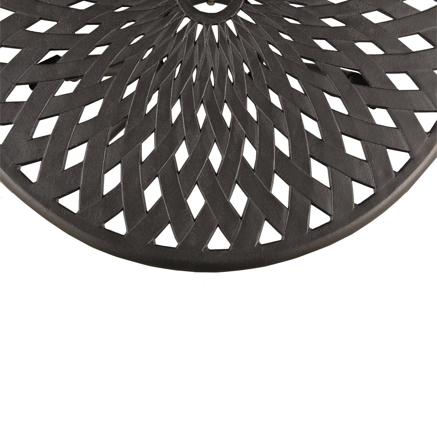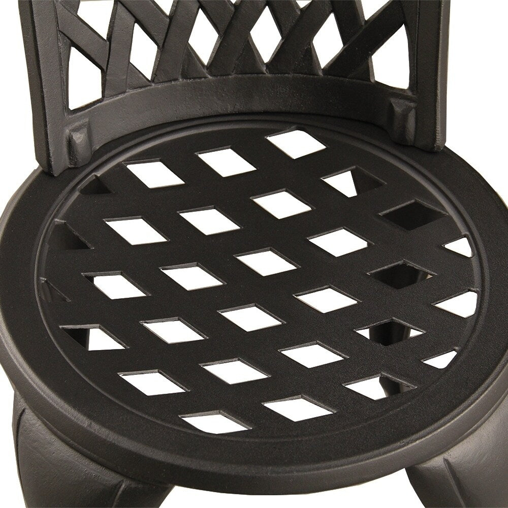 Enhance the beauty of your deck, porch, walkway, garden, balcony or patio with this handcrafted aluminum modern contemporary bistro patio set in black. This quality patio bistro chat set is ideal for outdoor or indoor entertaining and is designed to maintain their beauty for years to come. Each piece is covered with a textured black weather-resistant powder coated finish that also resists chipping, scratching, scuffing, and fading. Quality bolt and screws, simple design making this bistro set easy to put together and stay stable. The lattice and mesh designs will compliment any modern or contemporary outdoor or indoor setup. Set includes a table and two chairs; Each Aluminum Contemporary Modern Bistro Chair 18' L x 17' W x 36' H inches, Aluminum Contemporary Modern Bistro Table: 26'L x 26'W x 26' H inches
