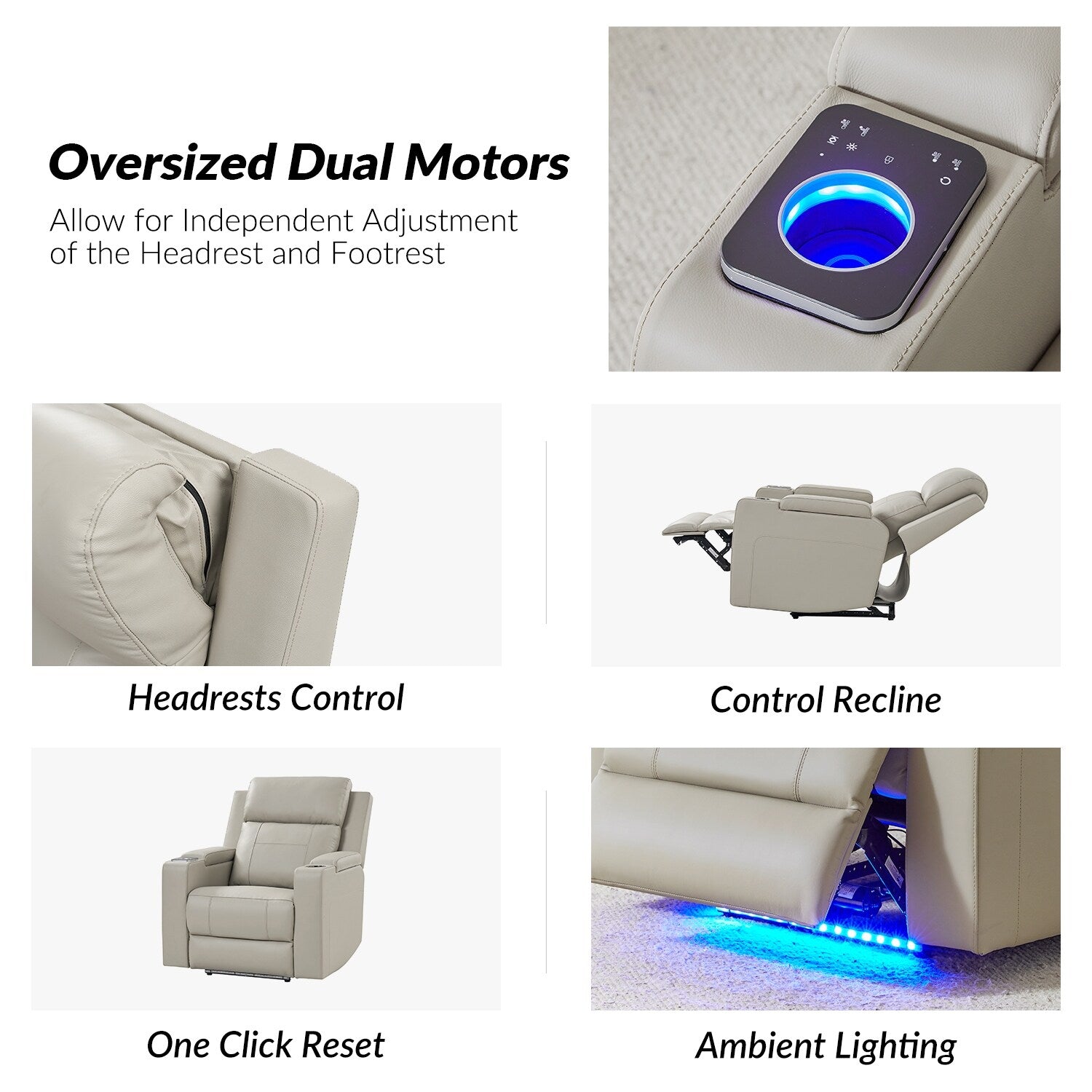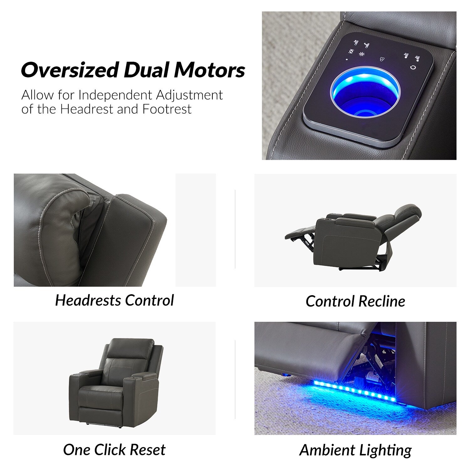 Presenting this genuine leather power recliner, a blend of traditional elegance and modern convenience. This oversized dual-motor electric recliner is designed for comfort and functionality. Featuring integrated cup controls, you can adjust your seating ?preferences effortlessly with touch or button commands. Customize your comfort with adjustable headrest and seat, boasting a one-touch reset and position lock function. Enjoy added convenience with the lift-up cup holders, which also double as wireless charging stations. Enhancing your ambiance, ambient lighting illuminates the front and right armrests. Storage abounds with functional armrests, complete with a cup holder on the left side. Crafted for spacious comfort, the generous seating area ensures ample room for relaxation. Plus, each recliner comes with a white insulated cup, suitable for enjoying your favorite beverage while lounging. Experience convenience with the classic genuine leather electric recliner.