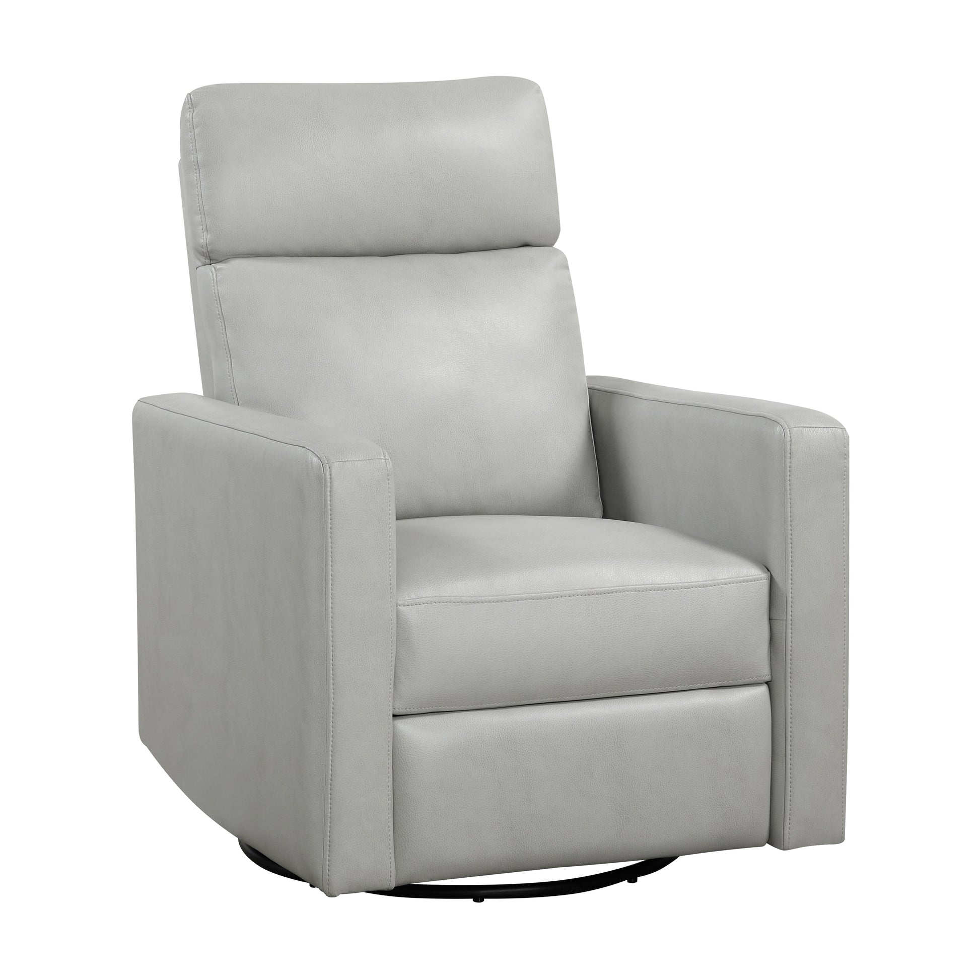 One (1) piece of swivel glider reclining chair Plywood frame construction Available (2) type of upholstery and color:? Chenille fabric in quartz Breathable faux leather in smoke Seat base features 360-degree swivel motion Track arm and attached cushion Pull-handle manual reclining mechanism Gentle gliding motion Seated, reading, and napping position Packed and shipped in (1) box