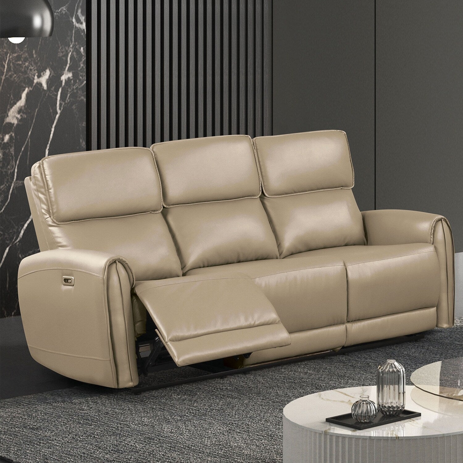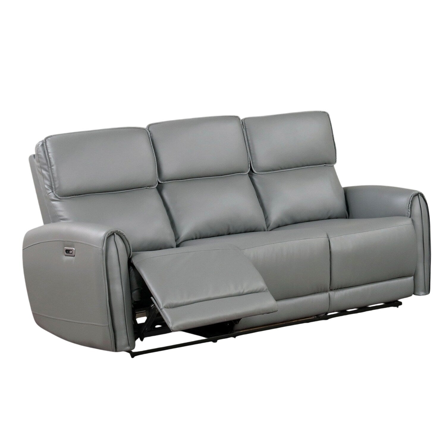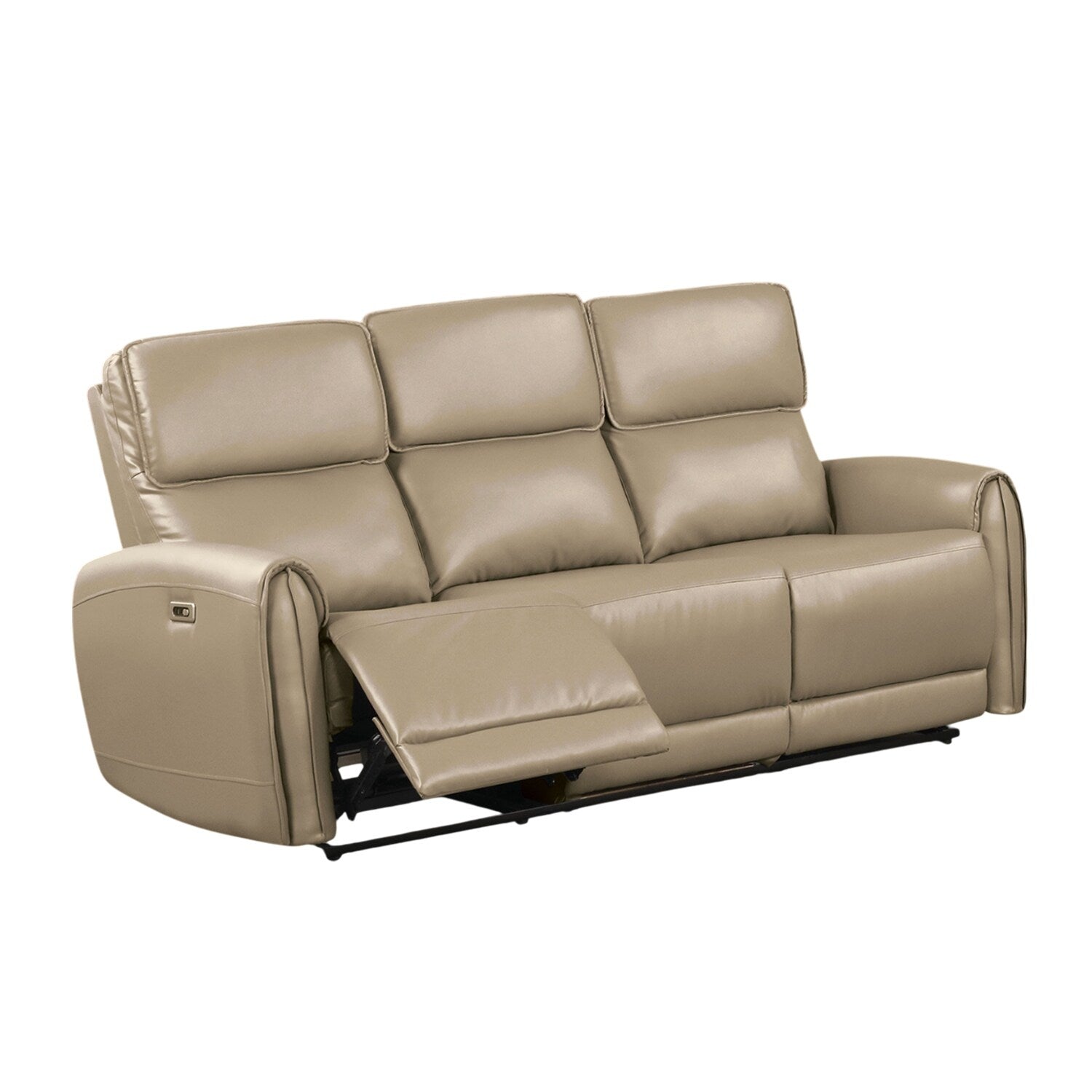 Contemporary elegance plays out in a clean, modern design as the power sofa delivers beauty and comfort to a space reserved for easy entertaining and relaxing. Beige leatherette upholstery covers wood framing to provide a sturdy build, embellished with plump foam filled in tall, attached back cushions and supportive seat cushions. They aided in luxurious comfort by power reclining at the touch of a button on a switch panel with a convenient USB port. The versatility of a clean finish joins a delightfully simple yet elegant style motif to make this power reclining sofa a hit in any modern space. This power sofa is all that's needed for a relaxing day or evening.