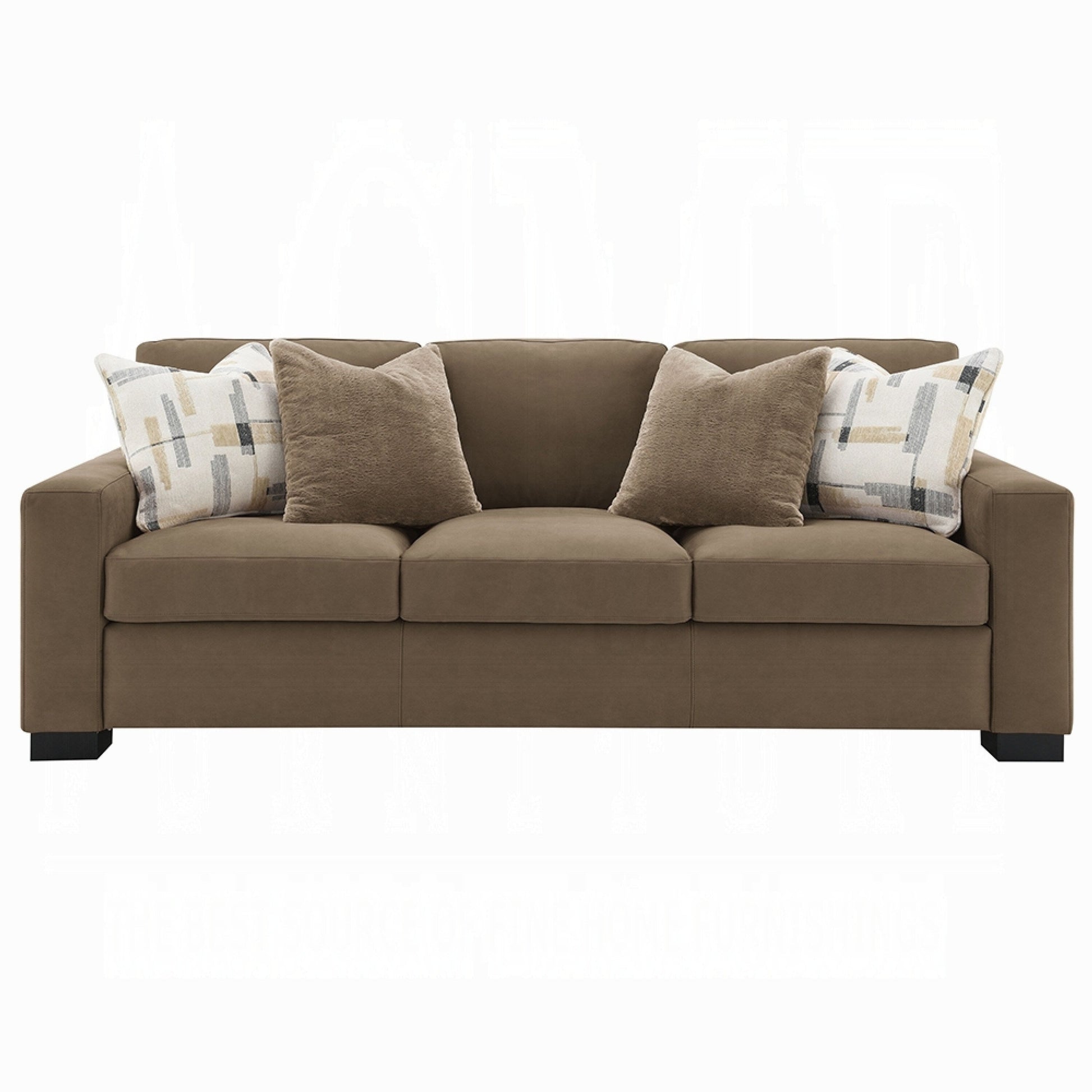 Experience ultimate comfort and style with this modern sofa. Wrapped in luxurious brown suede fabric, this sofa features tight cushions for a sleek look and plush seating with pocket coil construction for lasting comfort. Four accent pillows in white and brown add a visual touch. Supported by low-profile legs, it's perfect for modern, transitional spaces. Explore more in the Lenu collection.