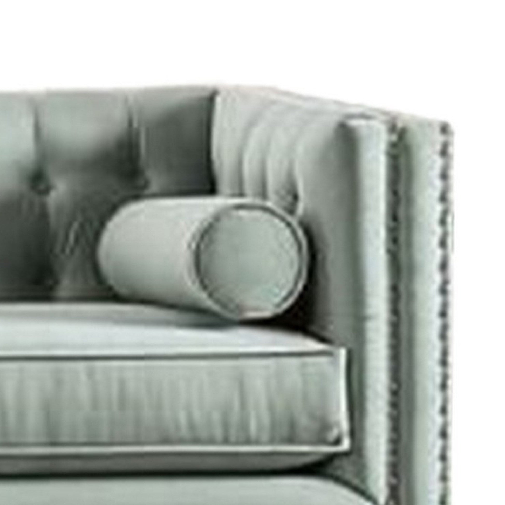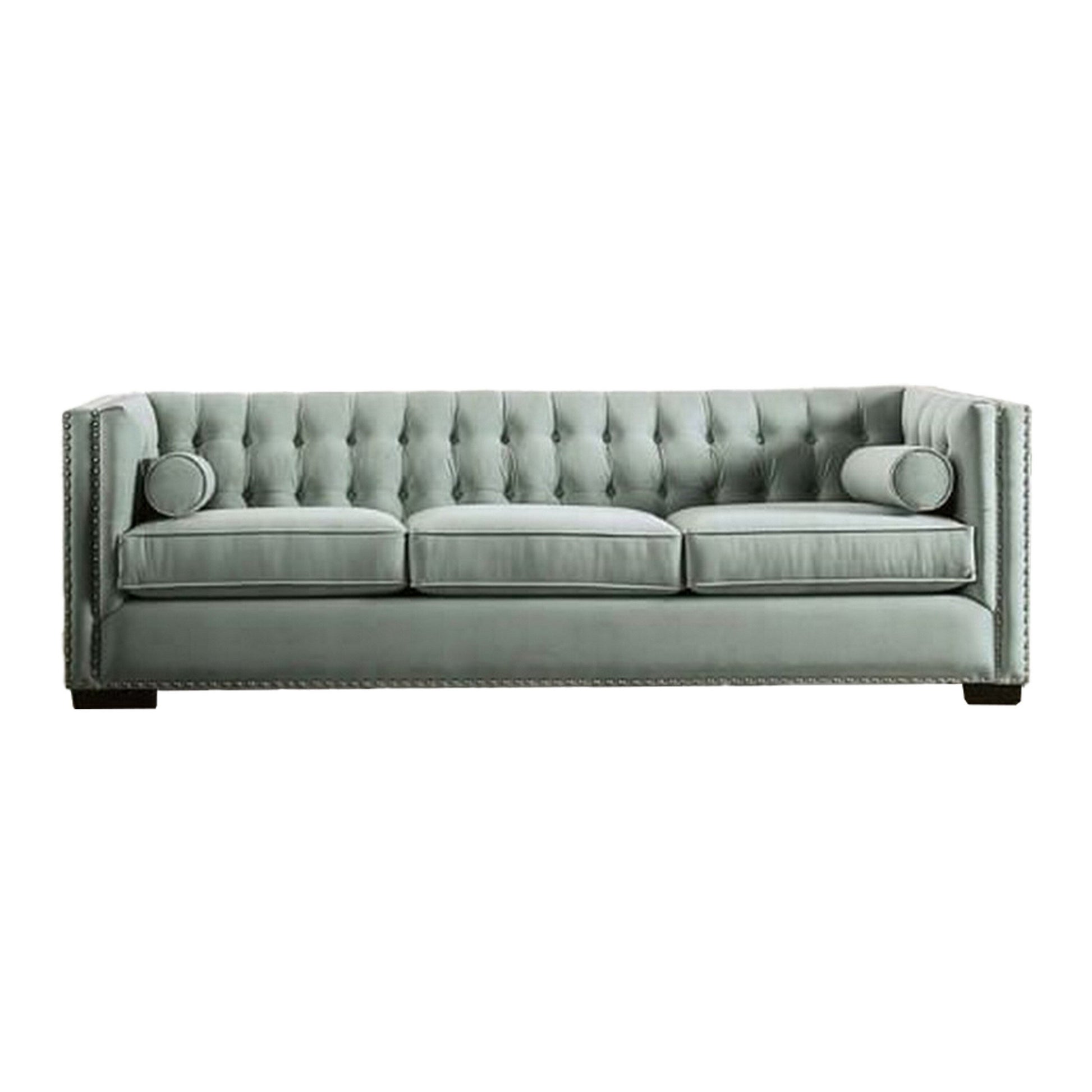 Discover the perfect blend of elegance and comfort with this sofa. Crafted with a solid wood base, it ensures dependable stability. The pale teal velvet-like fabric offers a soft touch and timeless charm, and the tuxedo-style design with welted box cushions and a tufted pattern adds refined texture. Embrace a transitional style that fits into any space. Check out our Leone collection for more.