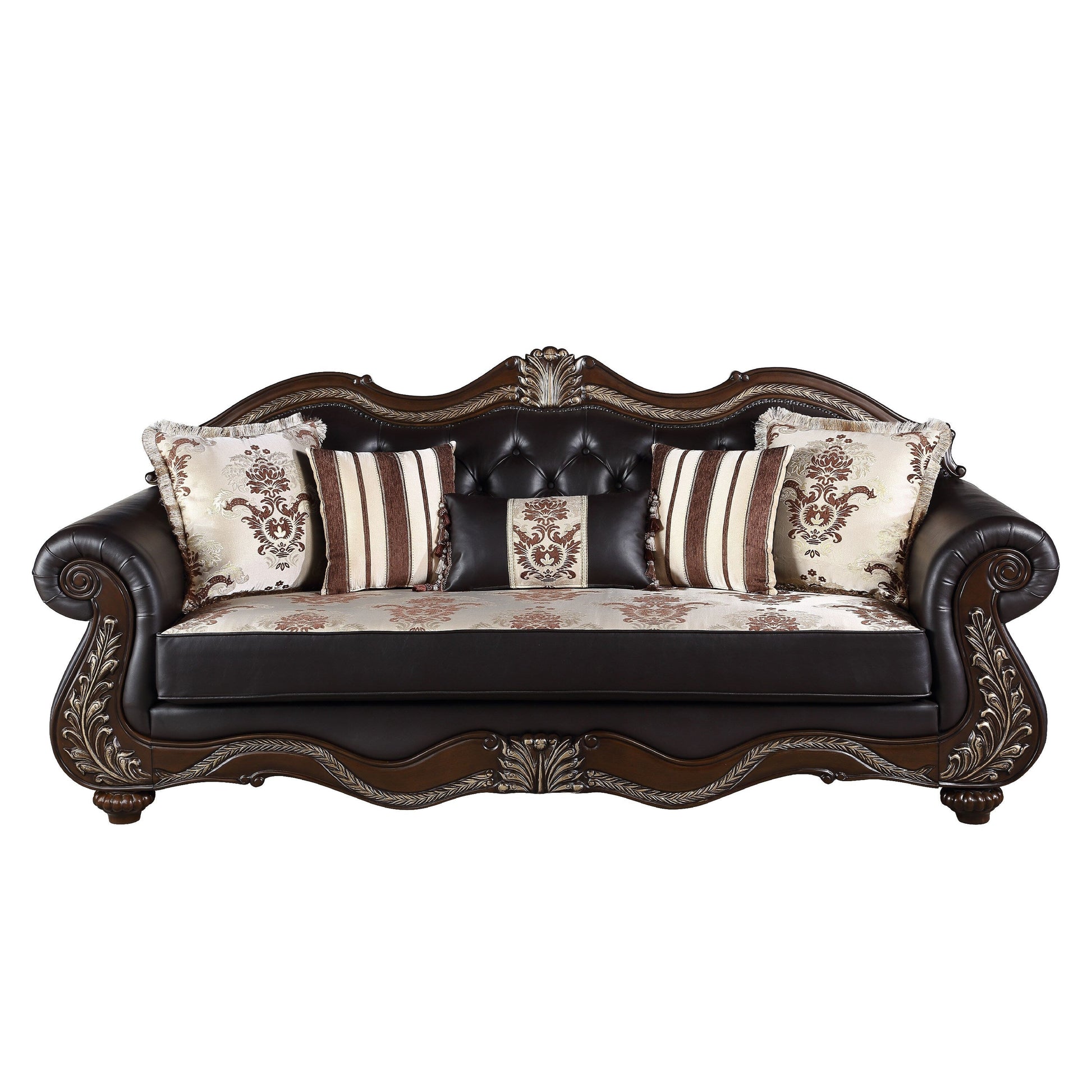 Experience timeless elegance with the Liana sofa. Designed with a sturdy cherry brown solid pine wood frame, it showcases intricate hand-carved details, antique gold accents, and a tufted black faux leather backrest. Rolled arms with nailhead trims exude refinement, while five included white accent pillows enhance contrast and comfort. Explore the Liana collection for more.