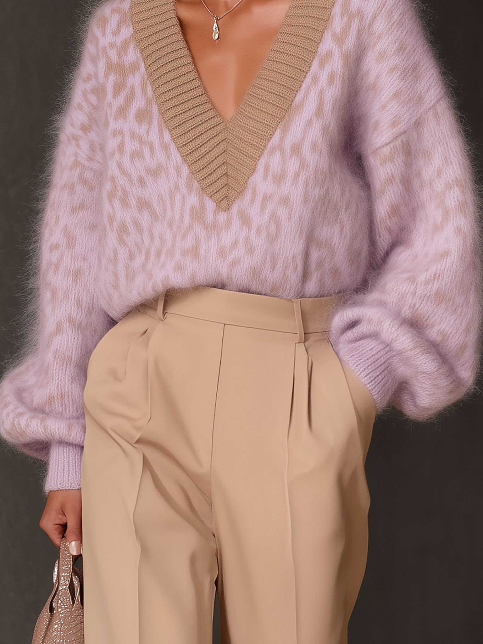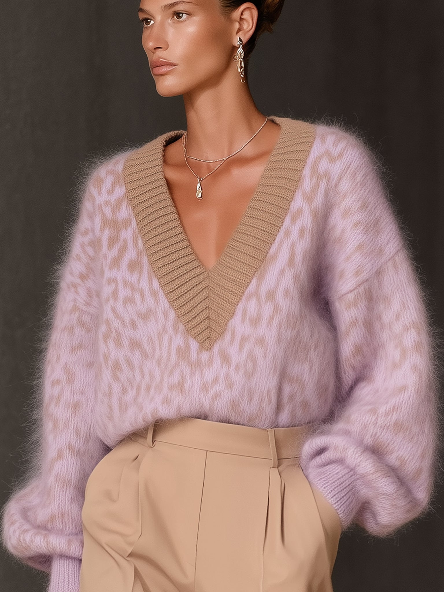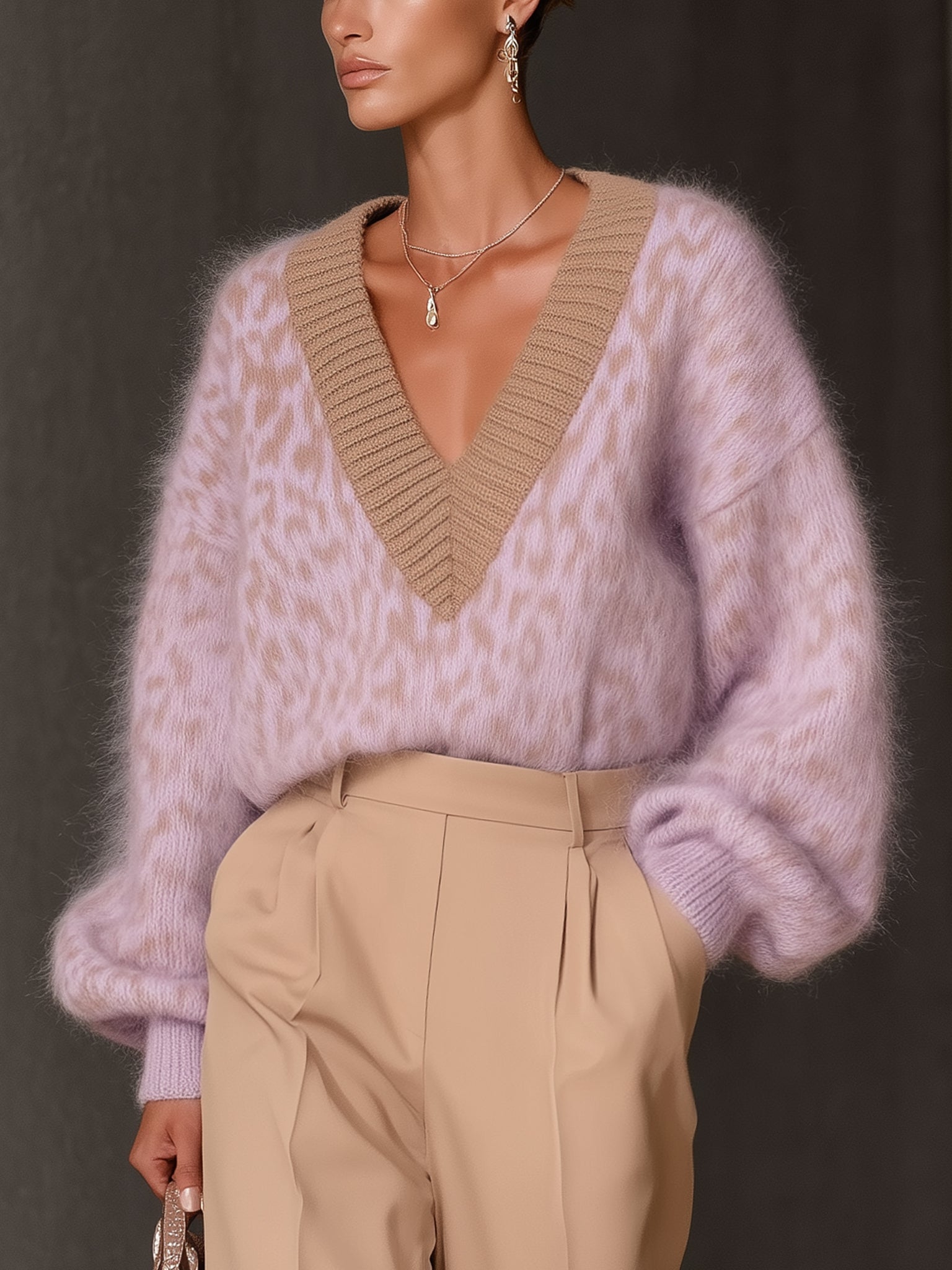Design: This chic sweater features a soft lilac base adorned with a subtle light beige leopard print. The oversized balloon sleeves add drama and plush volume, while the wide ribbed V-neckline in a rich camel tone adds contrast and structure.