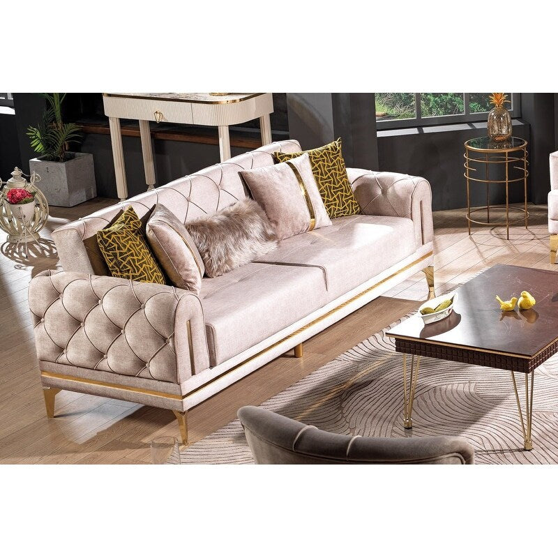 The Helena Sofa offers a sophisticated, multifunctional design that suits both contemporary and classic interiors. This Turkish sofa boasts a modern aesthetic with gold or silver metal frames and legs, decorative pillows, and a unique ability to transform into a bed while providing extra storage space. Its 32 DNS foam cushions deliver superior comfort, and the water/stain-resistant velvet fabric ensures easy maintenance, making it perfect for high-traffic areas.