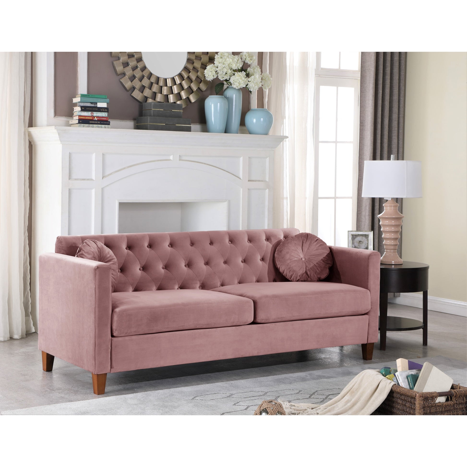 The Lory Kitts Classic Velvet Chesterfield Sofa boasts a robust wood frame, with tight arms and round, tapered wood feet that give it a clean-lined silhouette. Upholstered in crushed velvet fabric, this sofa exudes glamour, while high-density foam cushioning and spring support ensure comfort. Its button-tufted backrest, coordinating throw pillows, and loose back cushions complete the look. Available in six color options.