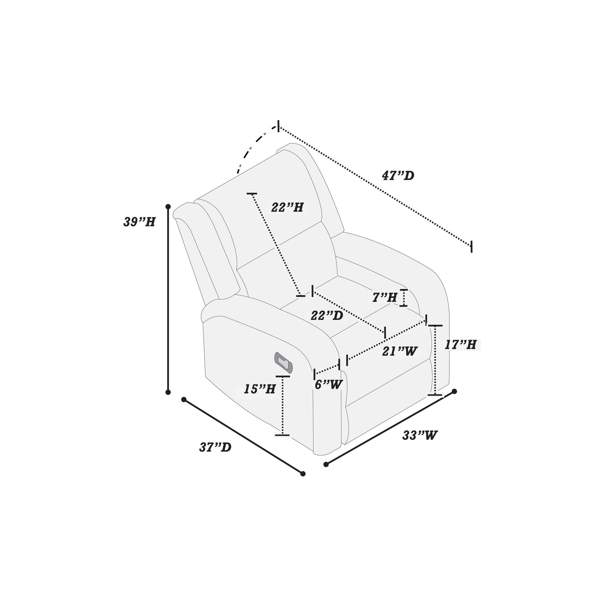 Indulge in the lap of luxury with our single recliner, a masterpiece of comfort and design. The horizontal tufting not only provides a sumptuous seating experience but also exudes a timeless charm that will enhance the aesthetic of any living space. The light vertical tufting further elevates its visual appeal, making it a statement piece. The conveniently located reclining handle on the side allows for effortless adjustment, enabling you to find your perfect reclining position with ease. Sink into the plushness of the generously padded seat and backrest, which are expertly designed to cradle you in comfort as you unwind after a long day. This sleek and sophisticated addition to your living space is not just a recliner; it's a haven of relaxation and style. Whether you're watching your favorite movie, reading a book, or simply taking a nap, this single recliner will provide you with the ultimate comfort and support. Its luxurious design and impeccable craftsmanship make it a must-have for any discerning homeowner. Add a touch of elegance and comfort to your living room with our single recliner and transform it into a space you'll love to relax in.Experience unparalleled comfort with horizontal tufting that adds a touch of timeless charm, while light vertical tufting enhances its visual appeal.The reclining handle, conveniently located on the side, offers effortless adjustment, allowing you to find your ideal reclining position with ease.Sink into the plushness of the generously padded seat and backrest, designed to cradle you in comfort as you unwind after a long day.Unwind in luxury with this sleek and sophisticated addition to your living space.