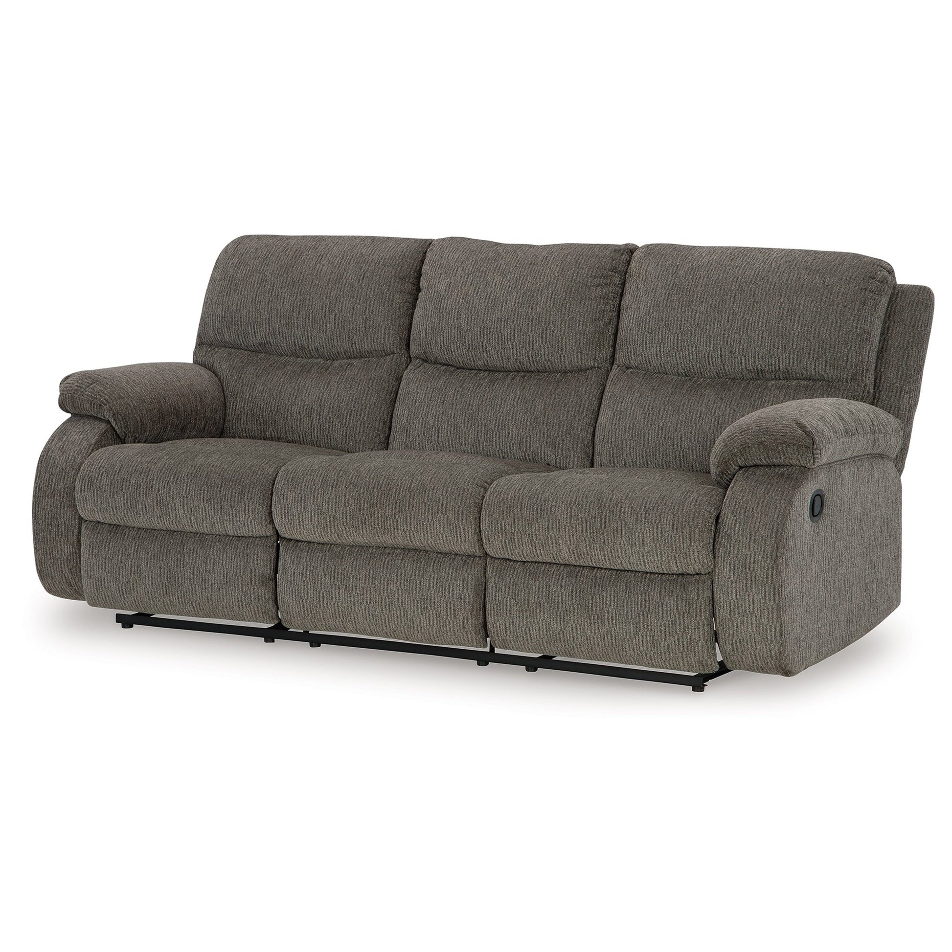 Unwind in style with this reclining sofa, a perfect blend of comfort and contemporary design. Upholstered in soft brindle gray polyester, it features dual-sided reclining seats with a pull-tab motion. The bustle back design and plush cushions offer exceptional support, while the corner-blocked frame and metal-reinforced seat are designed for durability. Explore our Lyla collection for more.