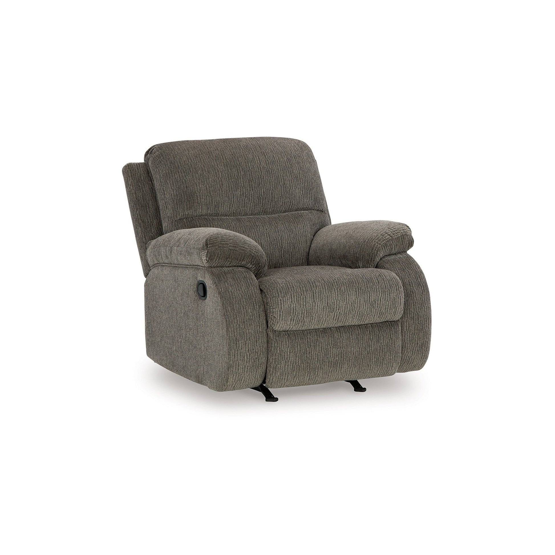 Unwind in cozy comfort with this manual rocker recliner chair. Designed for ultimate relaxation, it features a contemporary bustle back and soft polyester upholstery in a versatile brindle gray hue. The smooth pull-tab reclining motion and gentle rocking function make it the perfect addition to any living space, offering both style and everyday ease. Check out our Lyla collection for more options.