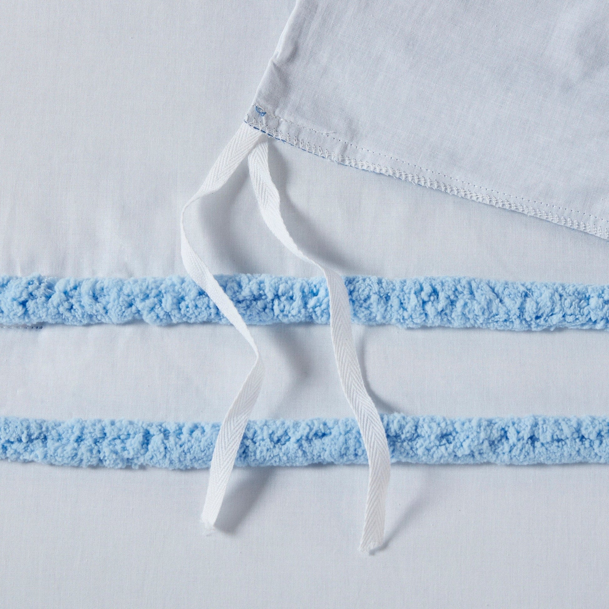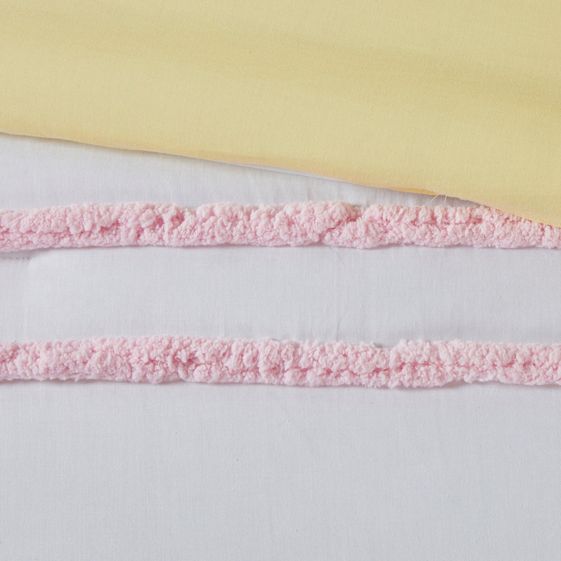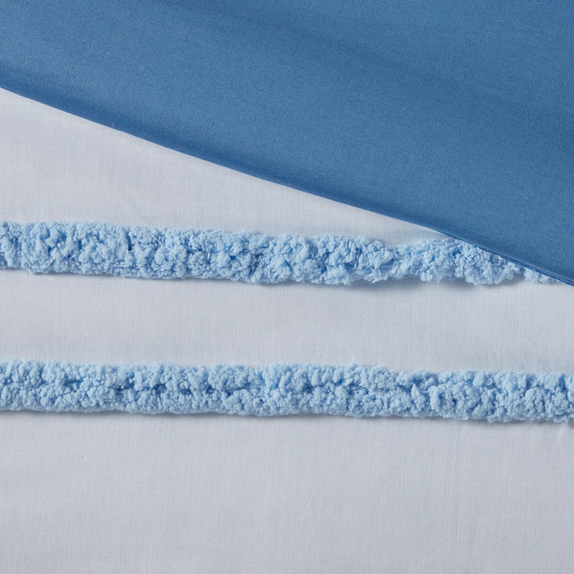 Duvet/ Sham: 100-percent cotton solid face and reverse, with chenille trims on the face