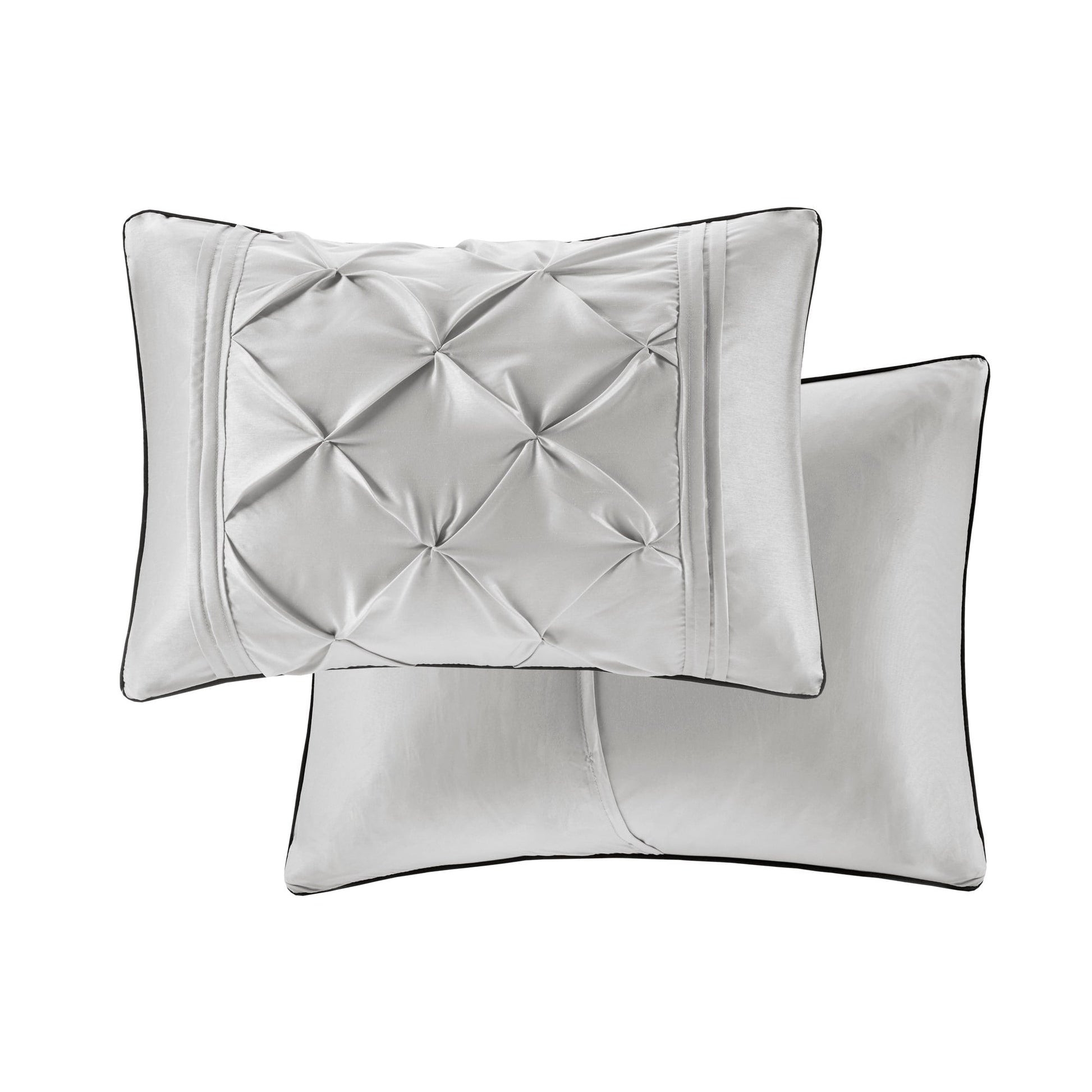 Set includes comforter, bedskirt, 2 shams, 2 square and 2 oblong decorative pillows, 2 euro shams, 4 piece sheet set, 4 window curtains, 4 tiebacks, 2 valances