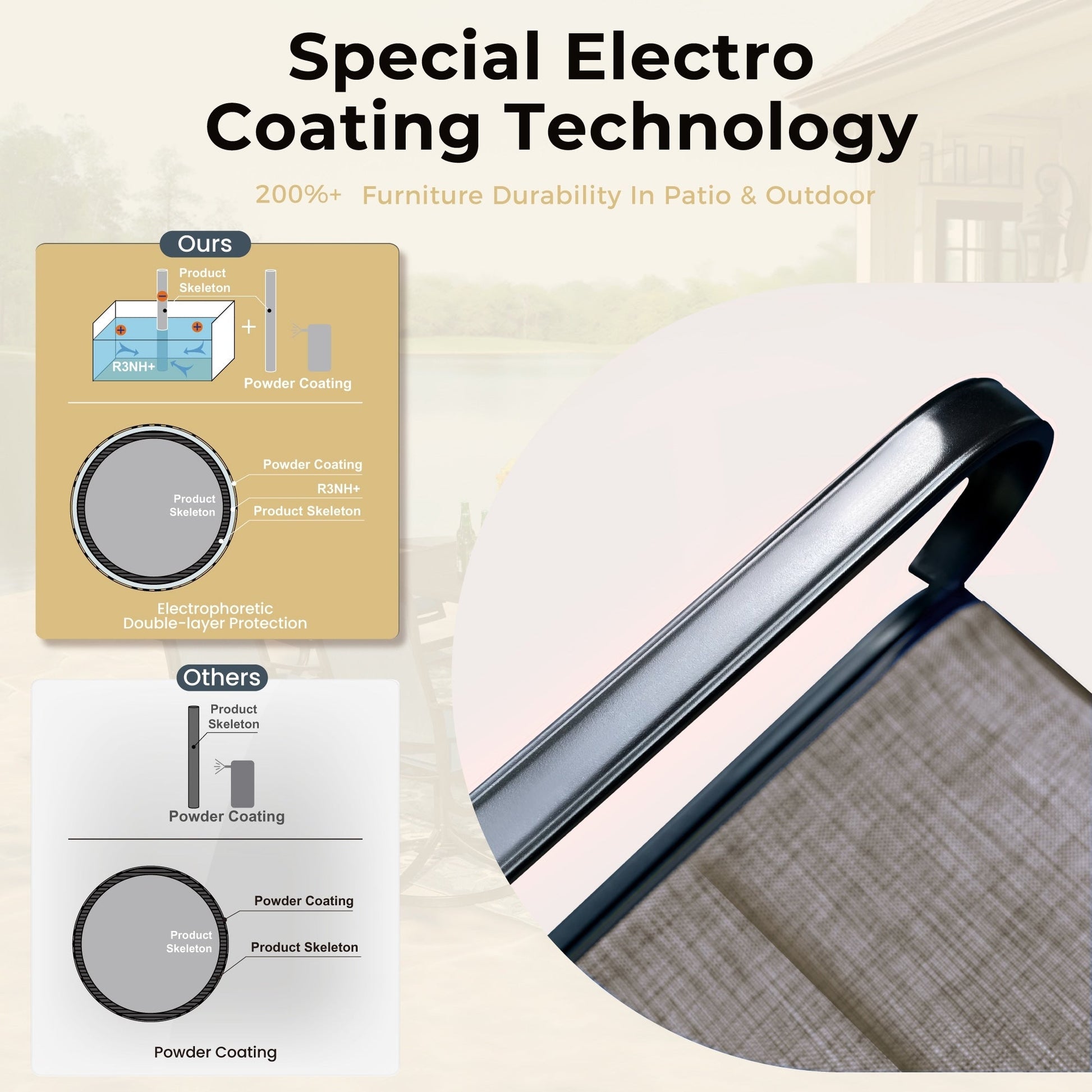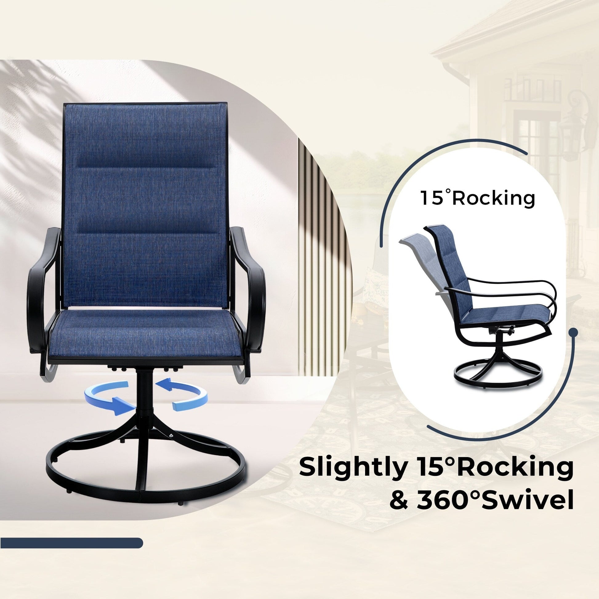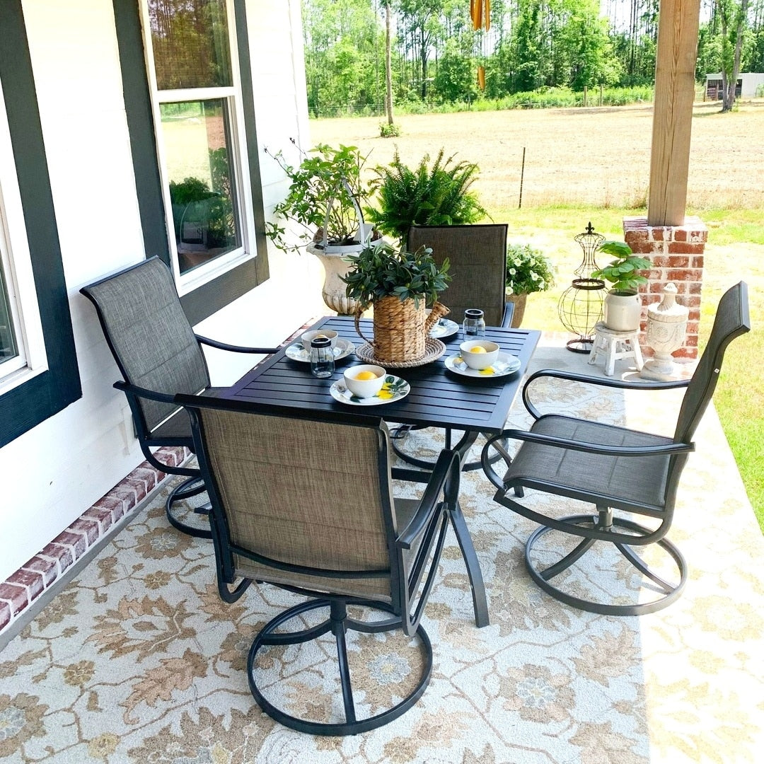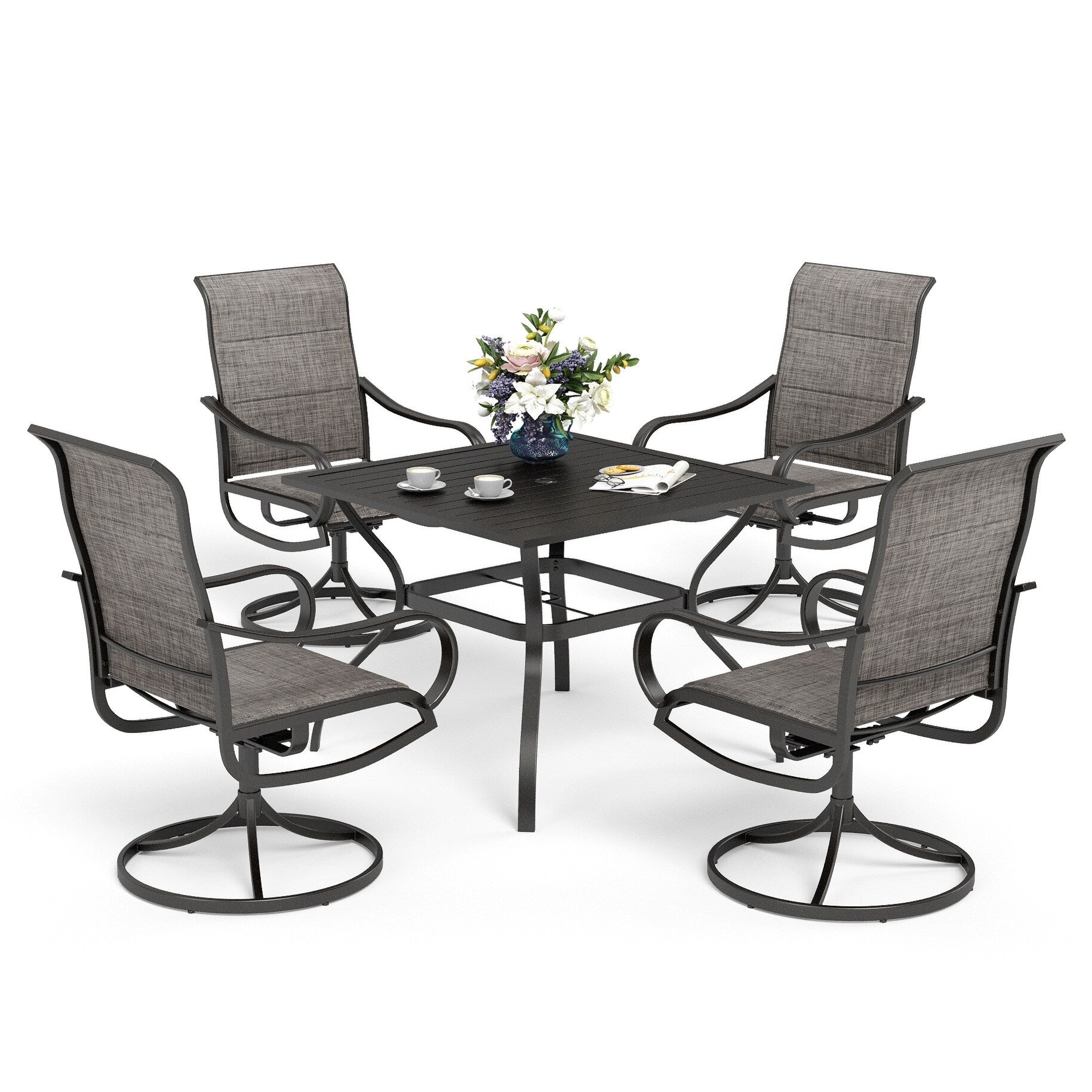 This stately, modern patio dining set will elevate the look and comfort of any outdoor space. The chairs feature breathable, padded sling fabric seats, and they swivel 360 degrees for convenient, varied use. The table has an umbrella hole, giving you the option to add an umbrella for shade on hot summer days.