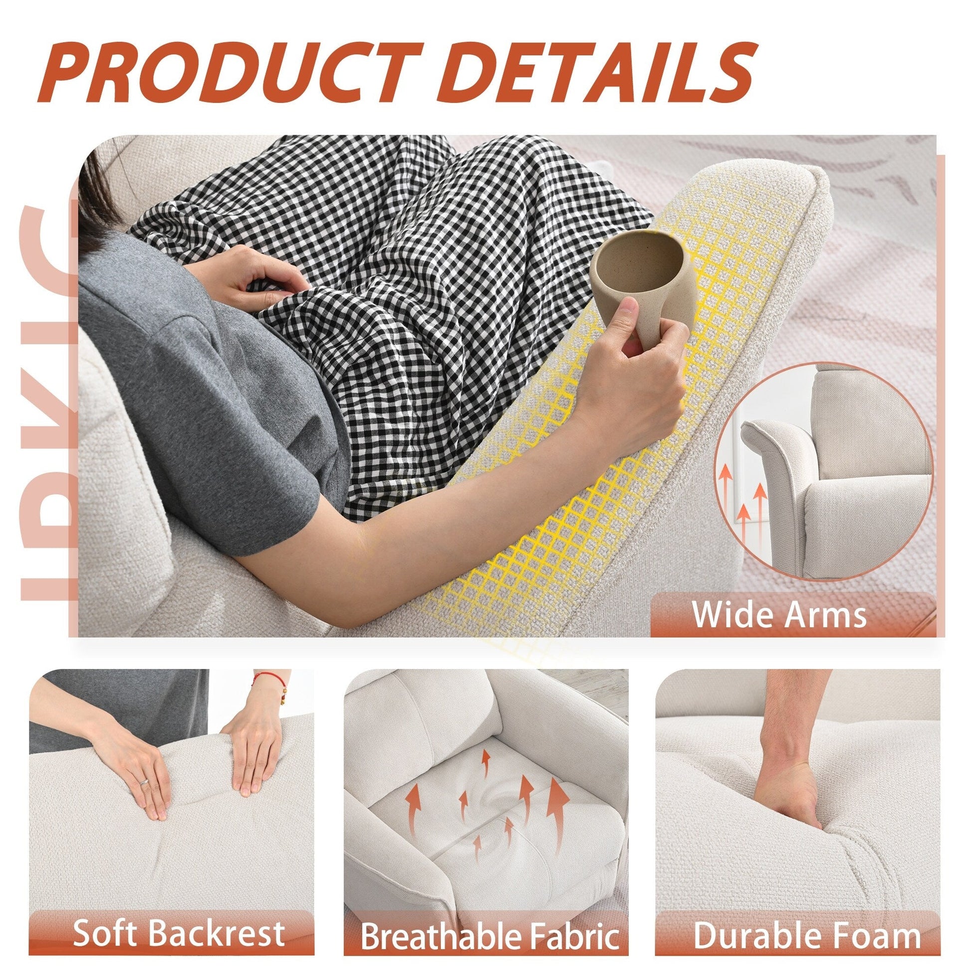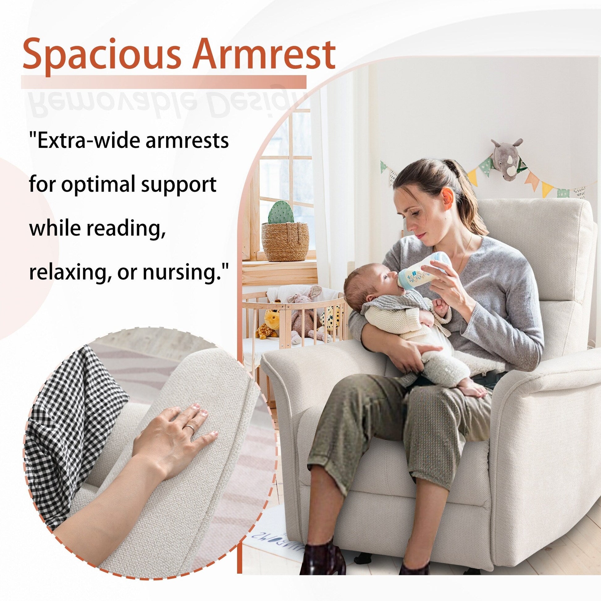 【Overstuffed Padding Wide Armrests】Sink into cloud-like comfort with our high-density sponge cushioning in the seat, backrest, and extra-wide padded armrests - specially designed for nursing mothers and those who enjoy reading or working on laptops. The plush snowflake velvet fabric offers a buttery soft touch while being durable and breathable for all-day comfort