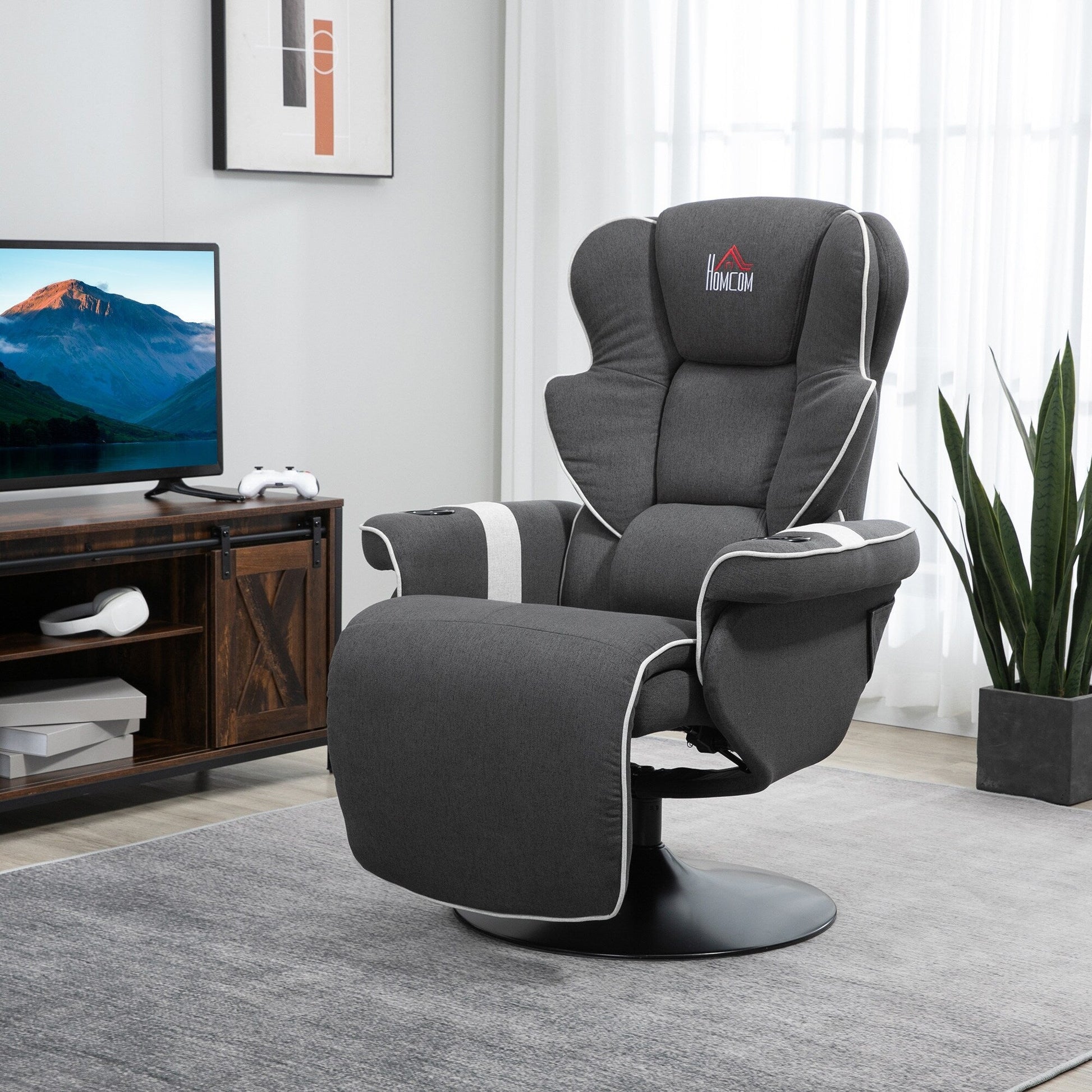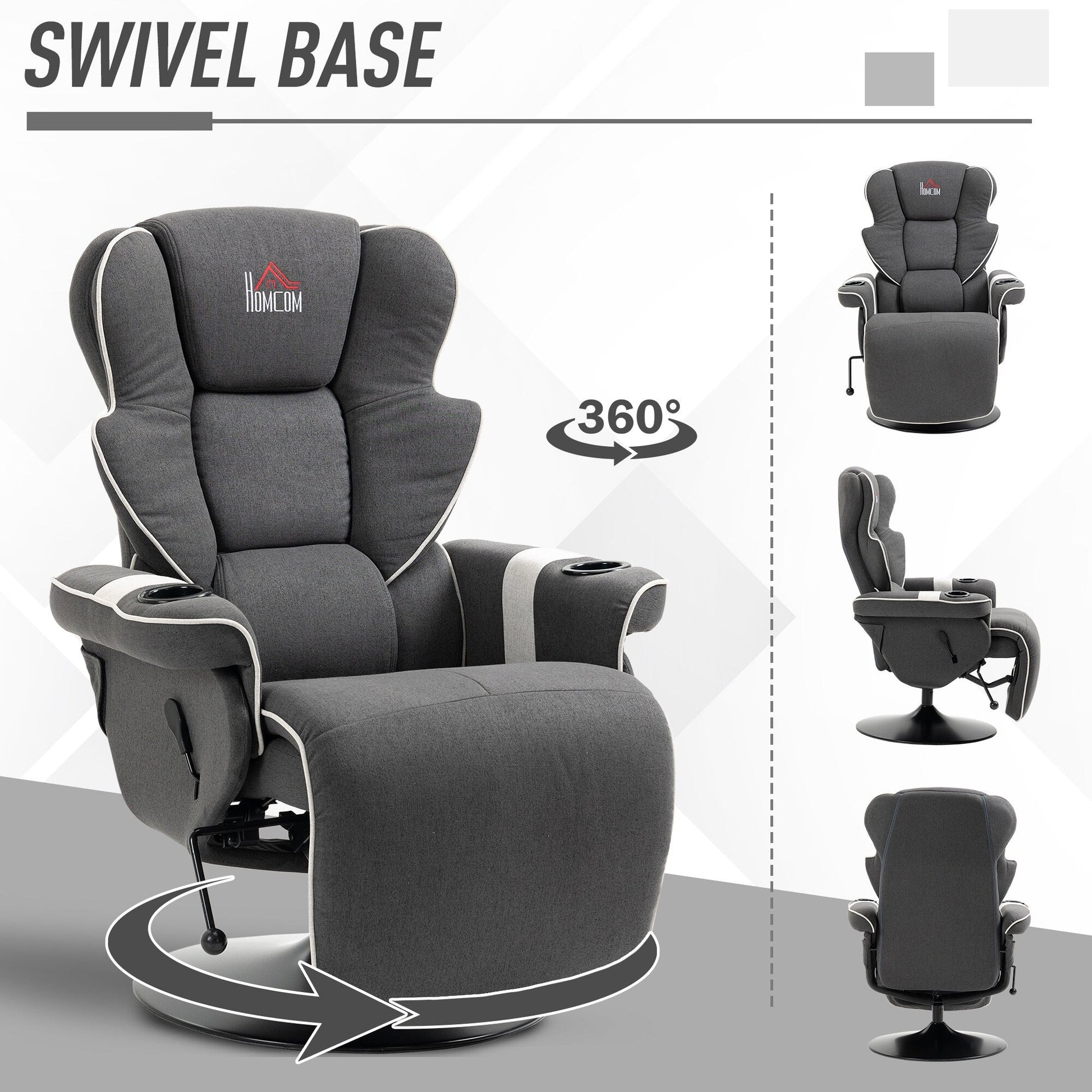 • This manual recliner combines function and comfort with a 150 ° adjustable backrest, built-in footrest, and full 360 ° swivel. Upholstered in linen-feel fabric with plush padding, it also features dual cup holders, making it a convenient and cozy choice for living rooms, RVs, or reading corners.