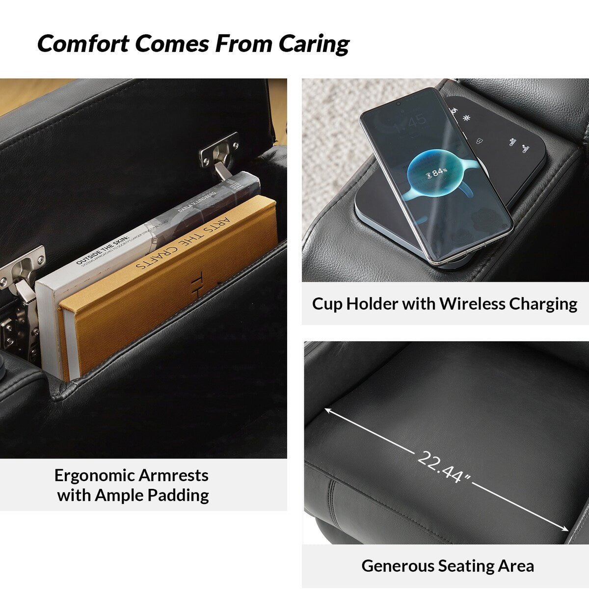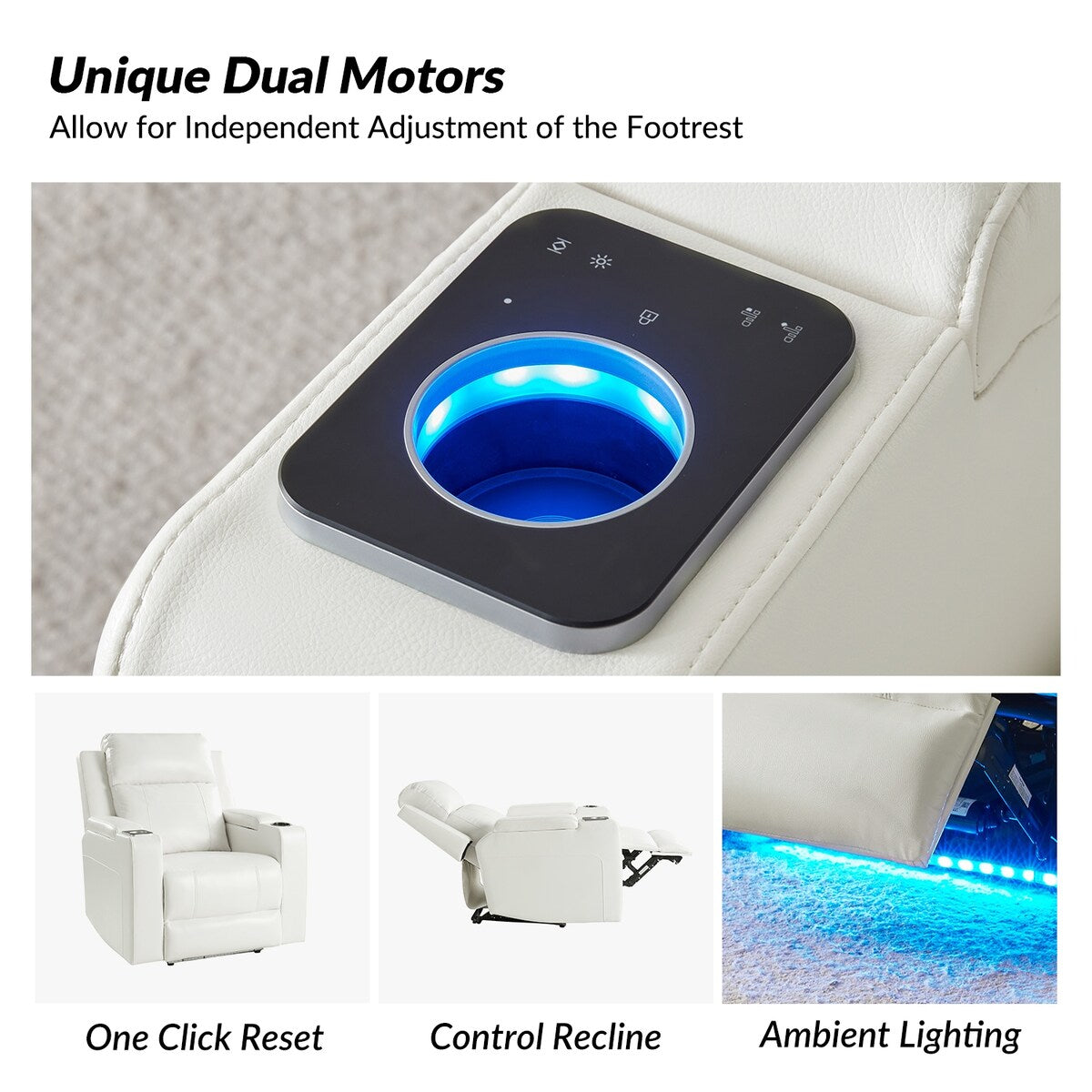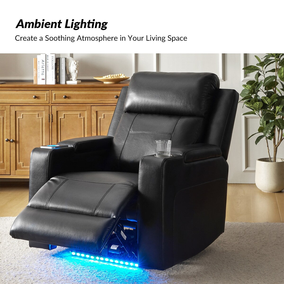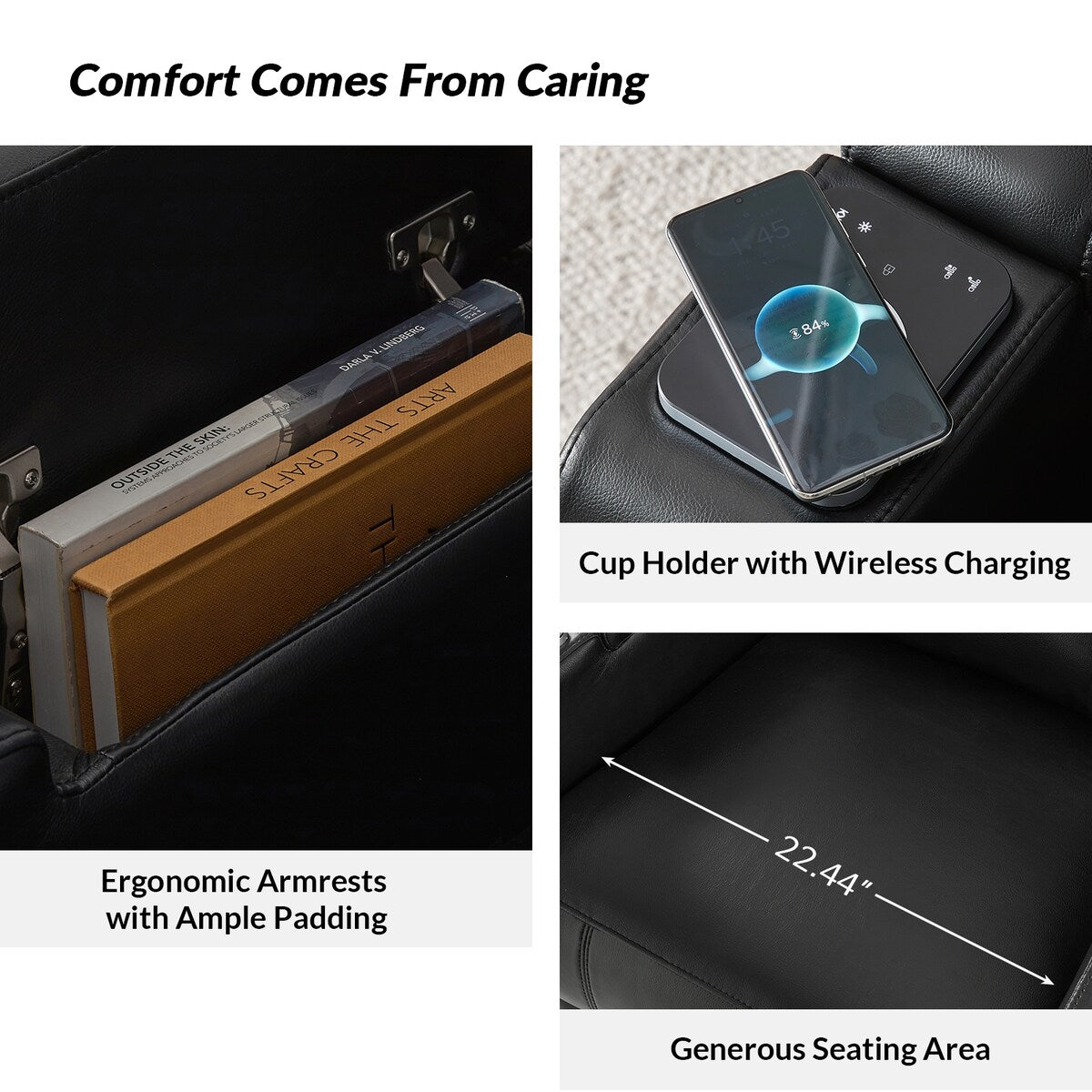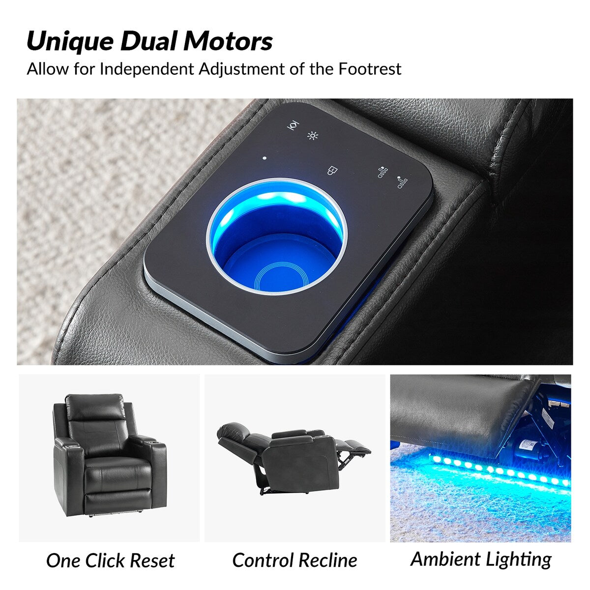 Presenting this?traditional style power recliner?upholstered in?advanced textile materials. Experience comfort with?integrated cup holders, touch-sensitive controls, and convenient lift-up?functions that double as?wireless chargers. Customize your seating experience with?adjustable seat positions, including a?one-touch reset and position lock?feature. Enhance your ambiance with?built-in ambient lighting?located beneath the seat and on the right armrest. Stay organized with?storage space in the armrests, complete with a cup holder on the left side for added convenience. With its spacious design and?extra-wide seat, relaxation has never been more inviting. Upgrade your leisure experience with this?classic power recliner, where comfort meets innovation.