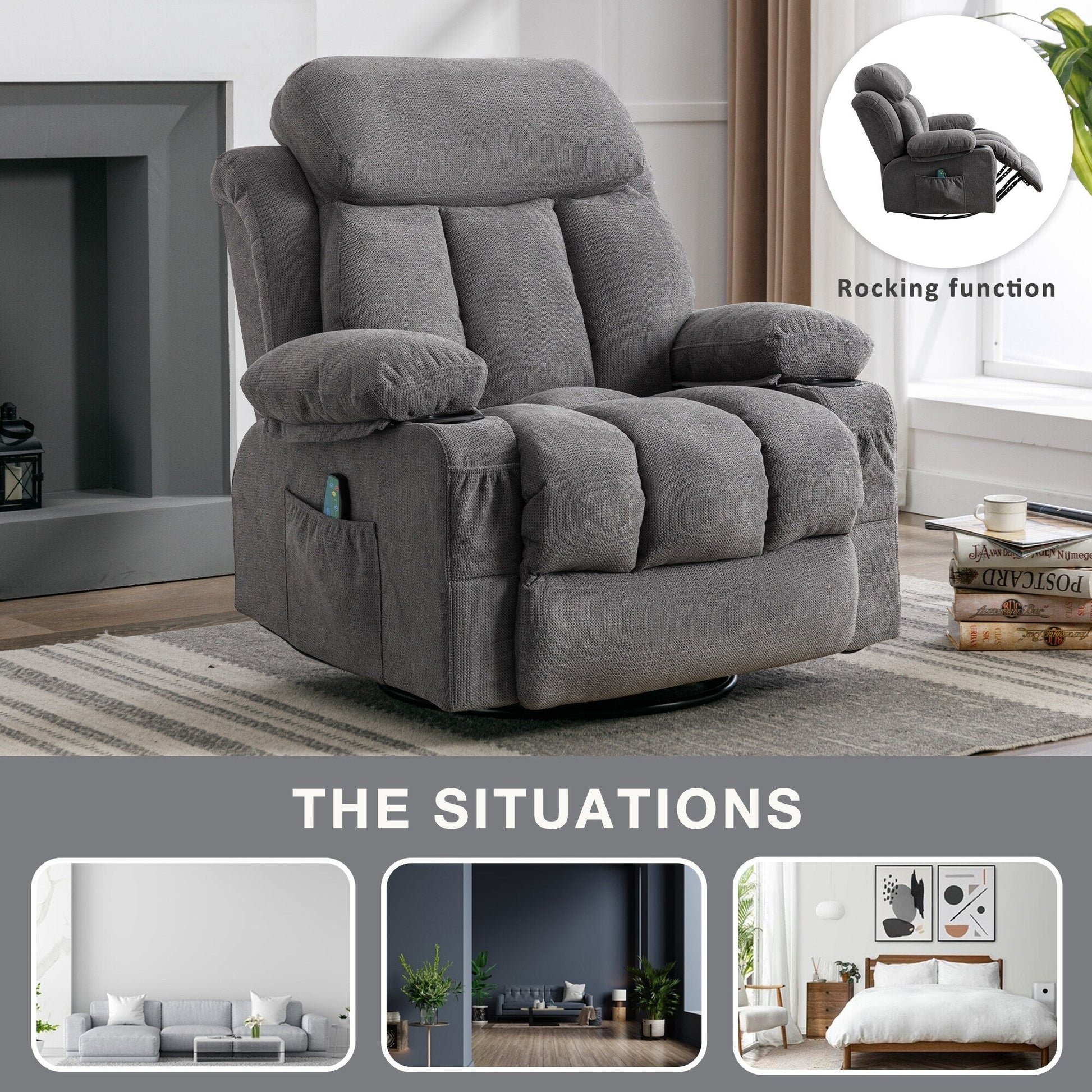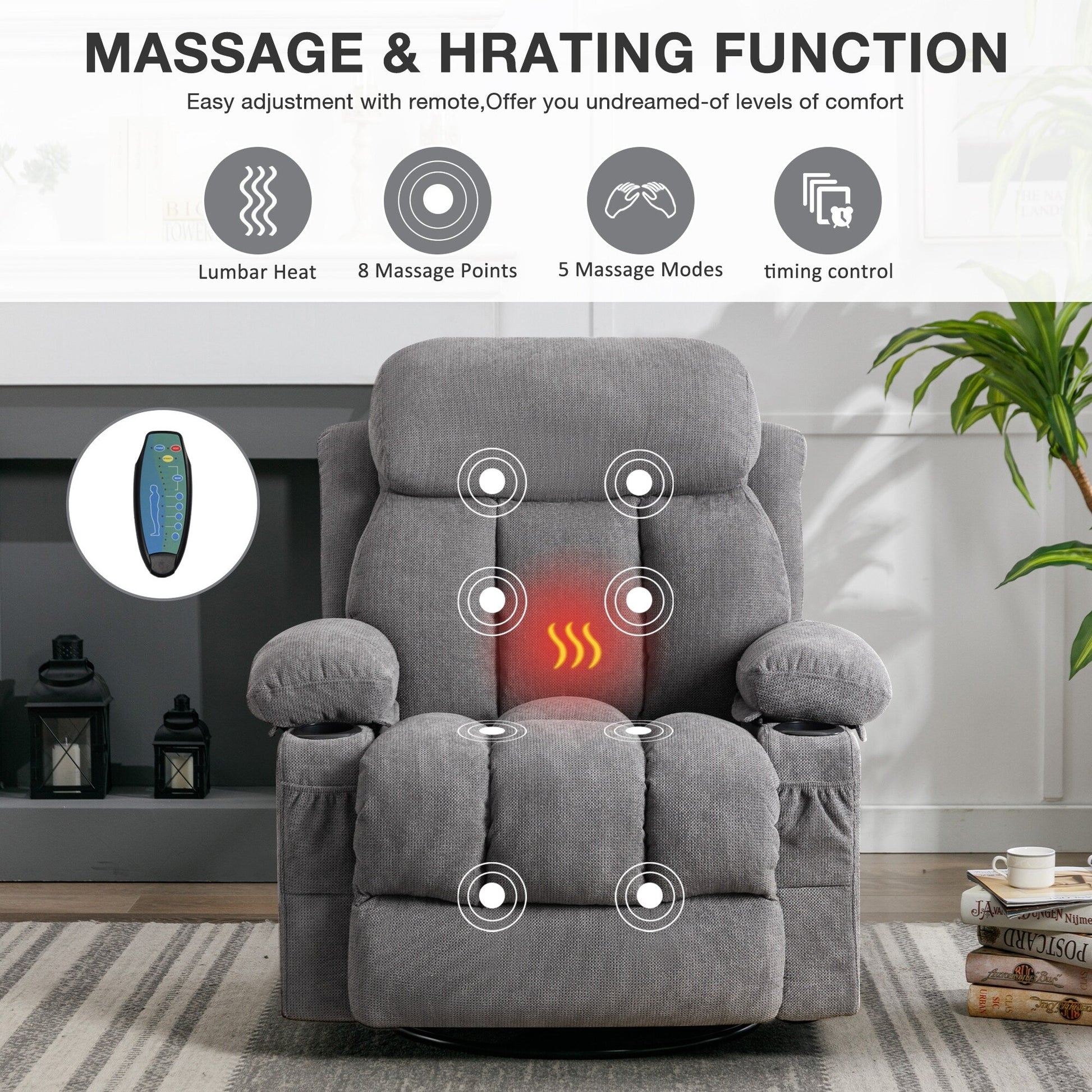 【Recling Swivel】- Just pull the handle on the side to recline and stretch your body (max 155 degrees), allowing you to have a better life. The massage recliner chair can also swivel 360 degrees, allowing your body to rotate freely. Therefore, this is a great gift choice for yourself or someone you care about.