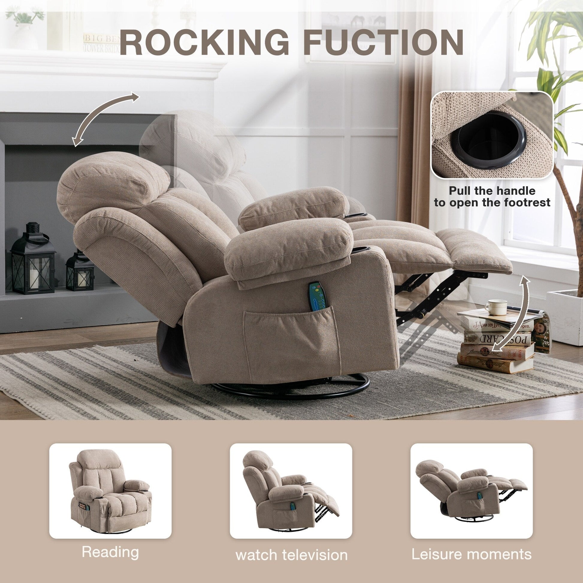 Our swivel massage recliner chair is perfectly suitable for the living room, bedroom, or office. This lazy boy recliner chair with a swivel base helps your body rotate a full 360 degrees. With soft fabric material, a large headrest with a padded back and cushion for relaxation, a manual control headrest, and a footrest design to stretch your body, it creates a comfortable feeling for your dear family.