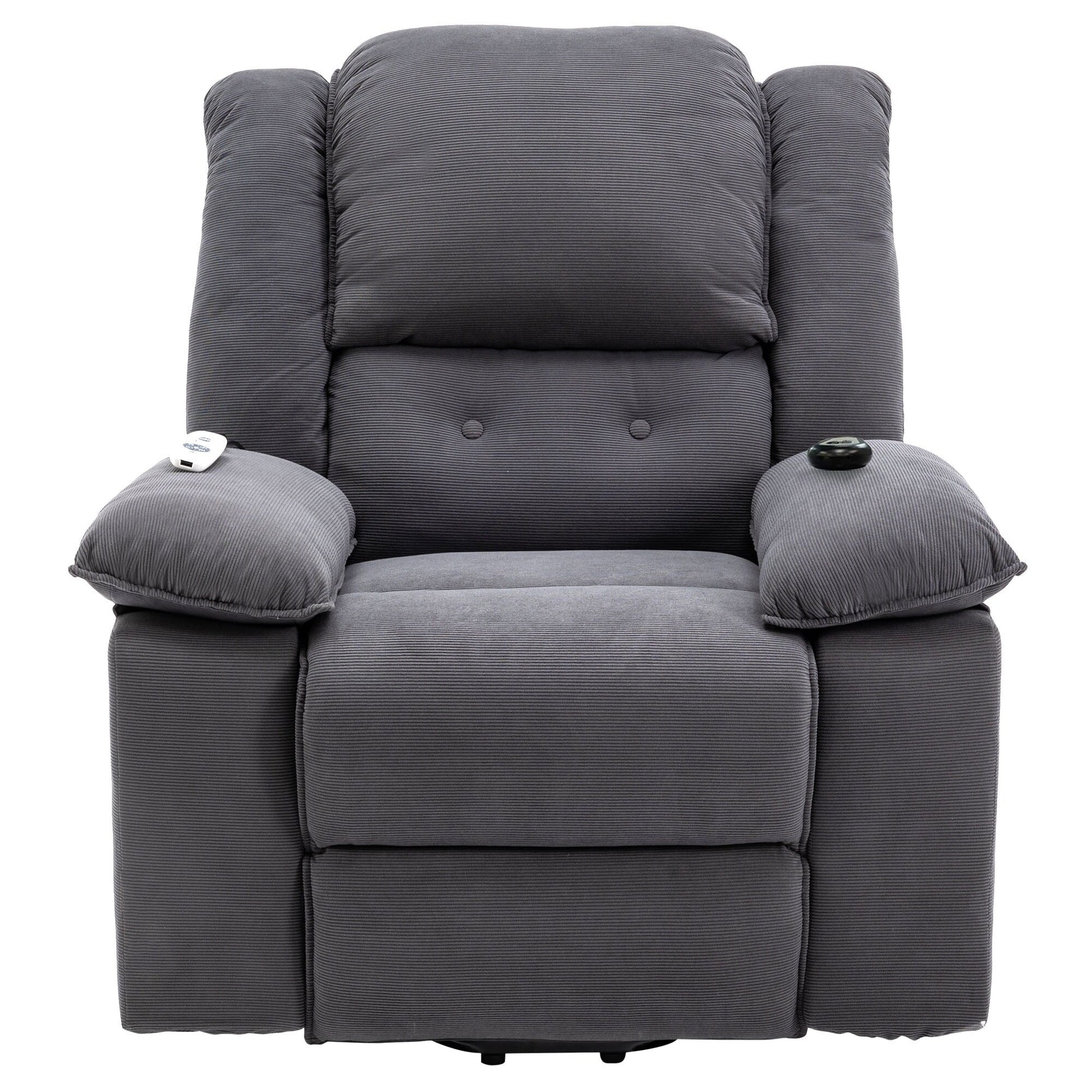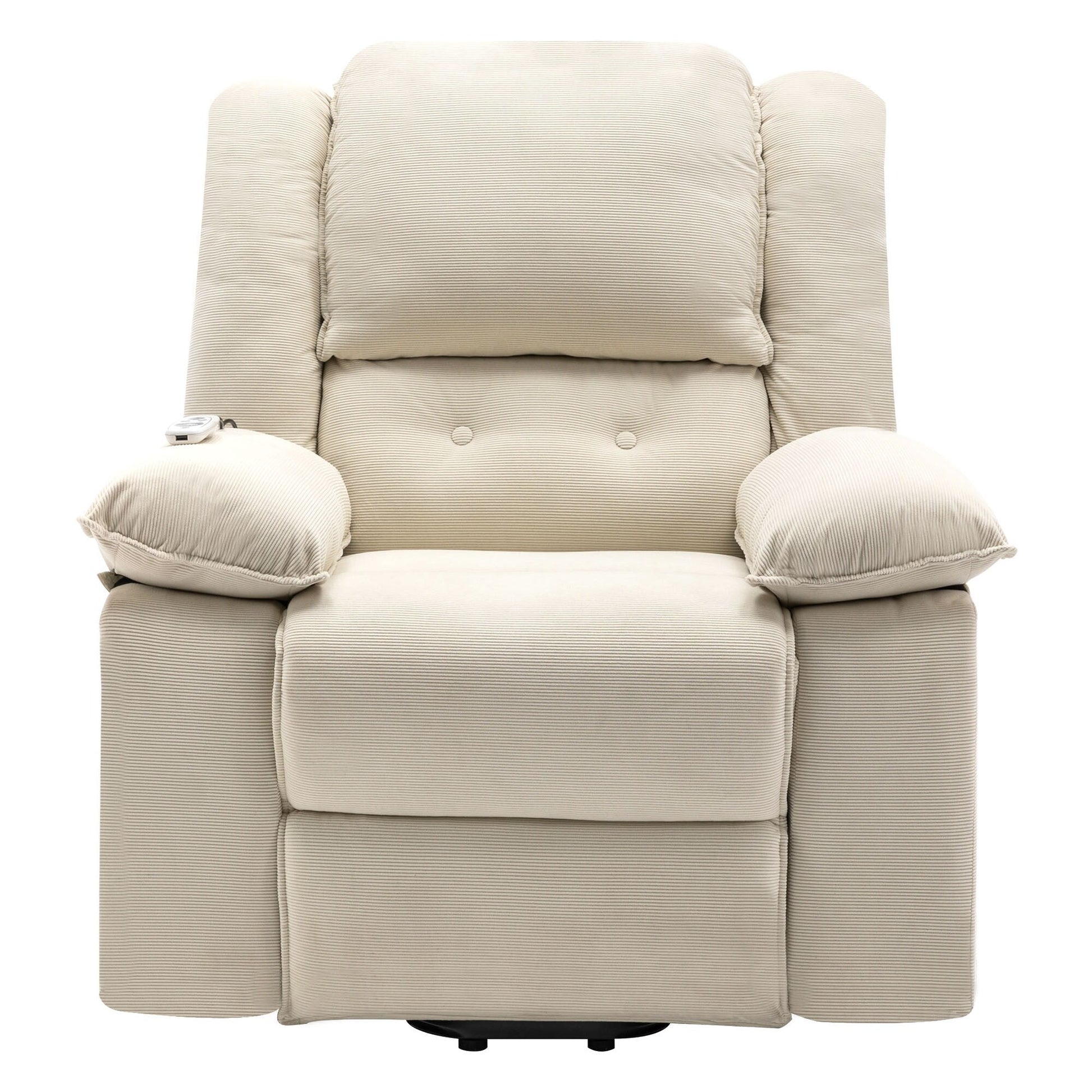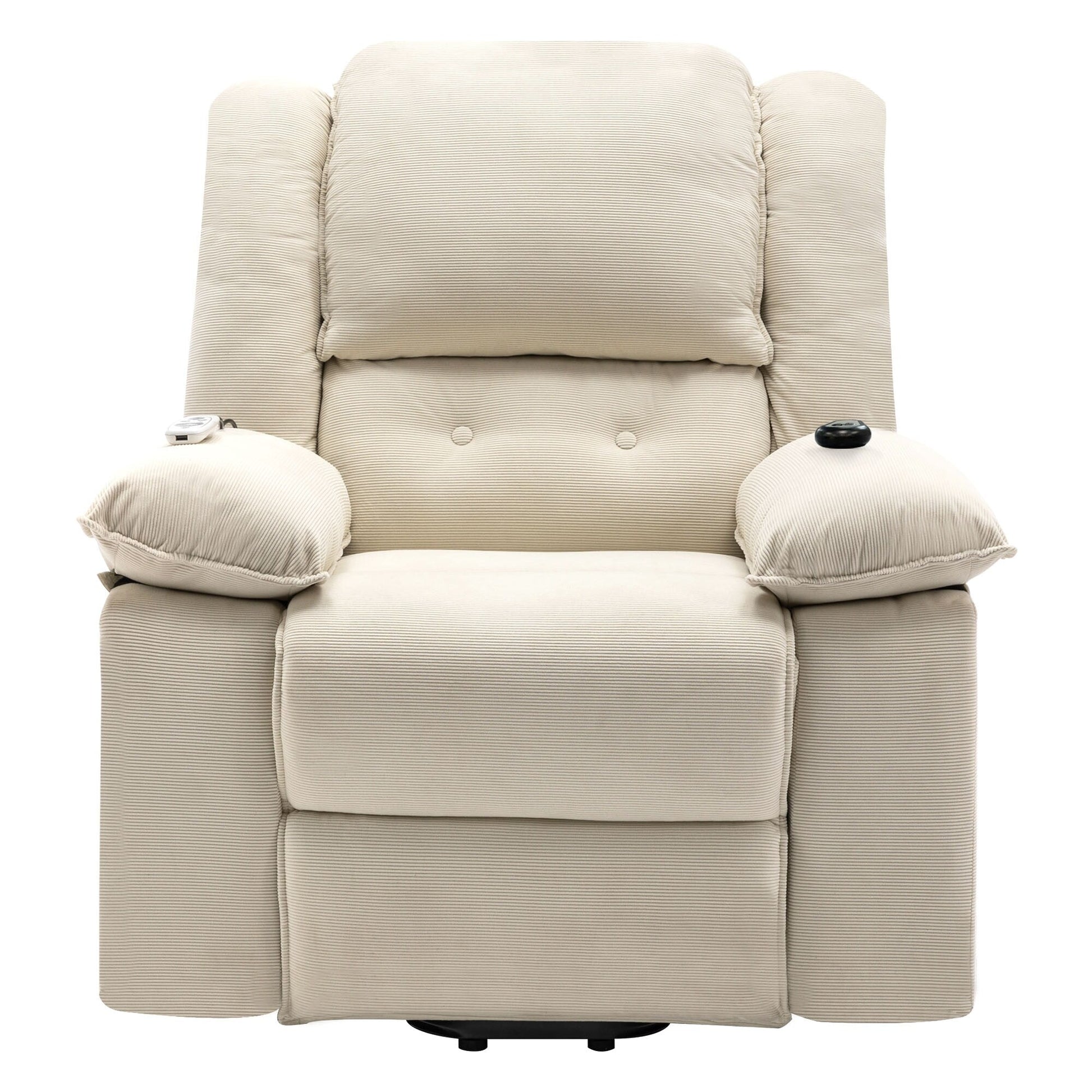 This power lift chair is a remarkable addition to your living room, offering ultimate comfort and functionality. It comes with advanced massage and heating features that soothe your body and enhance your relaxation. The adjustable backrest and footrest allow you to find the perfect position for maximum comfort. The smooth and powerful lifting mechanism ensures safe and effortless movement, making it ideal for the elderly and those with mobility issues. The side storage pockets keep your essentials within reach, while the padded armrests provide additional comfort. With its soft upholstery, this chair not only looks great but also offers a superior seating experience.Massage and Lumbar Heat Functions - The recliner chair has 8 massage nodes and 3 massage modes that you can control separately. You can set the timer for 10/20/30 minutes. The lumbar heat point helps your blood flow and relaxes your body.Power Recliner Chair - The backrest and footrest of the power recliner chair can be adjusted between 105°and 135°, allowing you to enjoy more comfortable postures.Innovative Lifting Mechanism- This power lift chair's smooth and powerful lifting mechanism supports safe and effortless movement from a seated to a standing position, offering invaluable assistance for the elderly and those with mobility challenges.Retractable Armrest Space- You can easily get a more stylish armrest by simply pulling it out, and the telescopic function can not only give you a comfortable experience, but also help you save space.Side Storage Pockets - This lift recliner features two handy side storage pockets, perfect for keeping essentials like TV remotes, cell phones, or books within arm's reach.Padded Armrests -The padded armrests are ergonomically designed to provide you with a more comfortable experience.Comfortable Material - This recliner has soft Corduroy upholstery to offer comfortable using experience. This chair gives superior comfort with its head, back, and arm cushions while also offering stable, high-grade sitting experience.