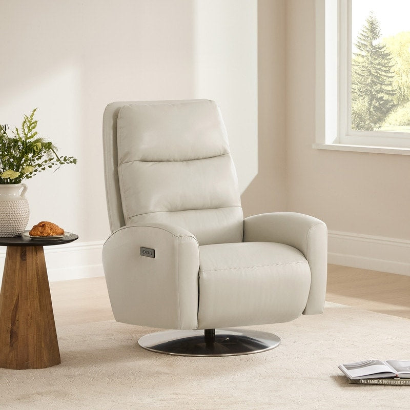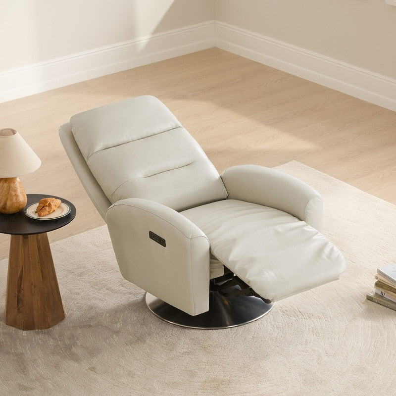 Experience ultimate relaxation with the Mateo Power Recliner Chair. Featuring dual motors, a power headrest, and premium top-grain leather, this swivel recliner offers customizable comfort and a modern Italian-inspired design. The 270° swivel base enhances functionality, while built-in USB & Type-C ports keep devices charged. A sturdy wooden frame and high-quality reclining mechanism ensure durability. Perfect for home theater seating, lounges, and living spaces.