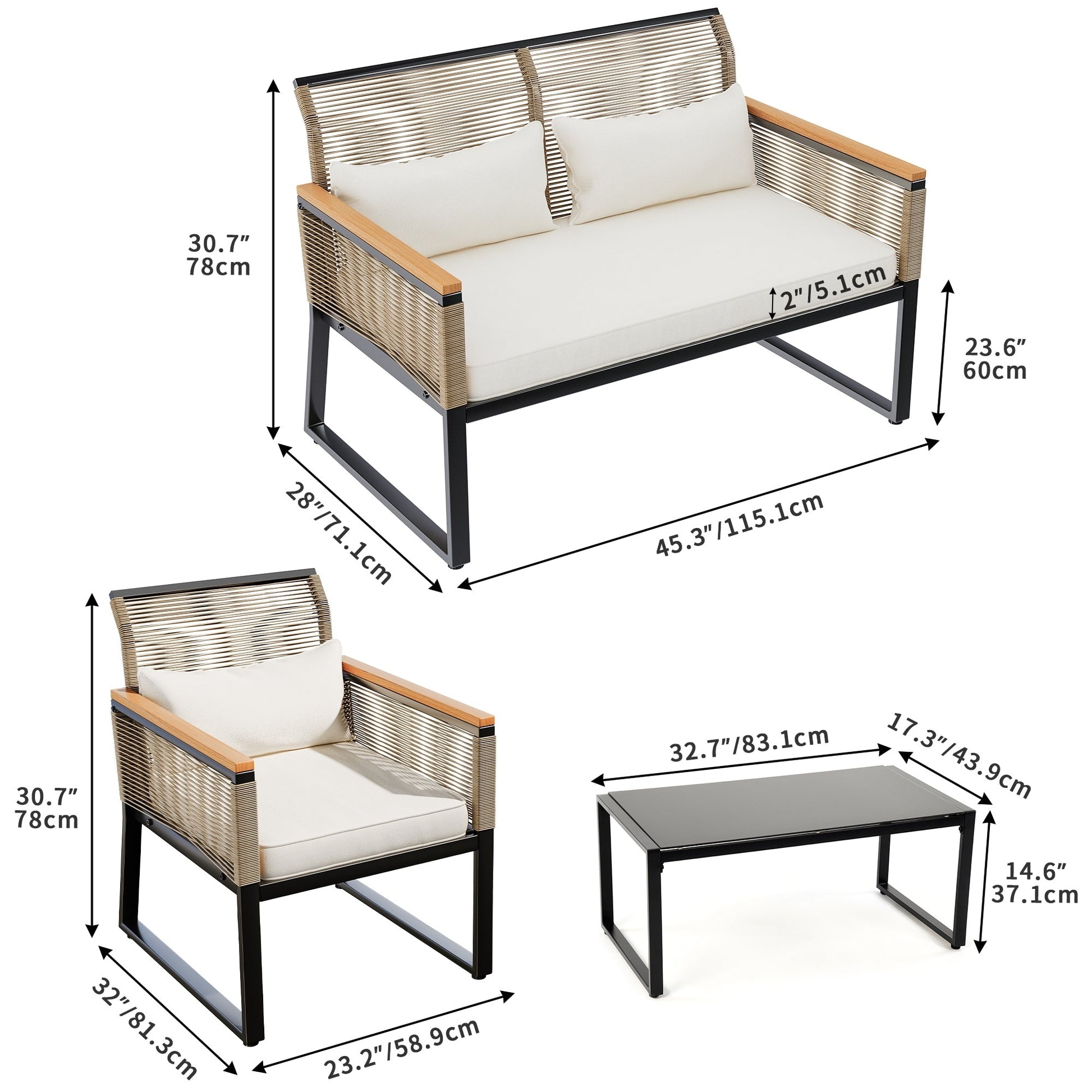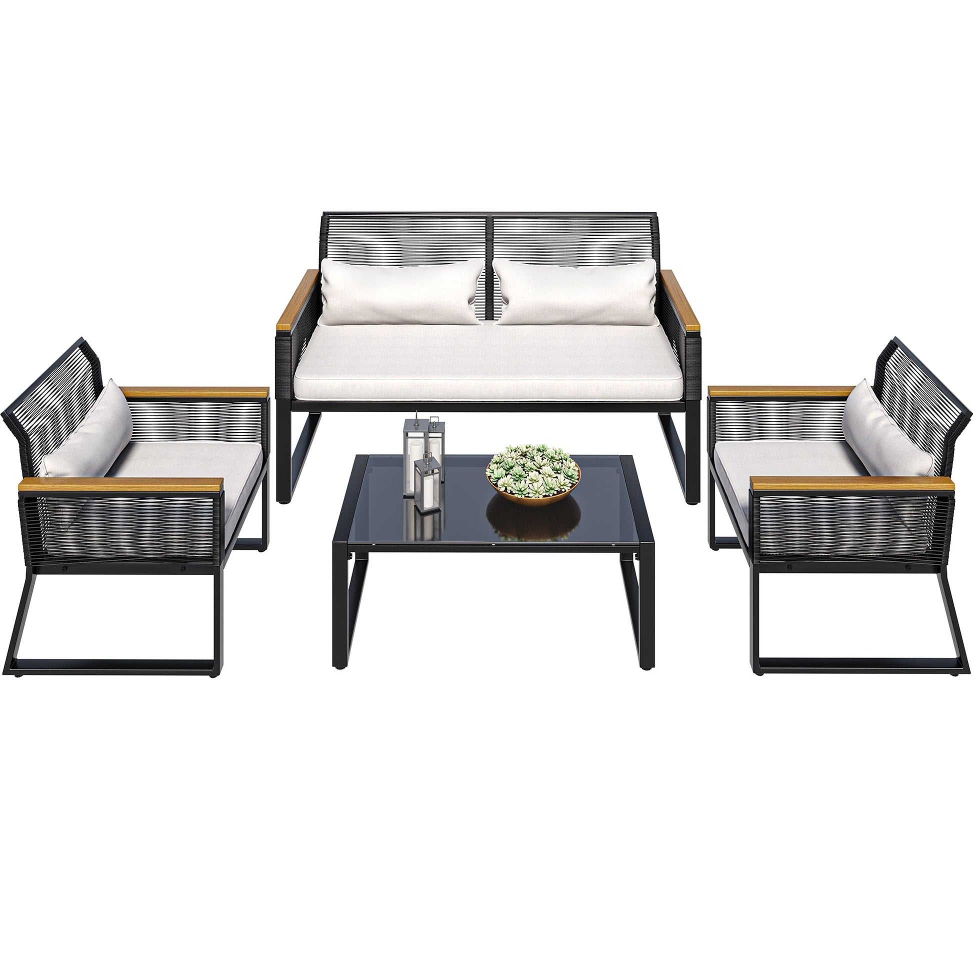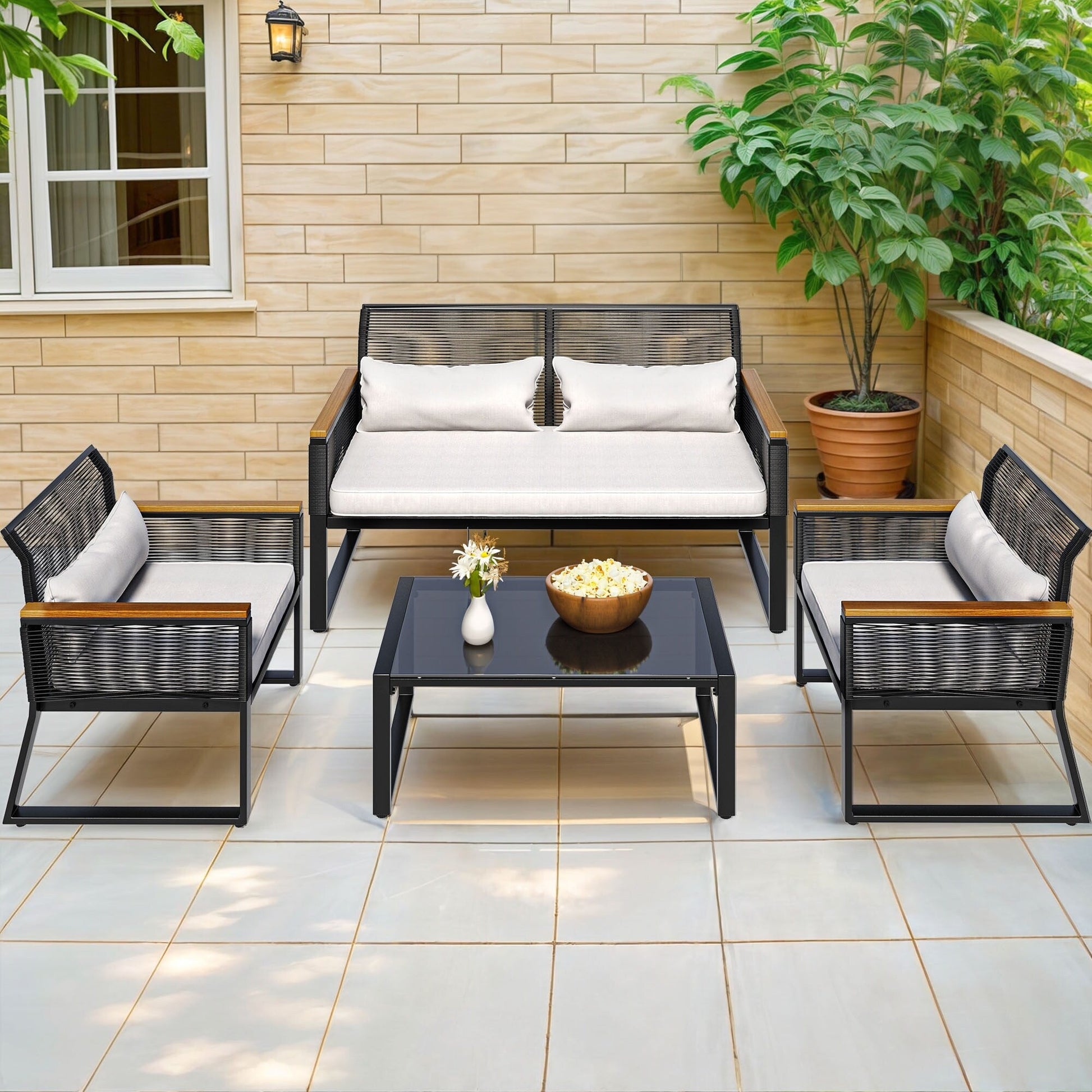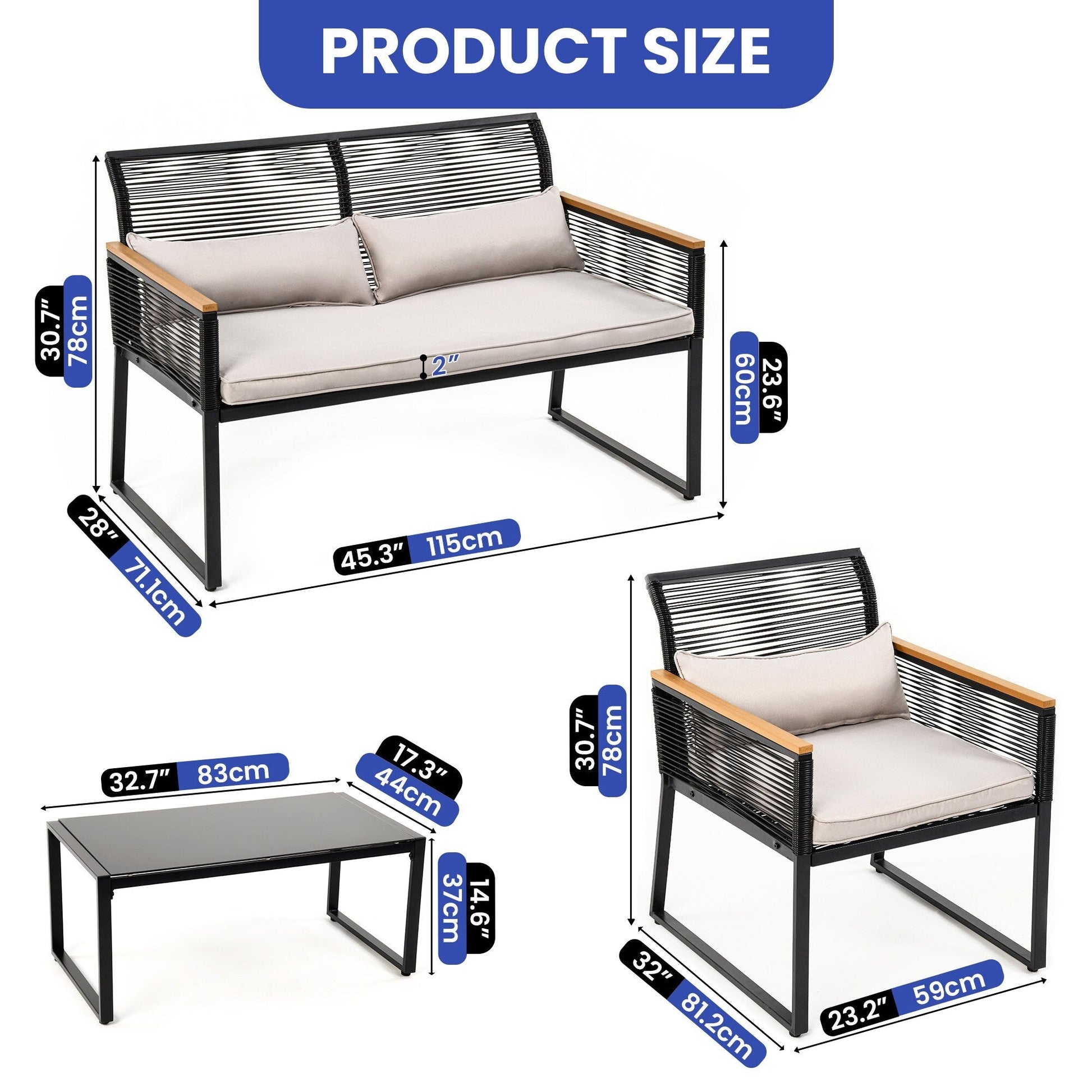 Develop a new fascination in your outdoor living space with this bistro lounge set. With our outdoor furniture's warm hues and contemporary tones coupled with the clean lines and elegance of the wicker weave, not only for outdoor, many choose to use it indoors as sectional seating. Its inviting design is perfect for lounging with a friend over a refreshing beverage and tasty finger food. The top of the coffee table is covered with a piece of glass, making them a great place to place small items such as decorations, cups, and more. Ergonomically engineered for ultimate comfort, the ergonomic armrests and seat backs ensure you will enjoy your seating all day long! Refresh your patio space with this 4-piece sofa seating group with cushions. It includes one coffee table, one loveseat, and two armchairs. The 100% polyester cushion covers in grey can be removed through a zipper for quick cleaning. This set is great for year-round use. Full assembly is required upon arrival.