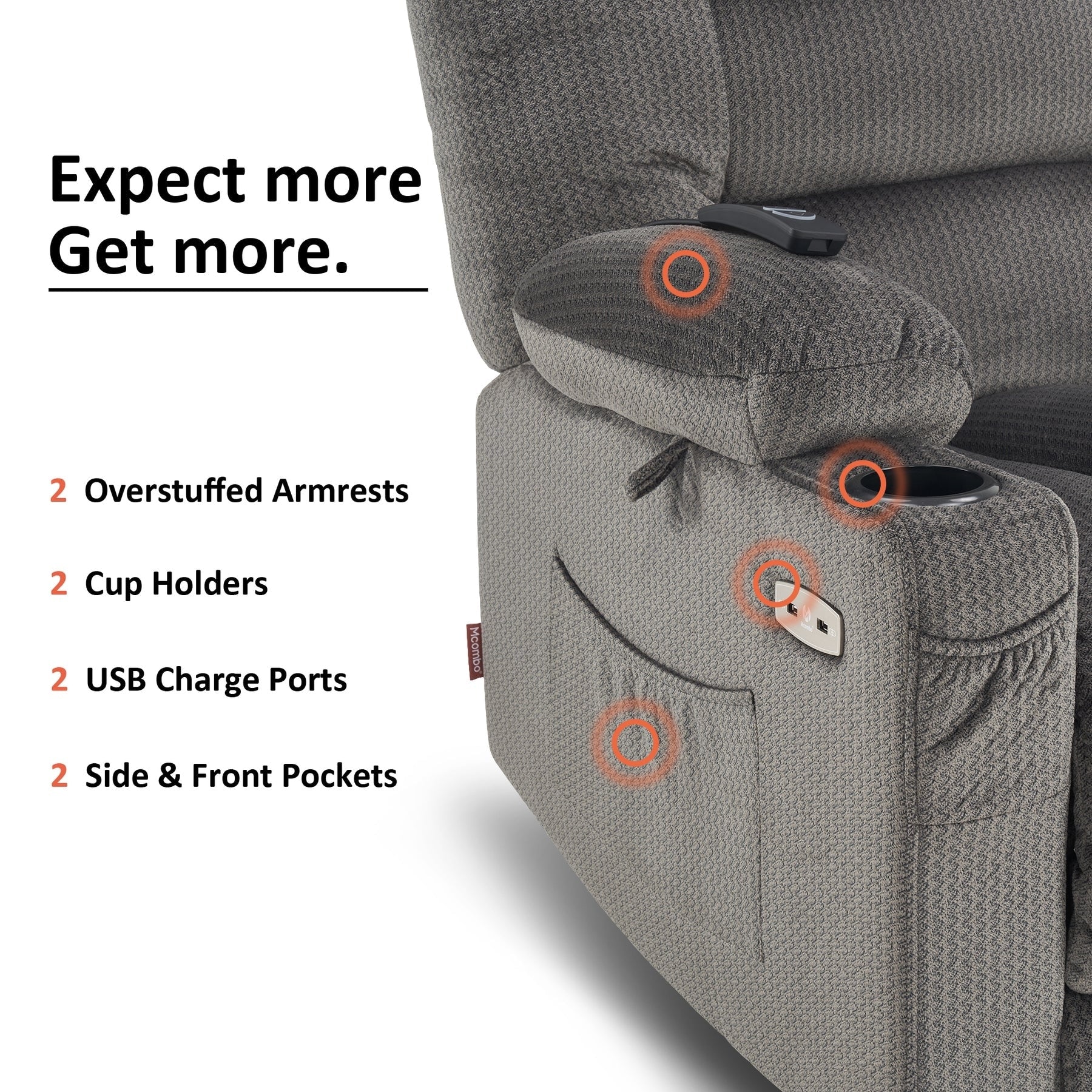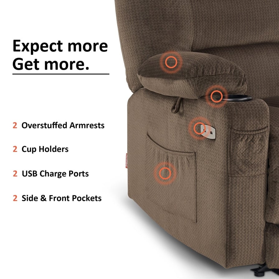 2 USB Ports, Side Pockets, Cup Holders: With the help of cup holders and pockets, keep your drink and magazines close by. Meanwhile, USB charging ports help to keep your electronic devices powered without leaving the recliner's comfort. (ONLY for low-power devices, such as mobile phone.)
