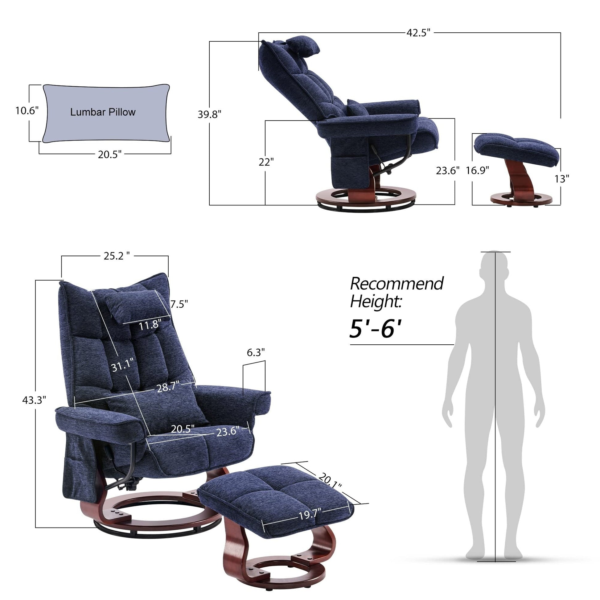MCombo Swivel Recliner with Ottoman and Neck Pillow, Chenille Fabric