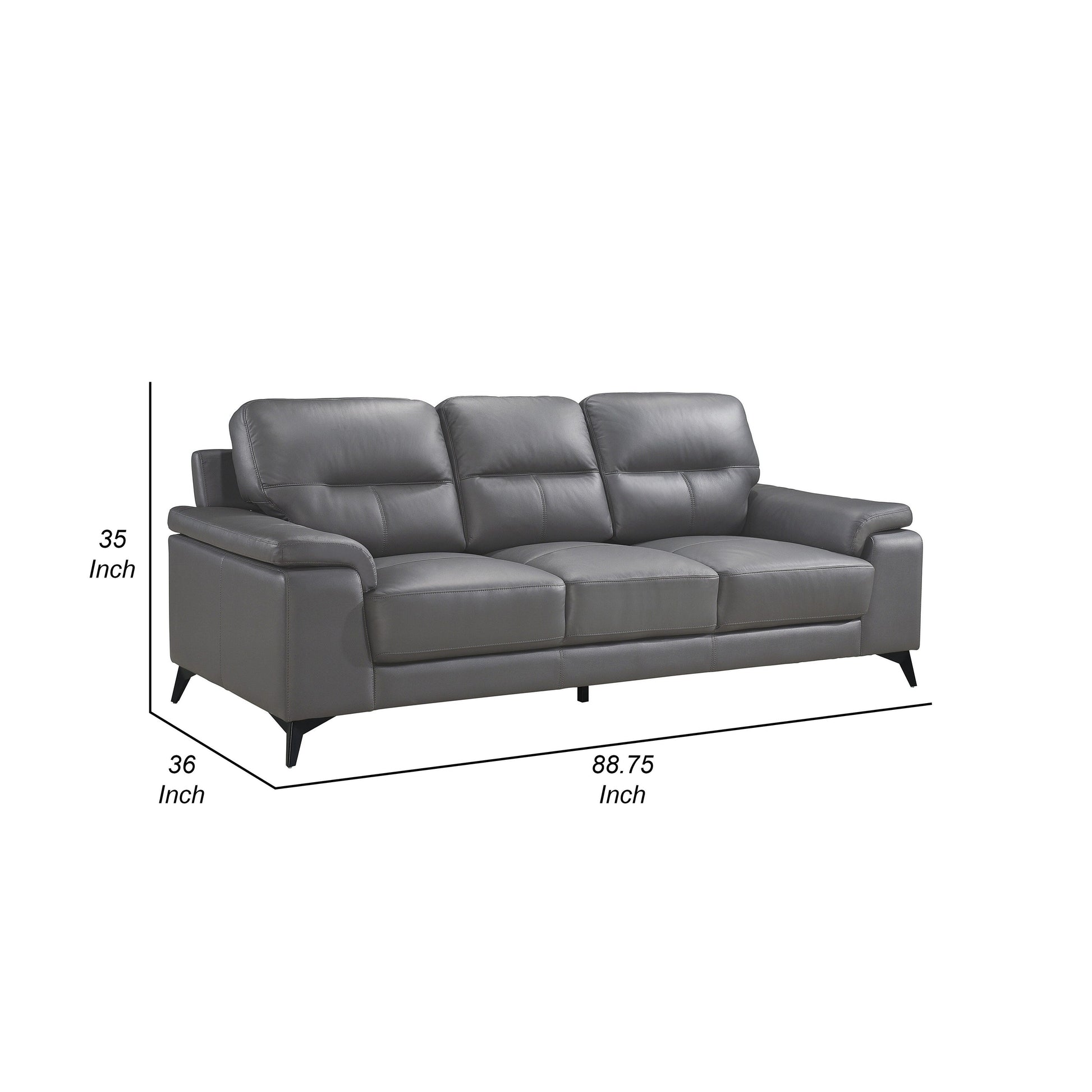 Upgrade your living space with the sleek modern lines of this sofa. Built on a solid wood and plywood frame, it features high-density foam seat cushions and a dark gray top grain leather with a durable faux leather match on sides and back. Contoured pillow-top arms and black metal legs bring a bold, streamlined finish. Explore our Mica collection for more options.