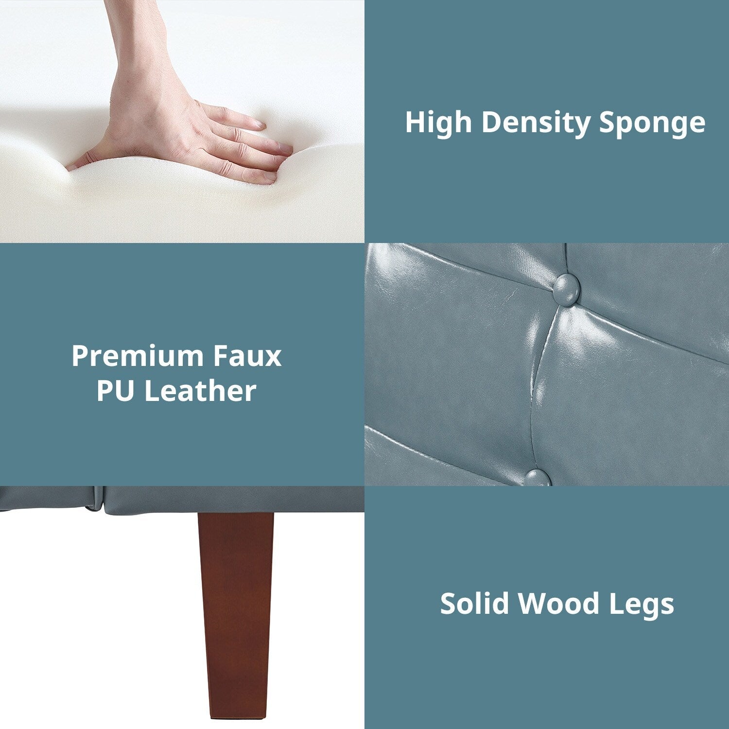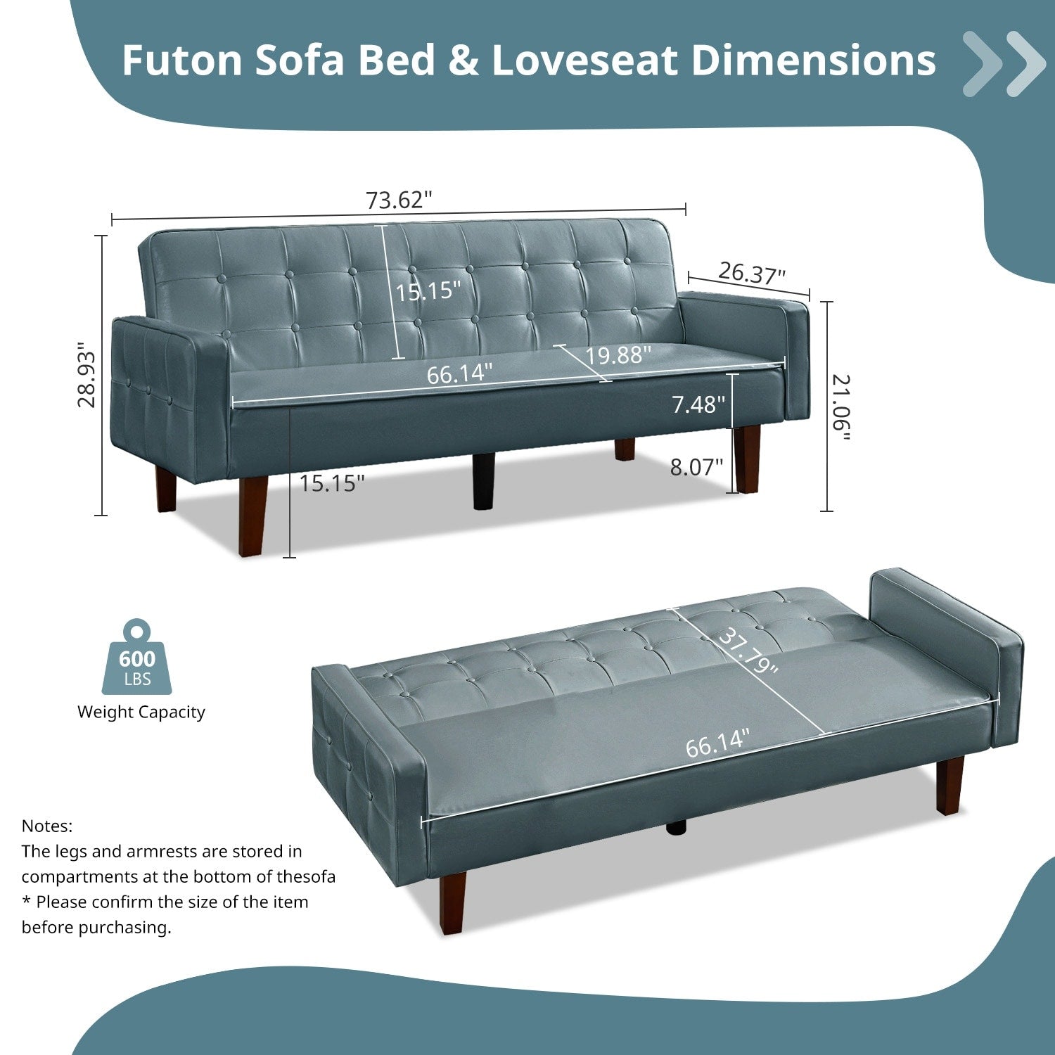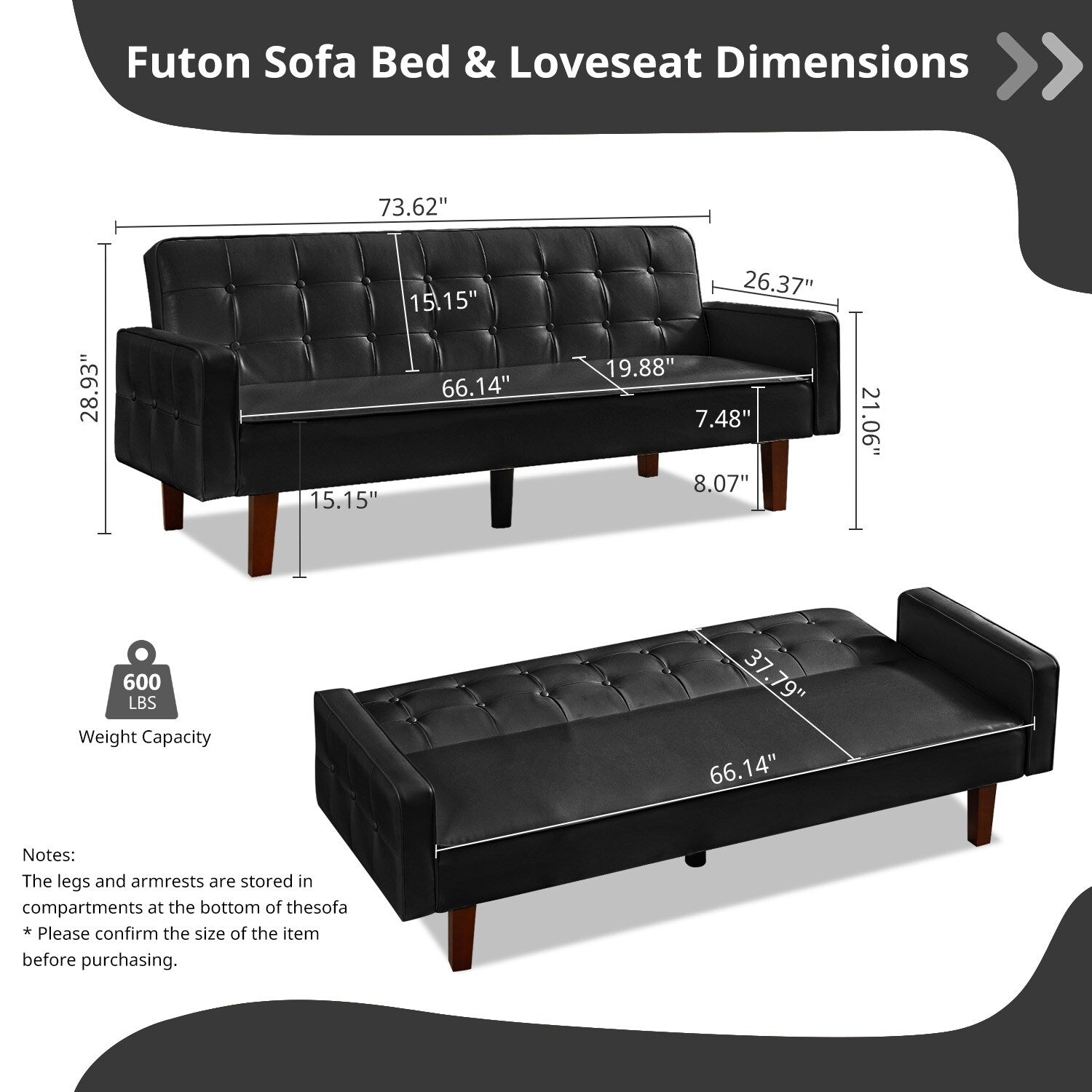 Sturdy & Durable : These comfy skin frinedly futon couches are structured with solid Eucalyptus wood and are reinforced by 4 solid rubber wood side legs and a strong plastic middle leg,each of these faux leather futons sofas can bear up to 600 LBS in terms of weight capacity. The wooden legs add bit of vintage farmhouse atmosphere into this futon sofa