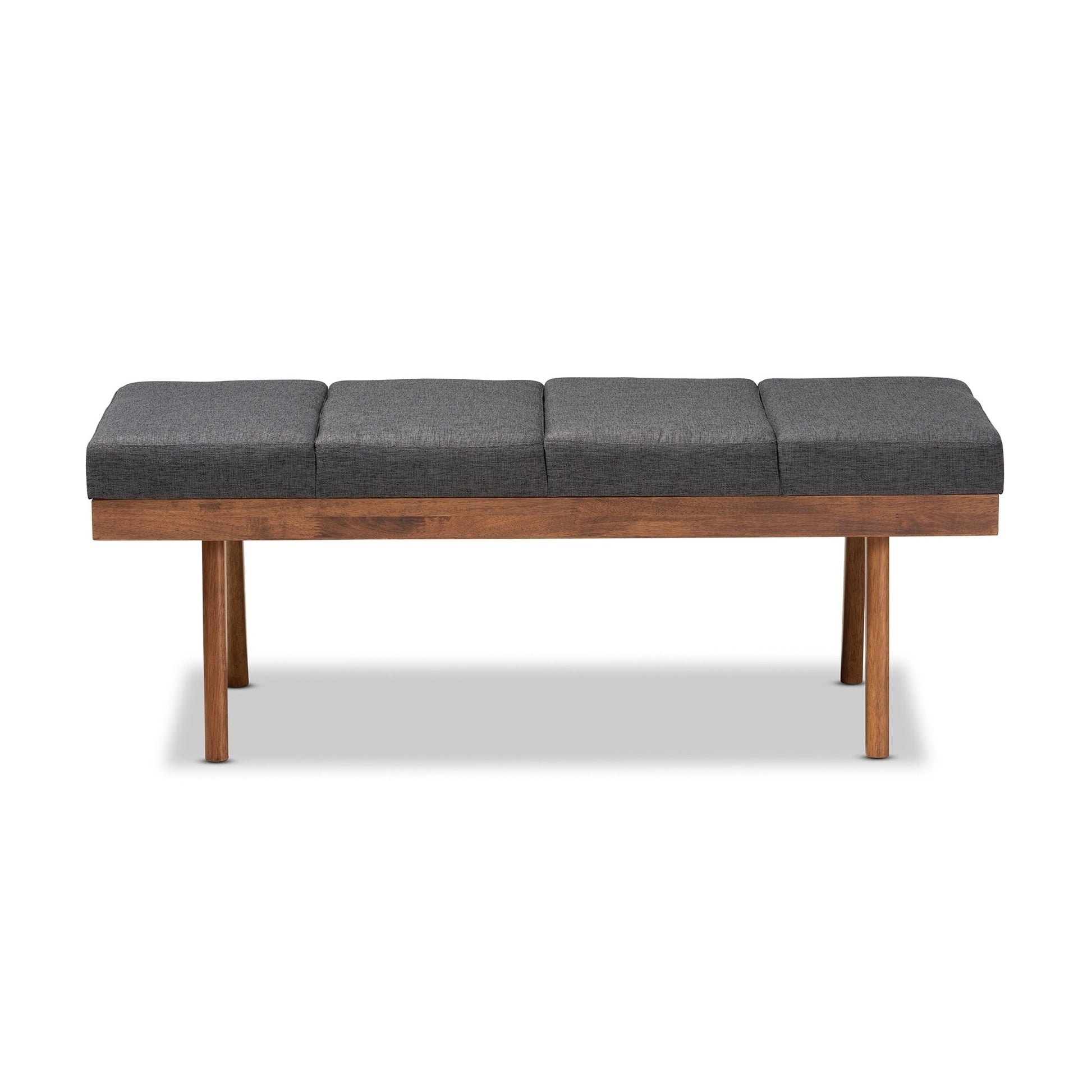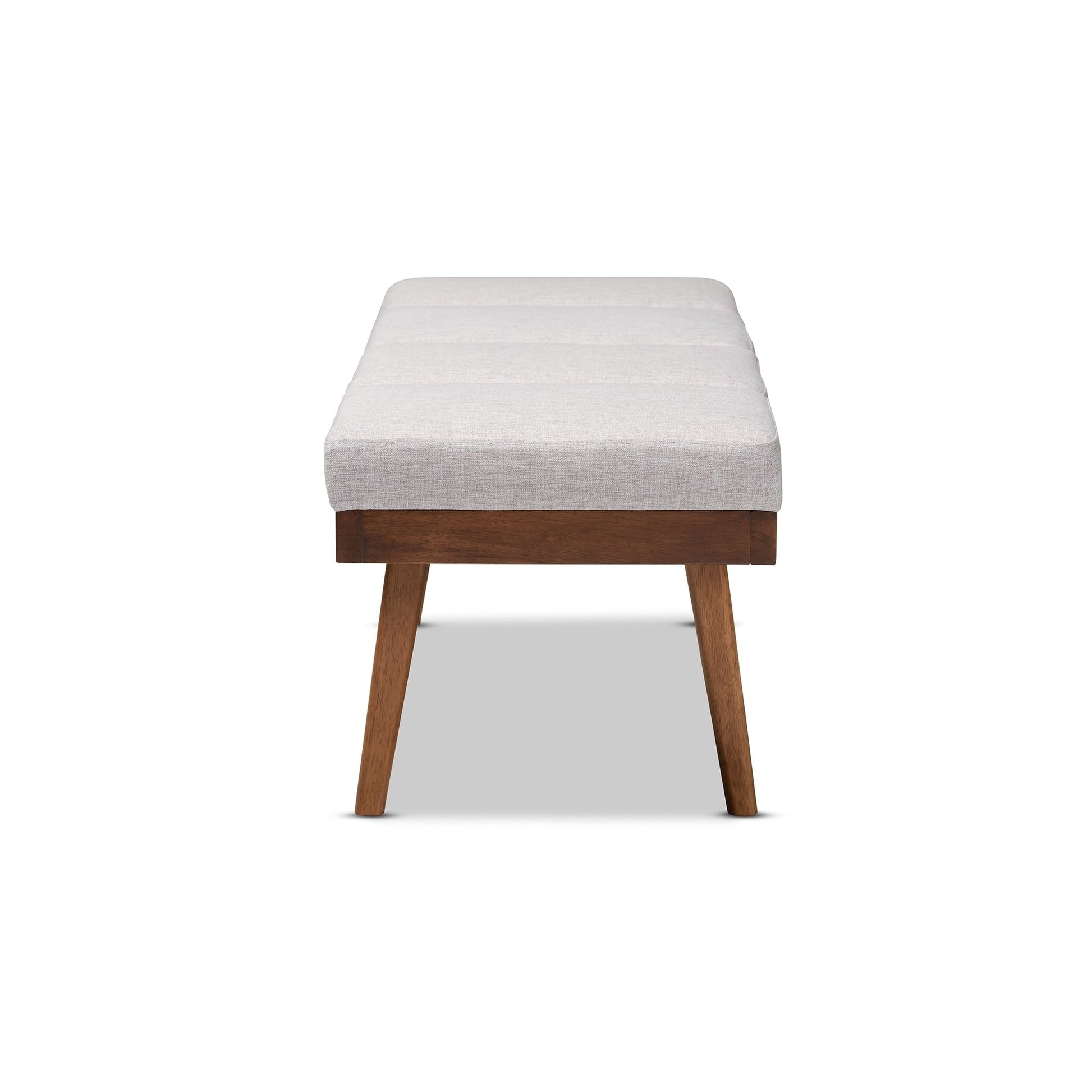 Give your entryway or bedroom a touch of retro charm with the Larisa bench. This wood bench is upholstered in a soft, durable neutral polyester fabric that complements the walnut brown finish on the wood. Ample seating comfort is provided by plush foam padding, further enhanced by the channel tufting.