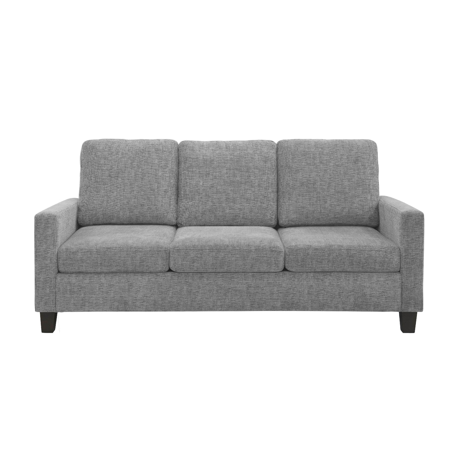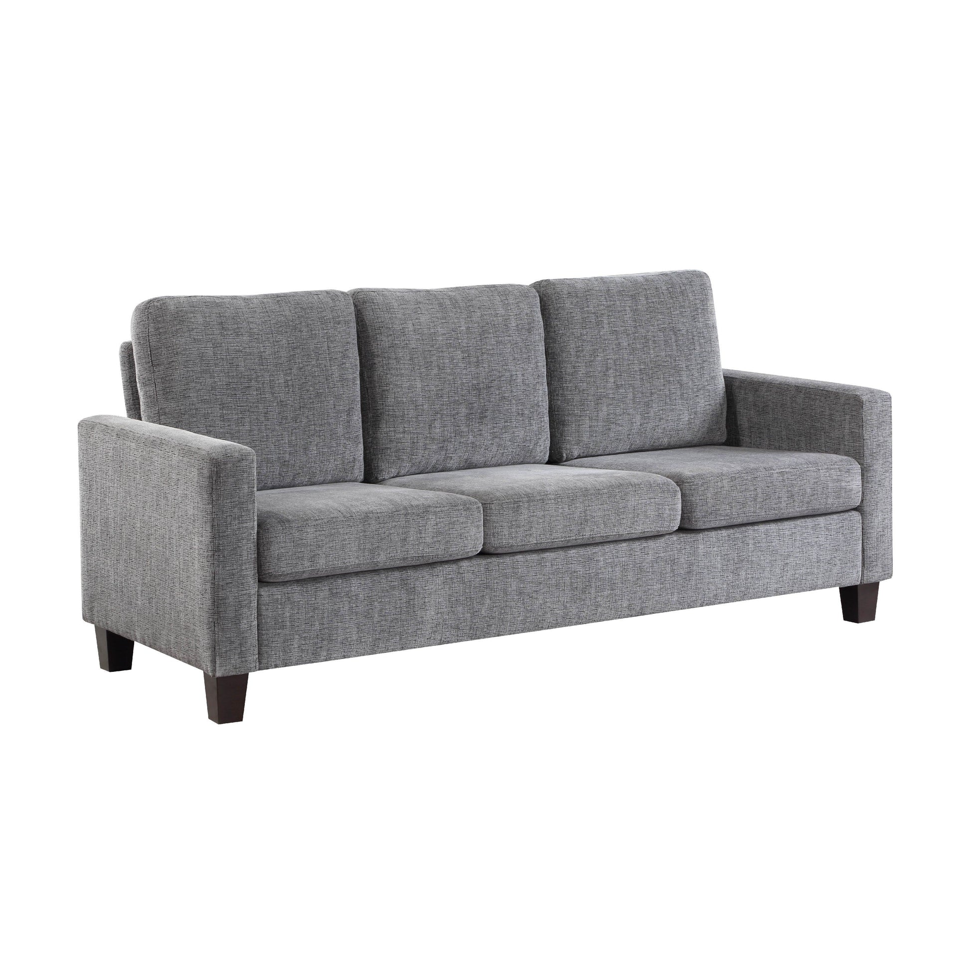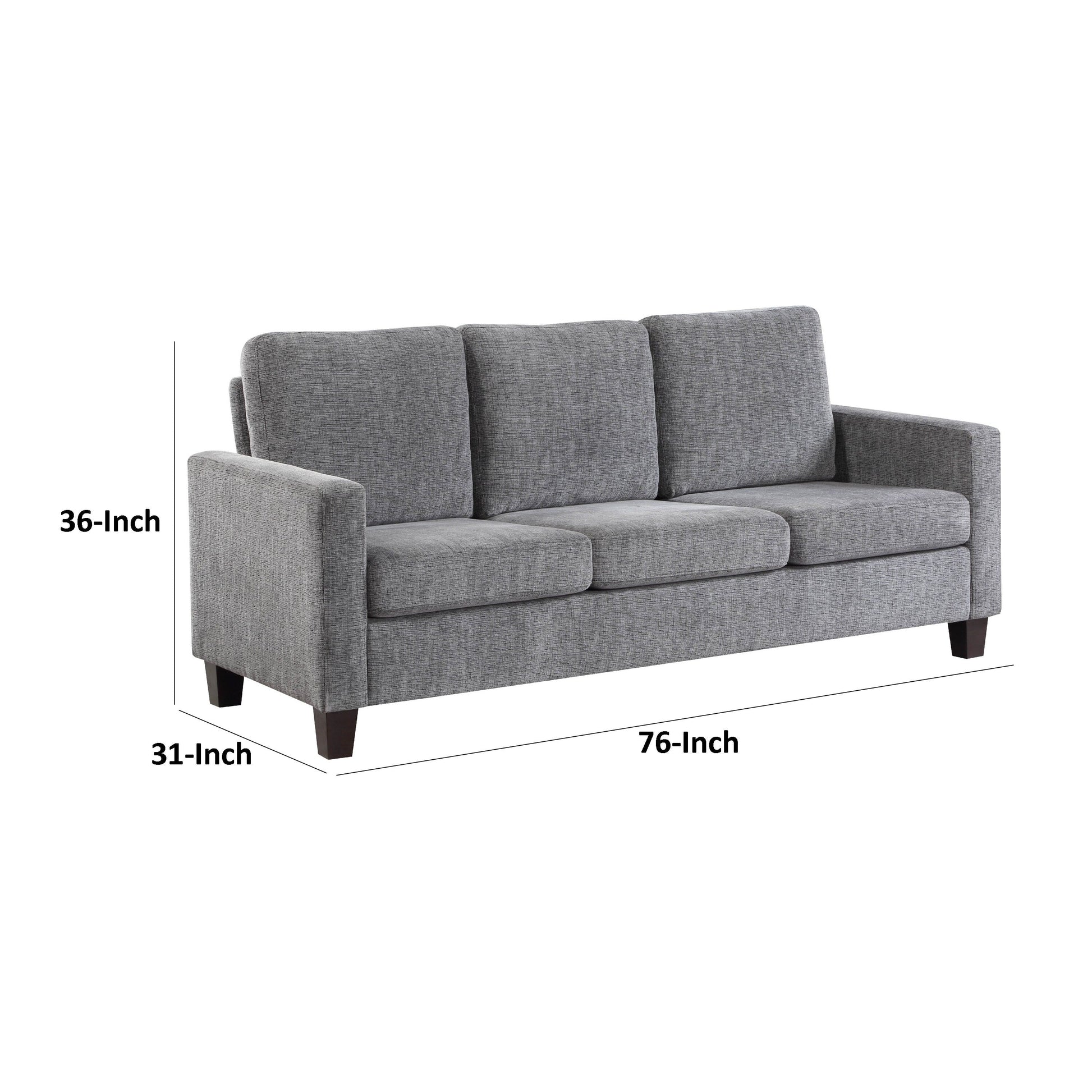 Combine comfort and sophistication with this versatile sofa, ideal for both transitional and modern interiors. Constructed with a strong and durable solid wood frame, it features fabric upholstery in a gray finish. Track armrests and tapered black legs enhance both comfort and visual appeal. Explore our Mihi collection for more options.