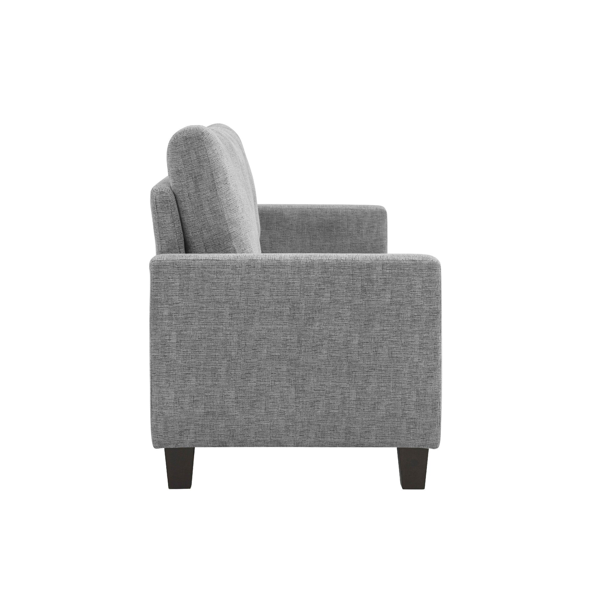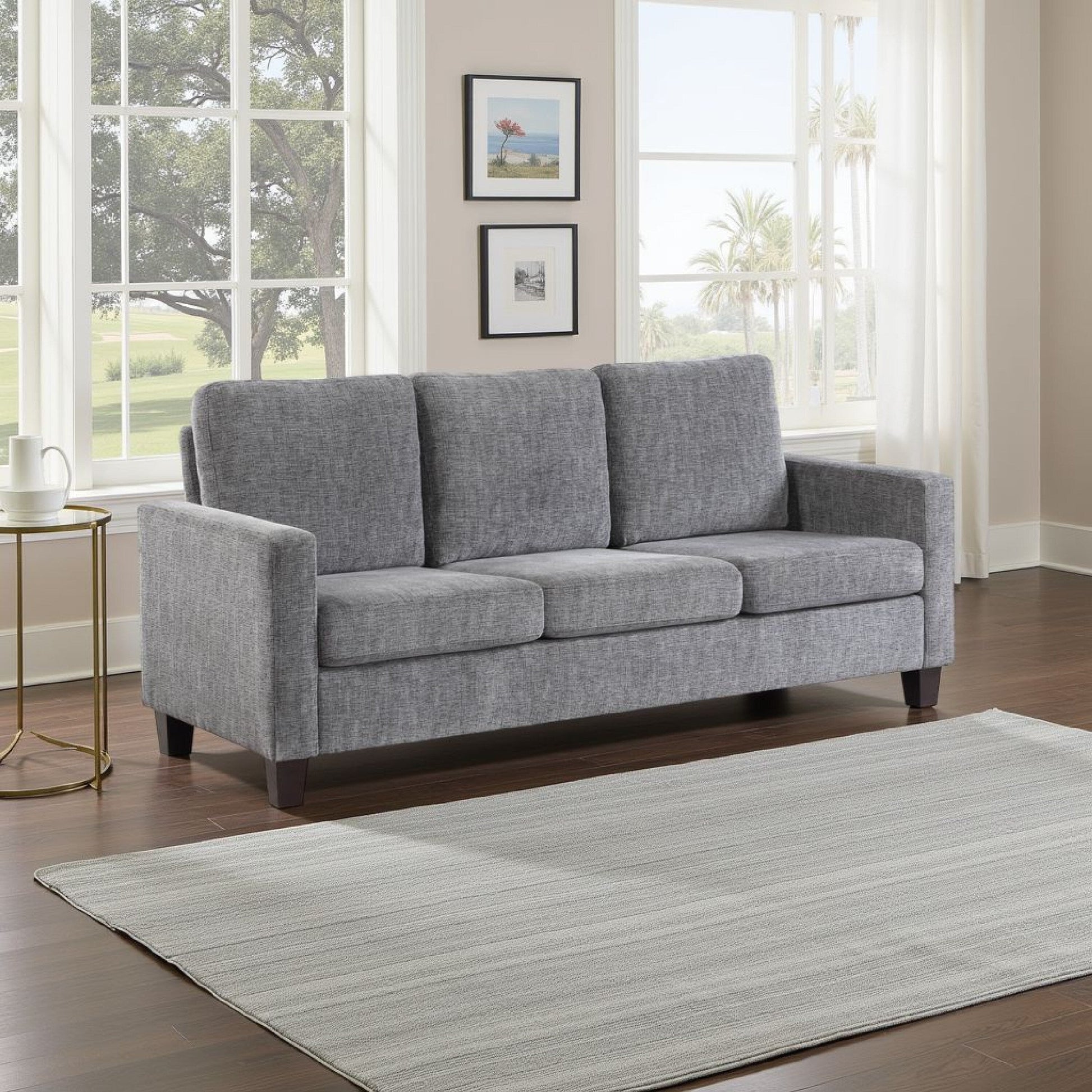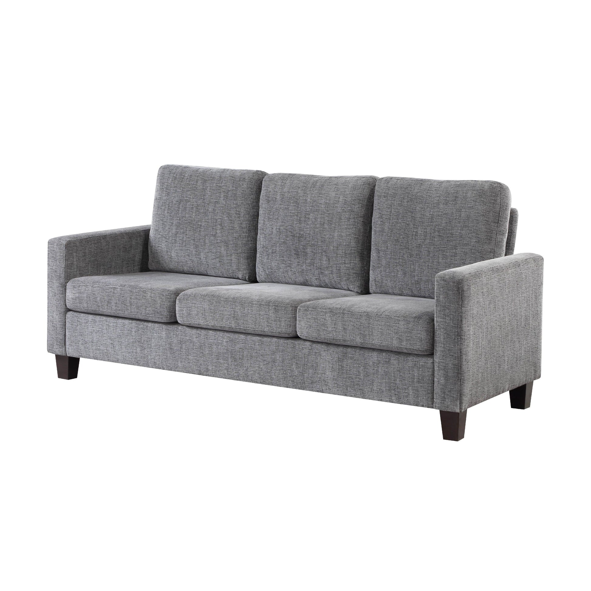 Combine comfort and sophistication with this versatile sofa, ideal for both transitional and modern interiors. Constructed with a strong and durable solid wood frame, it features fabric upholstery in a gray finish. Track armrests and tapered black legs enhance both comfort and visual appeal. Explore our Mihi collection for more options.