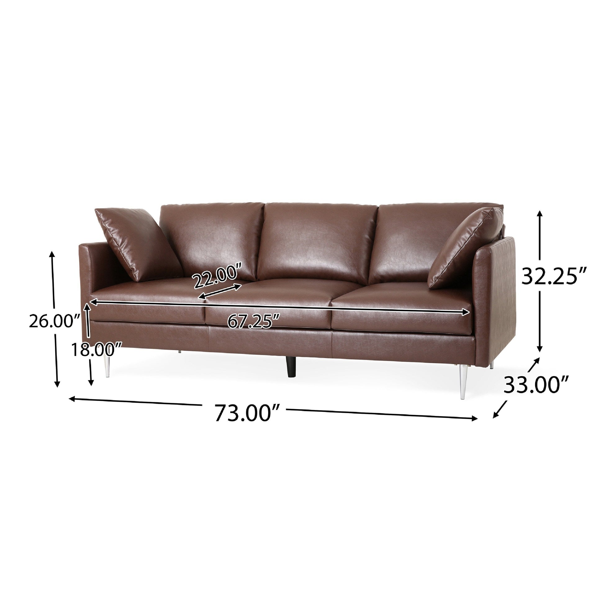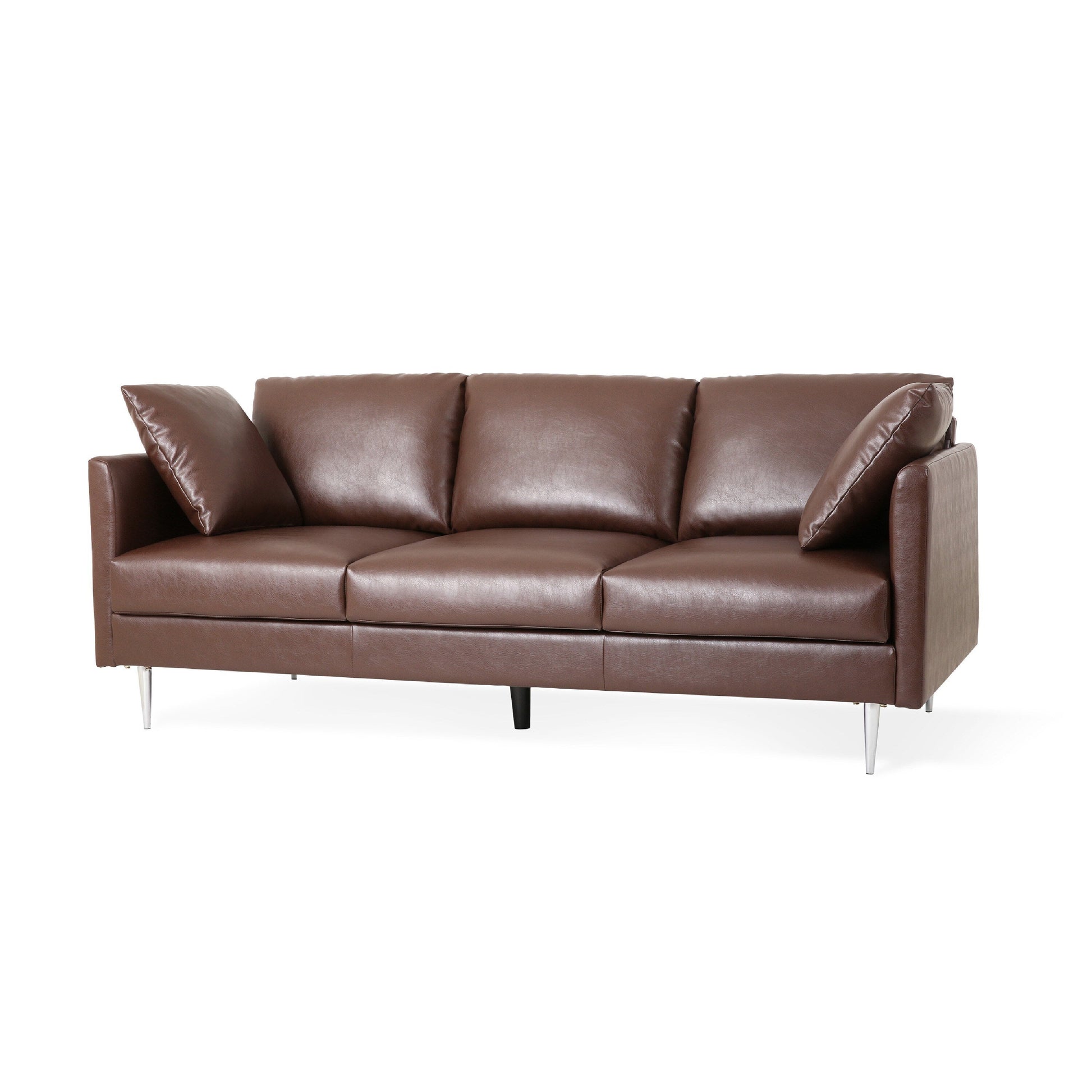 Sleek lines meet functional comfort in this Miry three seater sofa, upholstered in rich dark brown PU leather for a sophisticated touch. The clean silhouette is enhanced by removable back cushions and plush seat padding, offering flexible lounging. With a sturdy wood frame and compact size, it's ideal for both modern living rooms and stylish study spaces. Explore more in our Miry collection.