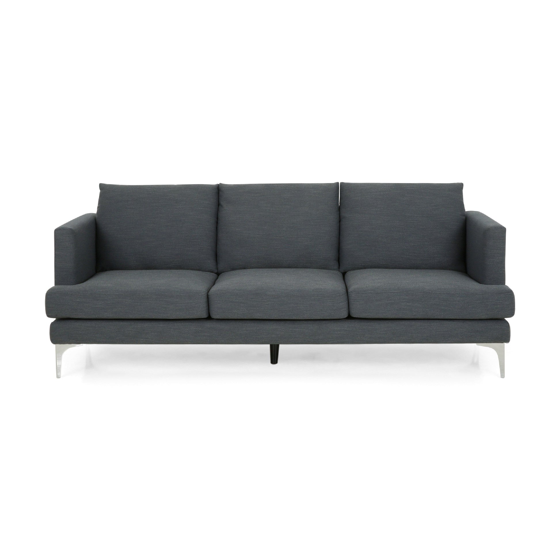 Upgrade your living space with our Miry three seater sofa. Upholstered in a dark gray textured fabric, it features generous cushioning and supportive seating for cozy lounging. The clean-lined silhouette with slim metal legs offers a refined yet contemporary look. With its soft upholstery and durable construction, it is perfect for comfort and functionality. Explore more in our Miry collection.