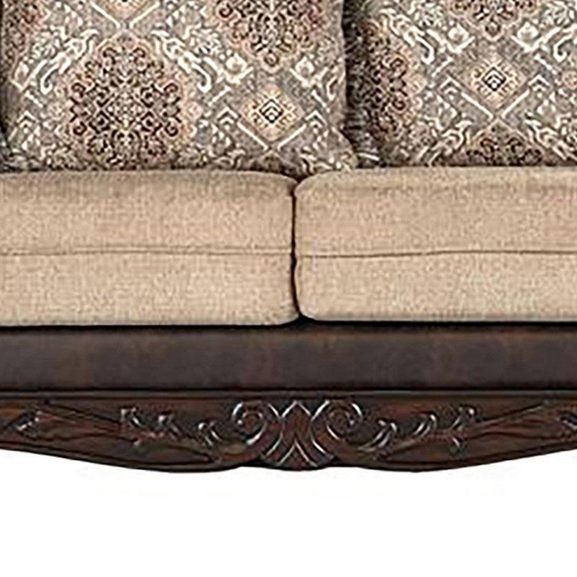 Indulge in plush comfort and timeless elegance with this traditional upholstered sofa. Built with a durable wood frame, it features intricate carved accents on its apron, legs, and rolled arms. The sofa combines multiple upholsteries, with dark brown leatherette adorning the arms and light brown fabric on the seats. Explore our Miva collection for more options.