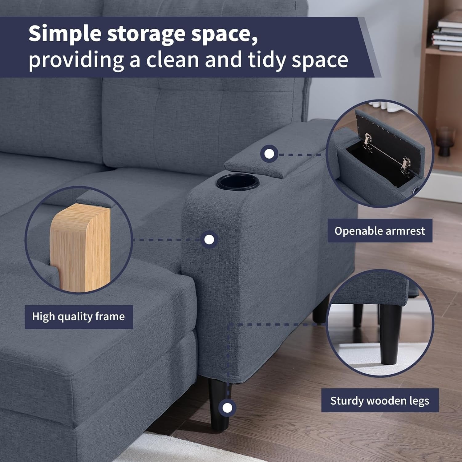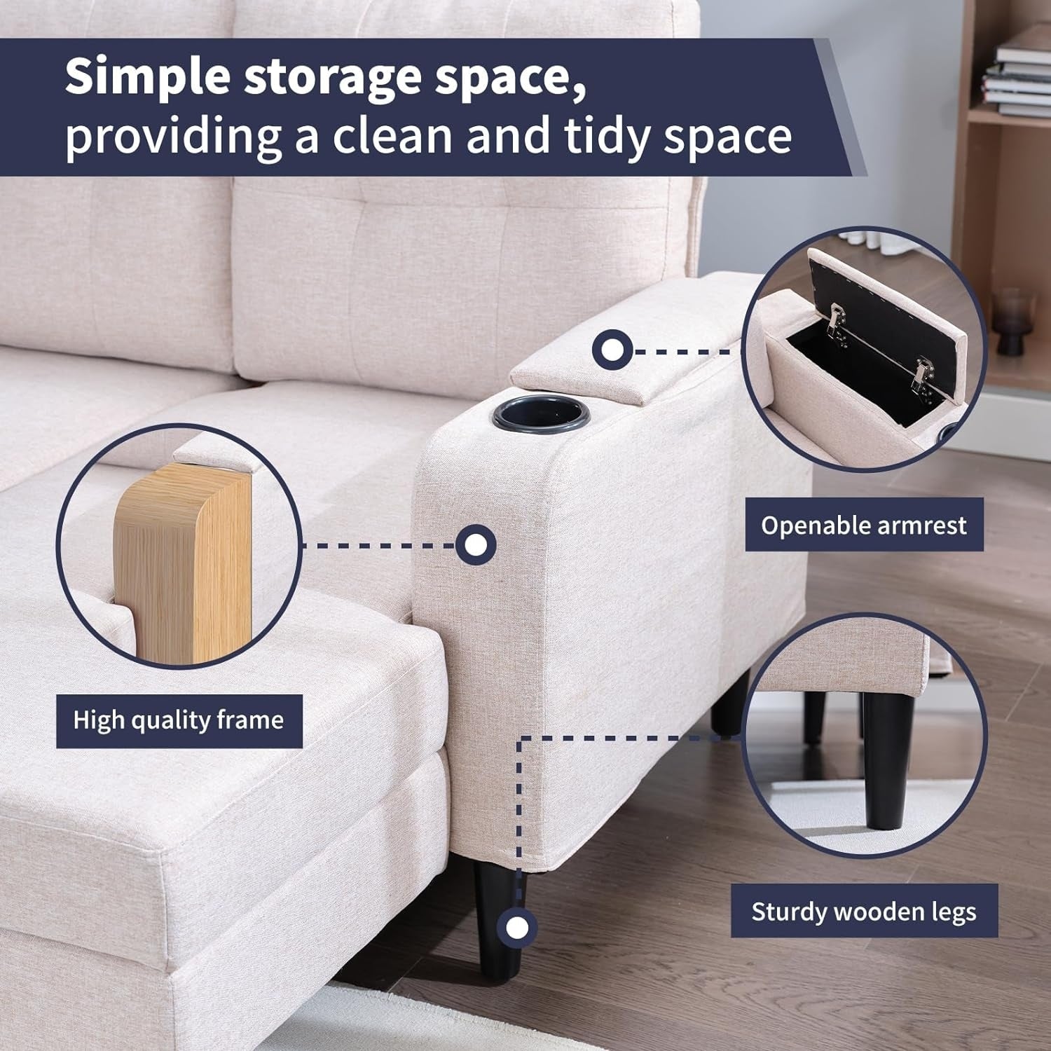 🔔【Clever Storage Spaceã€? The armrests on both sides of the couch are equipped with 2 cup holders, allowing you to relax and enjoy your drinks to the fullest. In addition to the storage space inside the sofa,the armrests on both sides also have hidden storage space that can be opened outward to store excess debris, remote controls, or books.