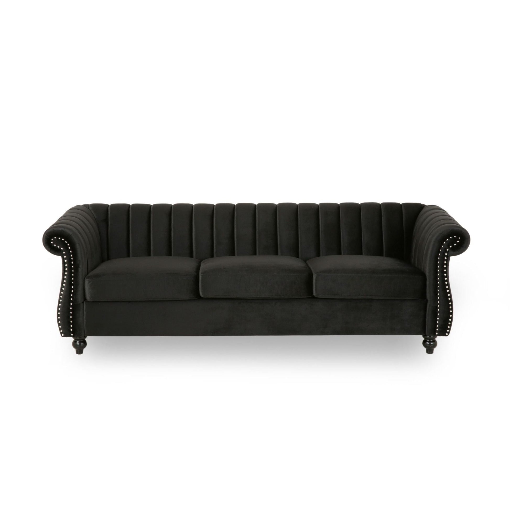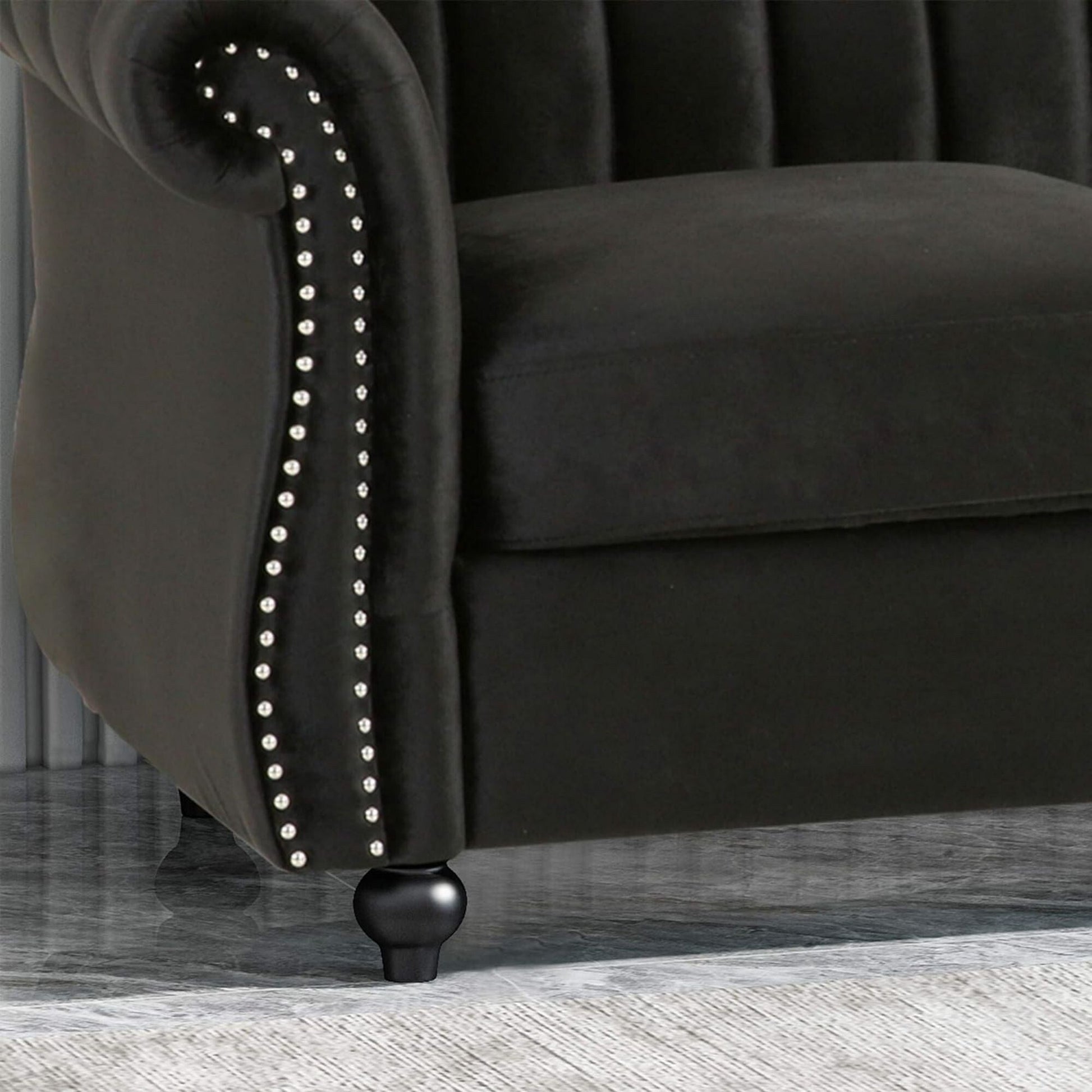 • MODERN GLAM: Our sofa showcases smooth velvet textures and dazzling silver accents that pair seamlessly with clean, straight lines for an upscale modern glam look. Influenced by traditional Chesterfield style, this piece brings an atmosphere of luxury with channel tufting, nailhead accents, scrolled arms, and turned legs.