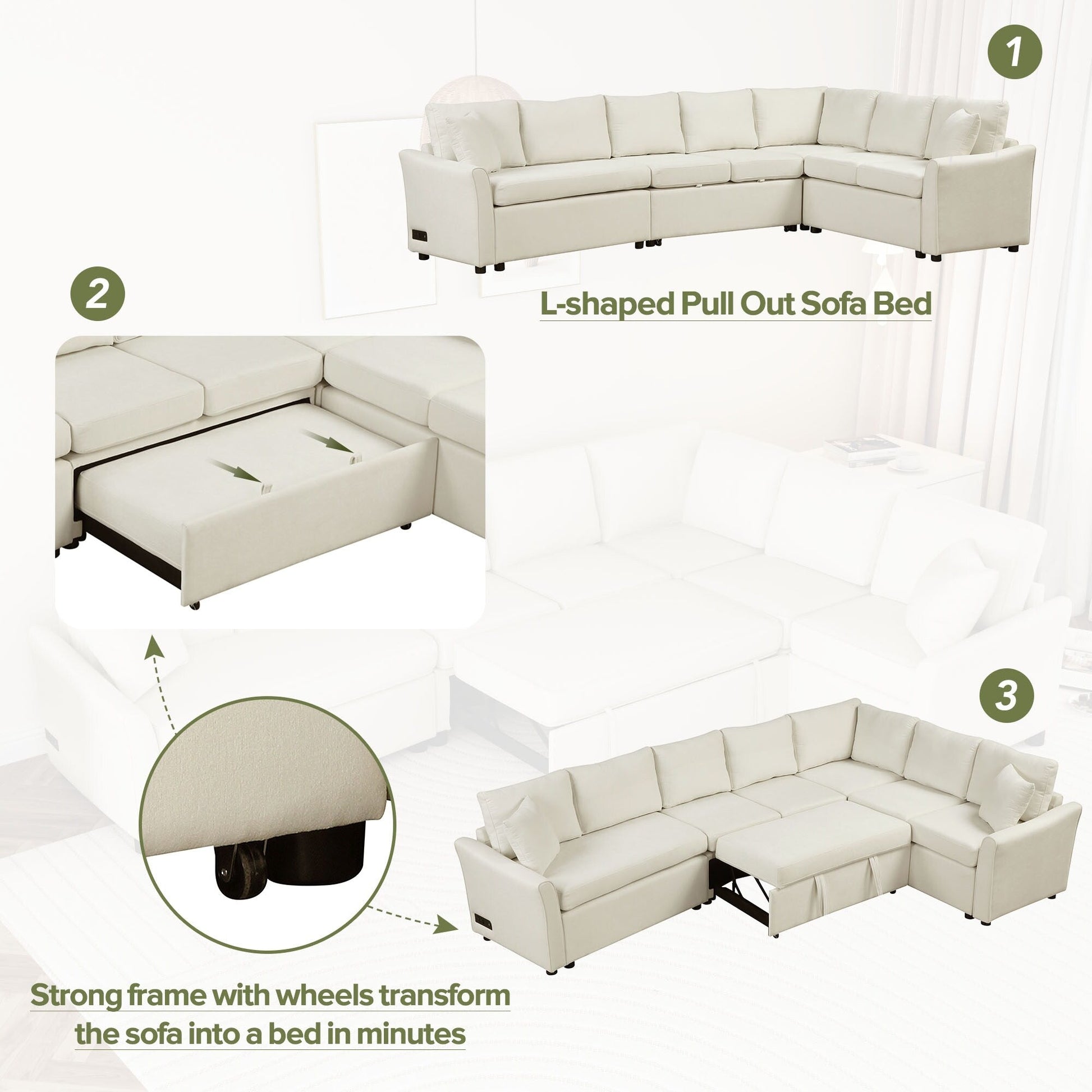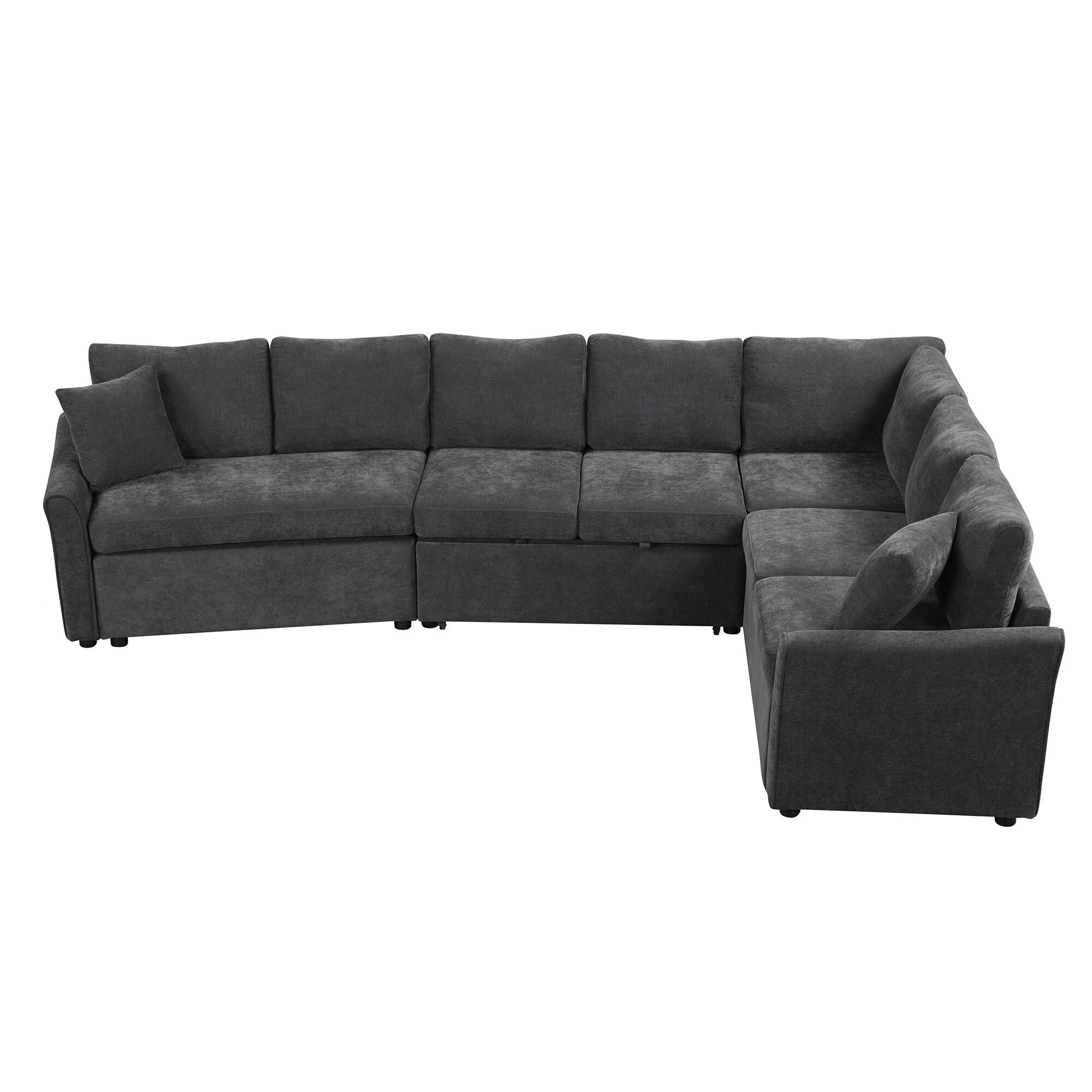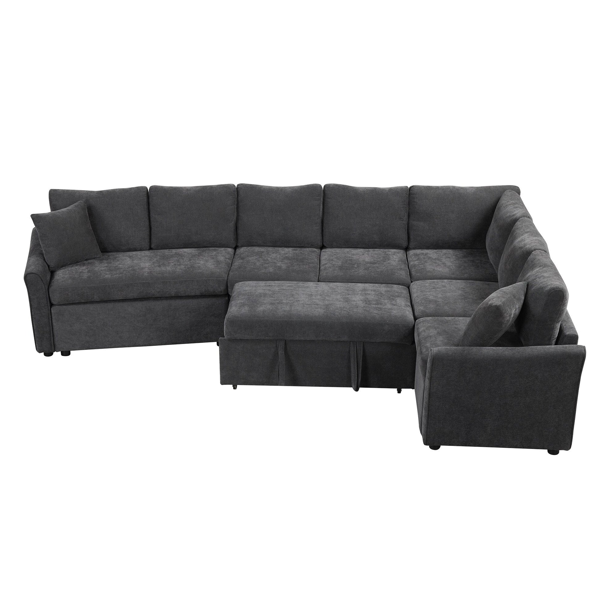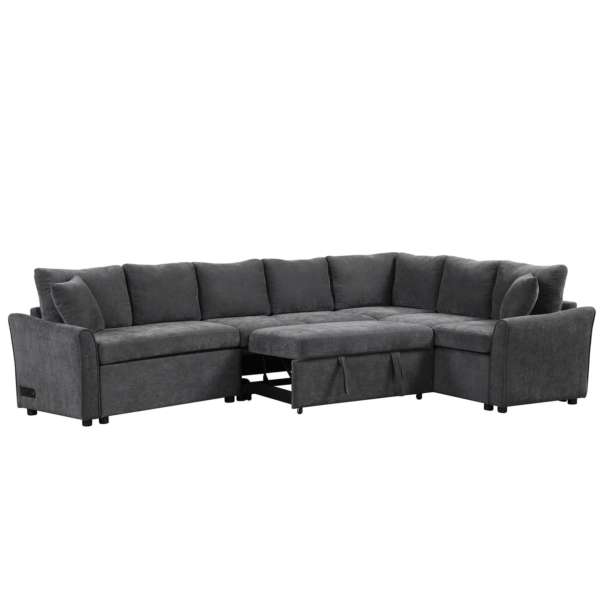 This L-shaped chenille sectional features a pull-out bed, USB ports, and power outlets for multifunctional comfort. Designed to save space while offering extended seating, it easily transforms into a bed for guests and includes high-density cushions for reliable support.
