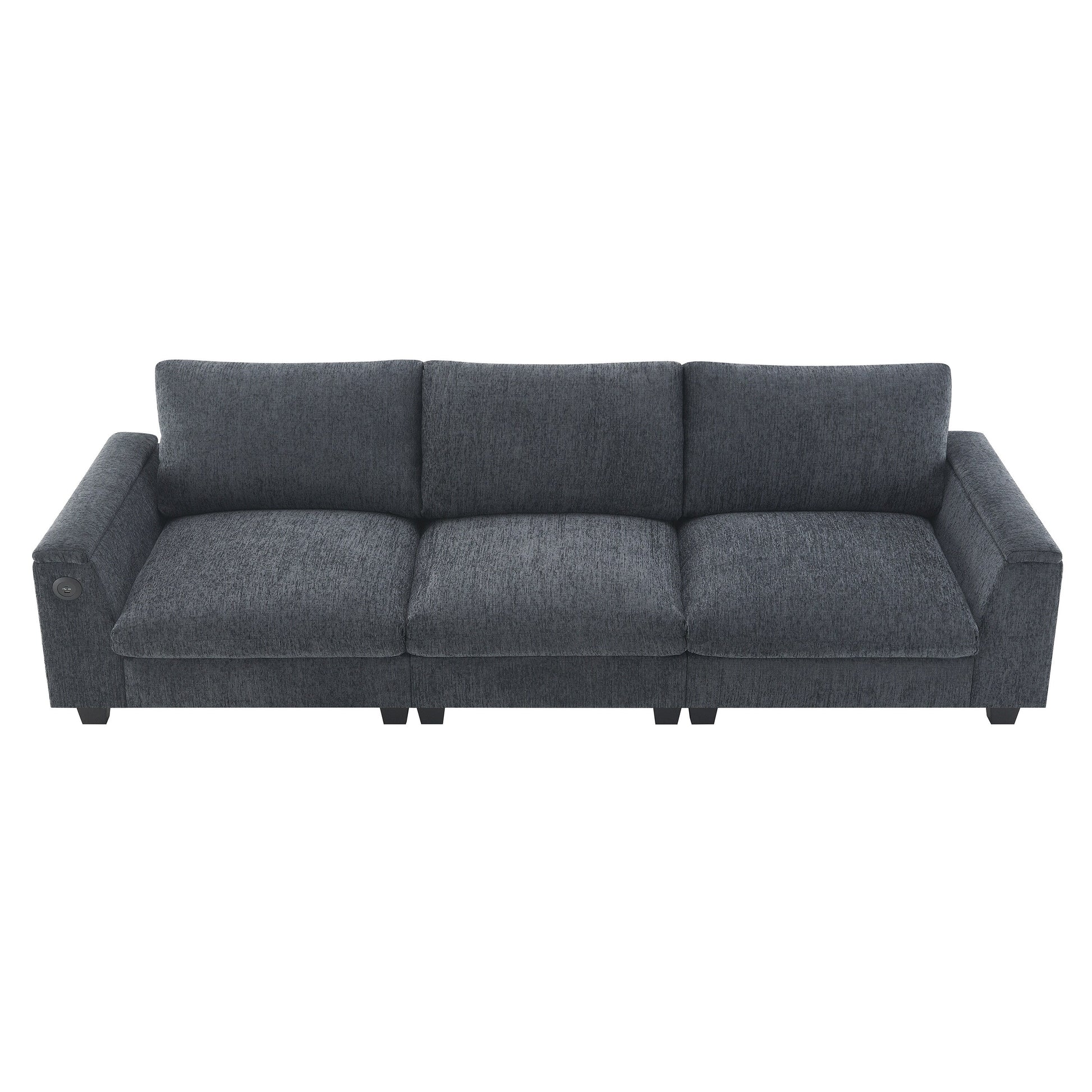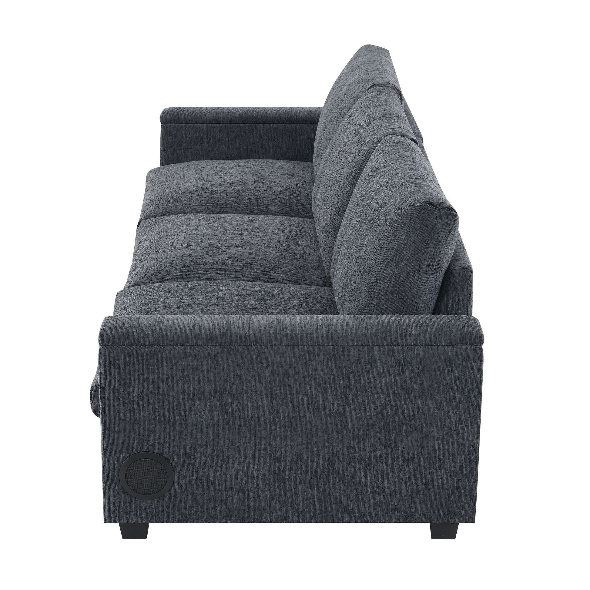 This chenille upholstered sofa blends tech-friendly features with cozy comfort. It includes a fold-down table, Bluetooth speakers, USB charging, hidden armrest storage, and built-in cupholders. The wide 28-inch seats make it ideal for relaxing in modern living rooms or apartments.
