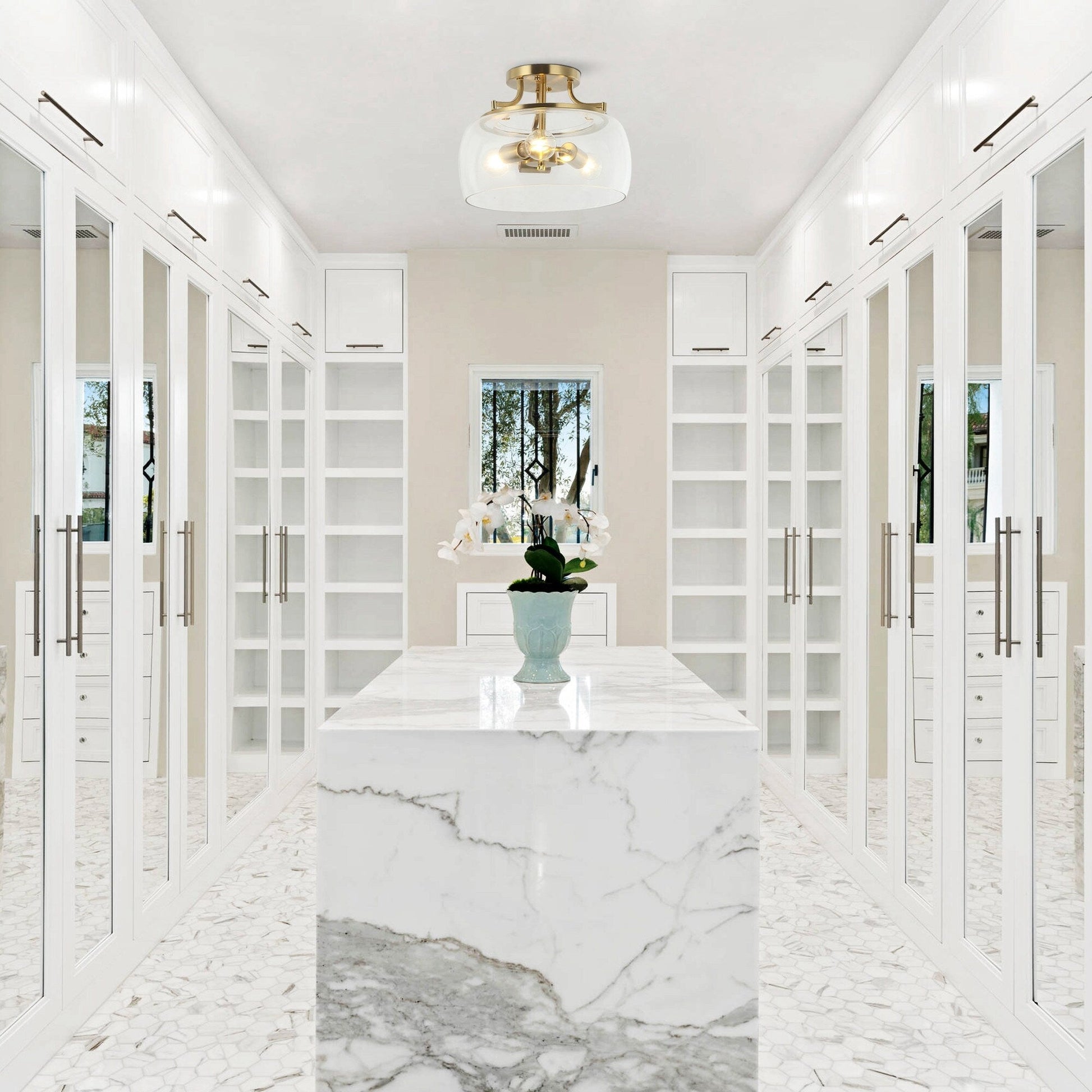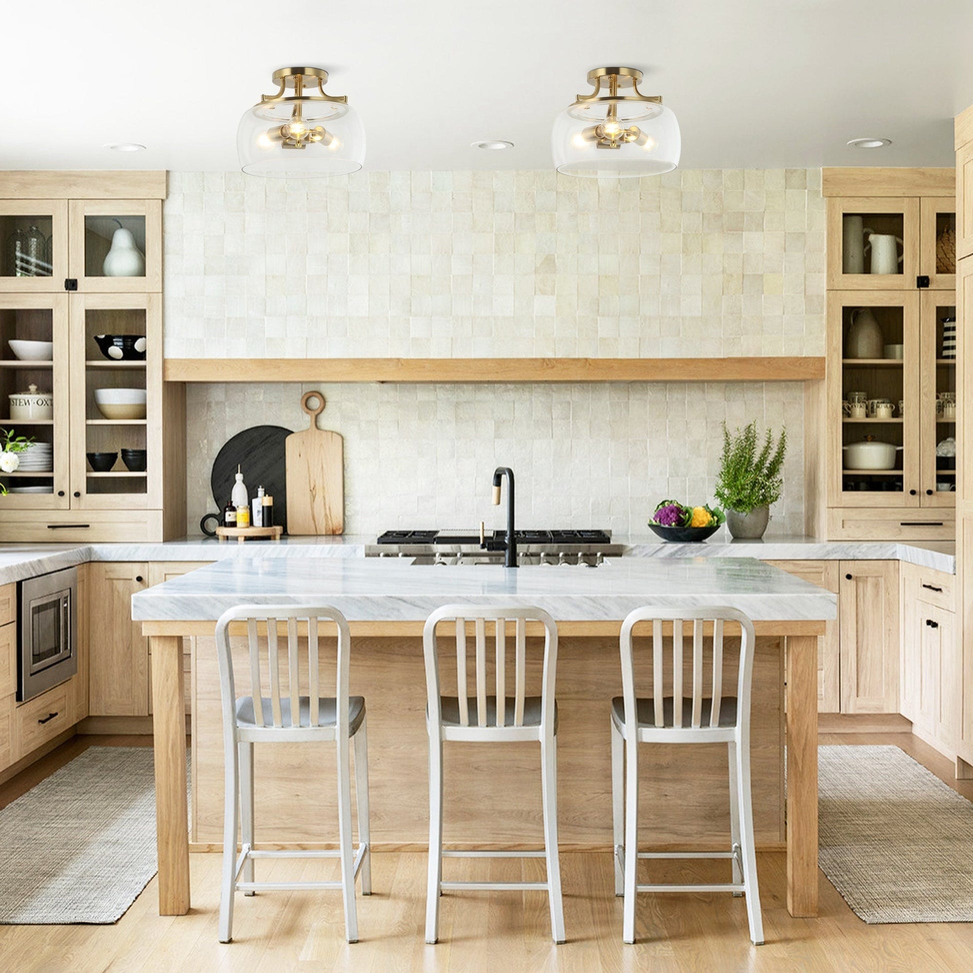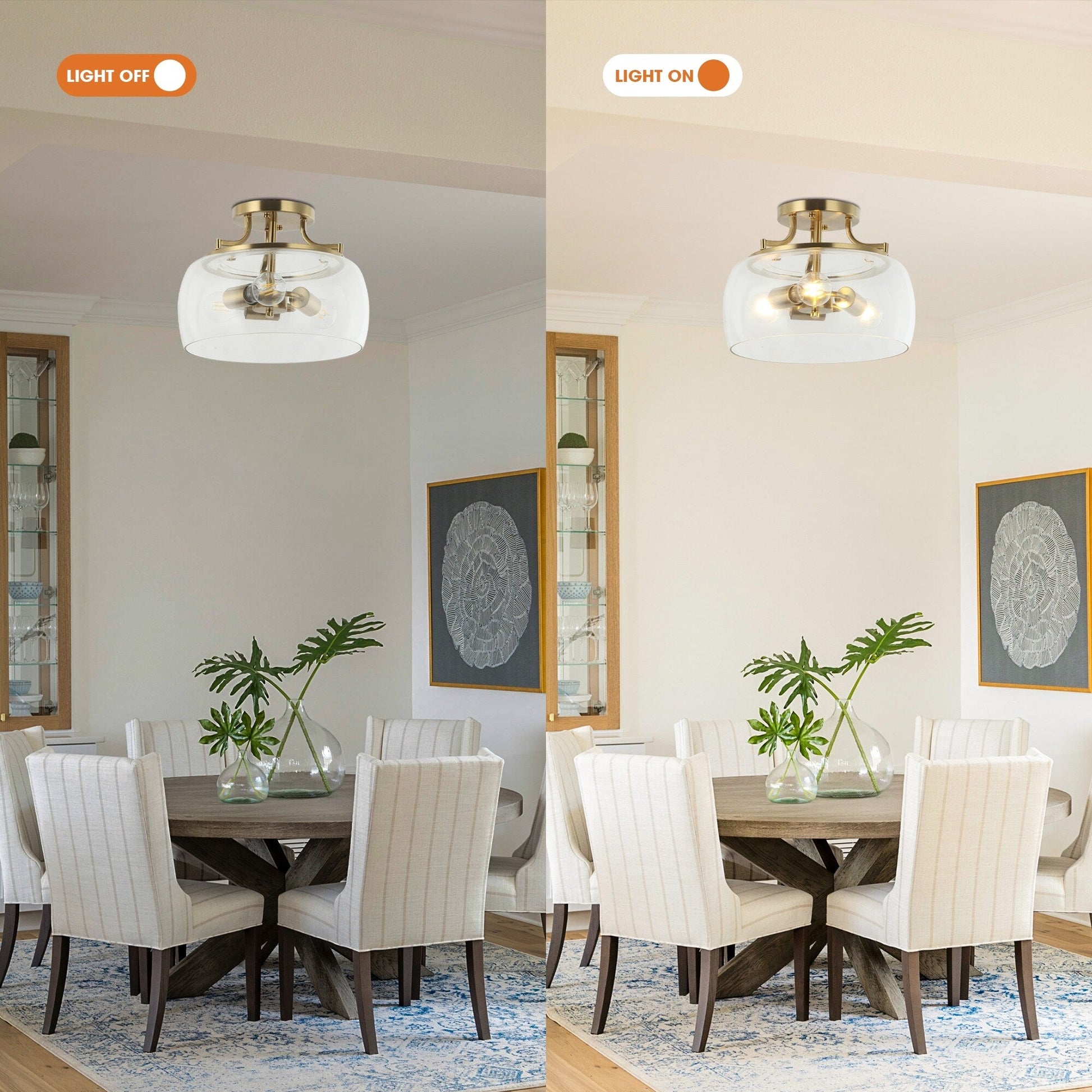 Add a modern vintage flair to your home decor with this ceiling light. This semi-flush mount design offers a modern interpretation of a classic urban-industrial style. It features a classy brushed gold finish and a prominent round clear glass shade. Inspired by schoolhouse and industrial lighting styles ideal for farmhouse or kitchen lighting. This light requires three Edison-style LED light bulbs (not included) that add a nostalgic glow.