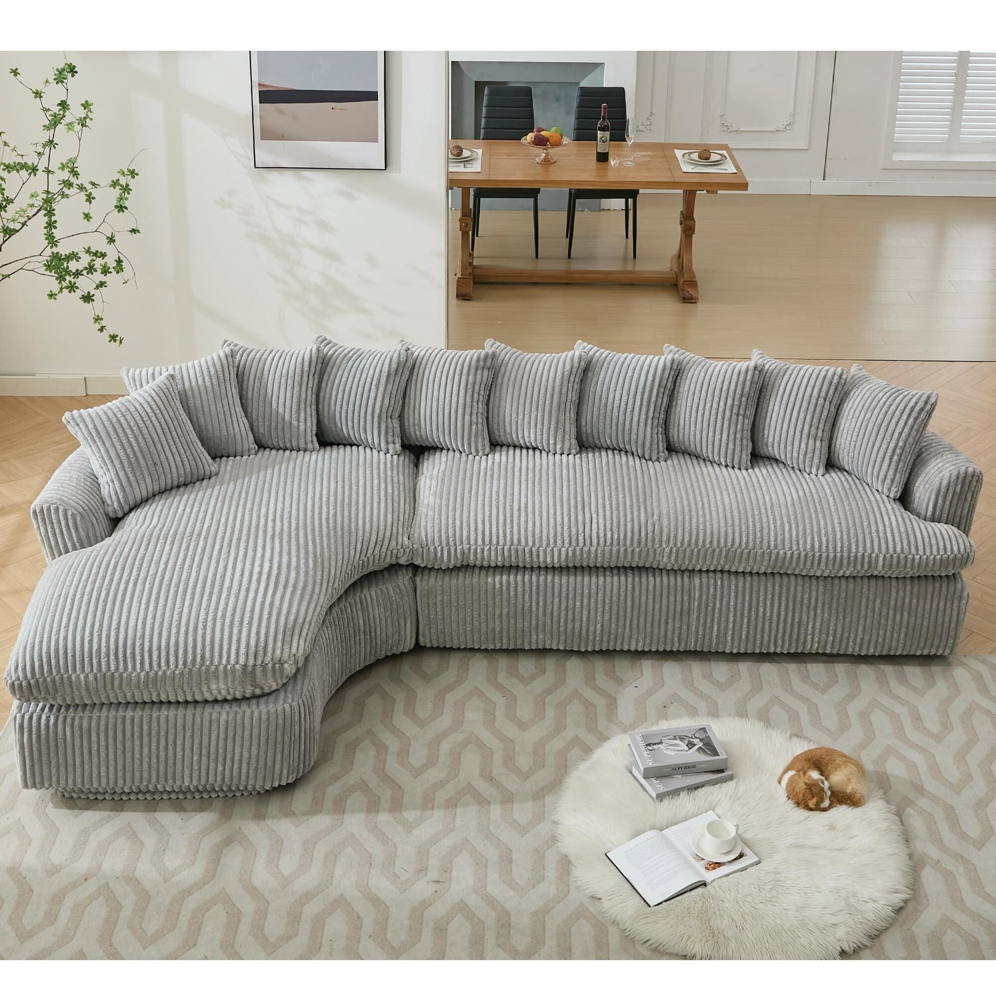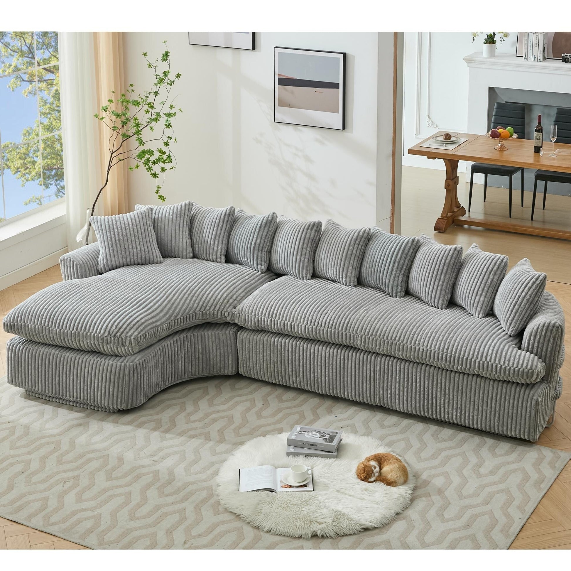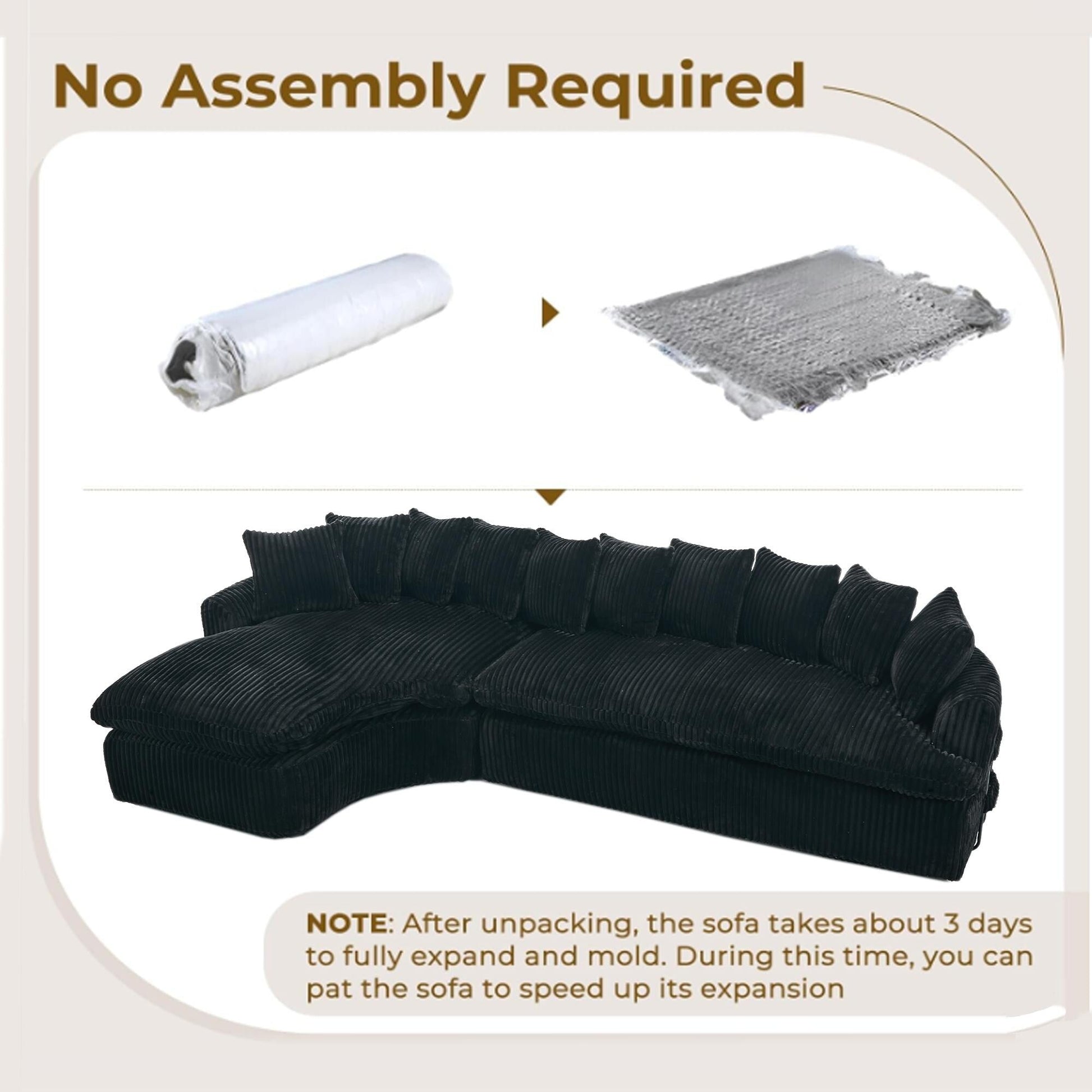 This L-shaped modular sectional sofa maximizes space with its stylish curved design. Upholstered in soft corduroy, it features high-resilience foam cushions reinforced with springs for ergonomic support. Delivered vacuum-packed for easy setup, it regains shape within 72 hours after unpacking.